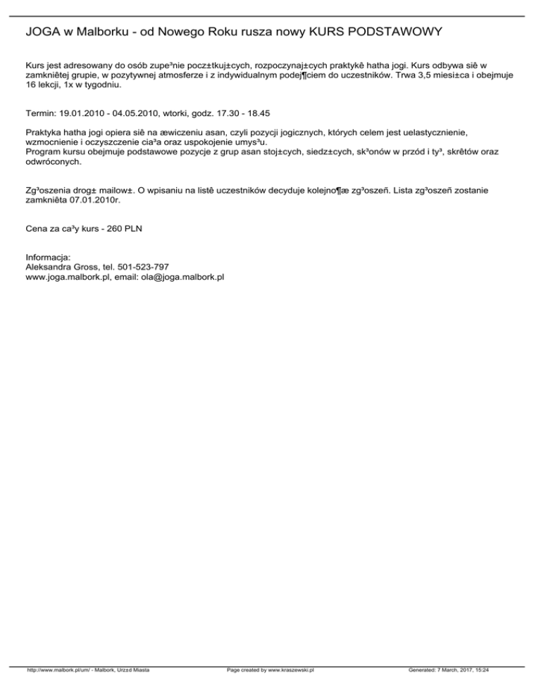JOGA w Malborku - od Nowego Roku rusza nowy KURS PODSTAWOWY Kurs jest adresowany do osób zupe³nie pocz±tkuj±cych, rozpoczynaj±cych praktykê hatha jogi. Kurs odbywa siê w zamkniêtej grupie, w pozytywnej atmosferze i z indywidualnym podej¶ciem do uczestników. Trwa 3,5 miesi±ca i obejmuje 16 lekcji, 1x w tygodniu. Termin: 19.01.2010 - 04.05.2010, wtorki, godz. 17.30 - 18.45 Praktyka hatha jogi opiera siê na æwiczeniu asan, czyli pozycji jogicznych, których celem jest uelastycznienie, wzmocnienie i oczyszczenie cia³a oraz uspokojenie umys³u. Program kursu obejmuje podstawowe pozycje z grup asan stoj±cych, siedz±cych, sk³onów w przód i ty³, skrêtów oraz odwróconych. Zg³oszenia drog± mailow±. O wpisaniu na listê uczestników decyduje kolejno¶æ zg³oszeñ. Lista zg³oszeñ zostanie zamkniêta 07.01.2010r. Cena za ca³y kurs - 260 PLN Informacja: Aleksandra Gross, tel. 501-523-797 www.joga.malbork.pl, email: [email protected] http://www.malbork.pl/um/ - Malbork, Urz±d Miasta Page created by www.kraszewski.pl Generated: 7 March, 2017, 15:24