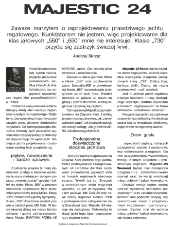 MAJESTIC 24 Zawsze marzyłem o zaprojektowaniu prawdziwego jachtu regatowego. Kunktatorem nie jestem, więc projektowanie dla klas jałowych „560" i „650" mnie nie interesuje. Klasie „730" przyda się zastrzyk świeżej krwi. Andrzej Skrzat Przed kilkunastoma laty byłem twórcą projektu przepisów pomiarowych, według których do dnia dzisiejszego są rozgrywane najważniejsze regaty klas pozaolimpijskich w Polsce. Podział na klasy odzwierciedlał istniejący wtedy stan naszego żeglarstwa turystyczno-regatowego. Dzięki temu, bez specjalnych oporów został przyjęty przez aktywne środowisko żeglarskie. Od samego początku klarowne formuły tych przepisów wymuszały rozsądny postęp techniczny nie dopuszczając do wynaturzeń. Dzisiejsze jachty projektowane i budowane według tych przepisów są MOTORS, Jantar, Gin, wniosły wiele świeżości i urozmaicenia. Zakazanie startu jachtom Micro w klasie „560" oraz pozbawienie szans Sympathy-600 w powiększonej klasie „650" spowodowały praktycznie zanik tych klas. Ostatni dzwonek na pójście po rozum do głowy i powrót do źródeł, a trasy regatowe zapełnią się żaglami. Tak naprawdę Majestica zaprojektowałem dla Zbyszka Kani. Z wielką przyjemnością patrzyłem, jak „cieniował sobie żagle", jak dostrajał osprzęt, jak ćwiczył załogę. Jak gromił na AERO-24 osławionego MAGICA piękne, nowoczesne i bardzo sprawne. Ostróda Yacht przygotowała dla Zbyszka Kani prototyp tego jachtu. Pełen profesjonalizm zaangażowanych sił i środków dał Kani możliwość prowadzenia pięknych walk na trasach regatowych obecnego sezonu. Wyniki już są. Zbyszek w przepięknym stylu wygrywa wszystko, co jest do wygrania. Ma z kim walczyć. MK Cafe-24 oraz nowe bolidy regatowe Gemini 2000 z profesjonalnymi załogami nie dają Zbyszkowi rady. Majestic-24 okazuje się najszybszy. Potwierdza to drugi jacht tego typu rozpoczynający dopiero starty. Z założenia przepisy te miały stymulować postęp w kierunku wyrównania szans startującym załogom poprzez „monotypizację" sprzętu. l tak też się stało. Klasa „560" w pewnym momencie opanowana była przez międzynarodową klasę Micro. Klasę „620" zdominowały jachty Sympathy. Klasa „730" obsadzona została prawie w całości przez MK Cafe. W klasie otwartej dzieją się rzeczy bardzo ciekawe i godne zainteresowania. Aero, Magie, SANTANA, MOBIL-AS Profesjonalna, doświadczona stocznia jachtowa Archiwum magazynu Rejs http://kormoran.aplus.pl Majestic-24 Racer, tak brzmi pełna nazwa tego jachtu, spełnia wszystkie wymagania przepisów pomiarowych klasy „730". Cztery koje, kambuz, stolik. Ciasno, ale można przenocować i coś upichcić. Jest to jednak jacht regatowy z dużym kokpitem i masą niezbędnego osprzętu. Kadłub wykonano w formach negatywowych na bazie laminatów poliestrowo-szklanych. Poszycia tego jachtu są częściowo usztywnione przekładką. Konstrukcja oparta jest na wybudowie sklejkowej, dając wrażenie regatowej salonki. Znam gusta zagorzałych żeglarzy, lubiących pożeglować szybko i swobodnie, lecz niekoniecznie w regatach. Dla nich przygotowujemy wygodniejszą wersję, z innym kokpitem i przestronnym wnętrzem. Majestic-24 Weekend będzie miał zmniejszone ożaglowanie, zminimalizowany osprzęt oraz (w wersji wiodącej) miecz uchylny i balast wewnętrzny. Obydwie wersje będzie można uzbroić wymiennie osprzętem pokładowym oraz zabalastowaniem. Armator sam podejmie decyzję, czy zamontować maszt z ożaglowaniem regatowym, czy turystycznym. Będzie miał do wyboru miecz uchylny i balast wewnętrzny, lub balast szybrowy. RACER WEEKEND długość całkowita 7,28 m szerokość całkowita 2,48 m długość KLW 6,53 m szerokość KLW 1,77 m zanurzenie kadłuba do KLW 0,26 m zanurzenie z balastem do KLW 1,40 m wyporność kadłuba do KLW 1210 kg ciężar całkowity jachtu: z balastem wewn. (250 kg + miecz 70 kg) 850 kg z balastem zewn. (bulbkil 250 kg) 780 kg ożaglowanie: grot 20 m2 fok 10 m2 genaker 40 m2 długość całkowita 7,28 m szerokość całkowita 2,48 m długość KLW 6,84 m szerokość KLW 1,87 m zanurzenie z balastem do KLW 0,32/1,46 m zanurzenie z mieczem do KLW 0,32/1,35 m wyporność kadłuba do KLW 1680 kg ciężar całkowity jachtu: z balastem wewn. (250 kg + miecz 70 kg) 1200 kg z balastem zewn. (bulbkil 250 kg) 1130 kg ożaglowanie: grot 16 m2 fok 9 m2 spinaker 30 m2 Archiwum magazynu Rejs http://kormoran.aplus.pl