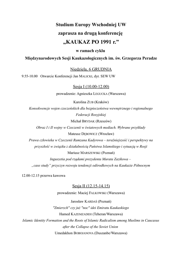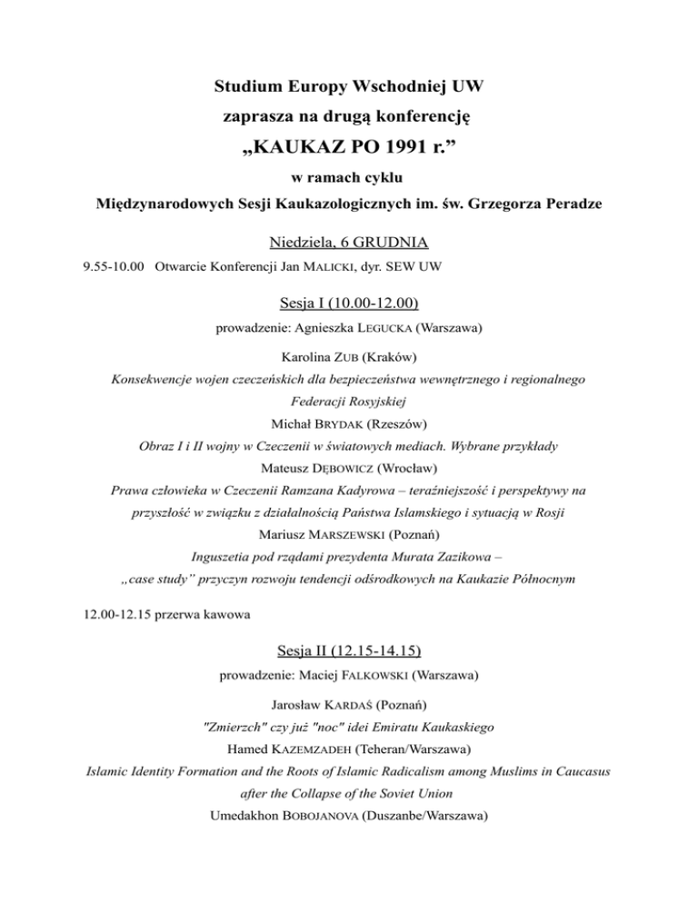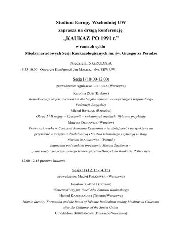Studium Europy Wschodniej UW zaprasza na drugą konferencję „KAUKAZ PO 1991 r.” w ramach cyklu Międzynarodowych Sesji Kaukazologicznych im. św. Grzegorza Peradze Niedziela, 6 GRUDNIA 9.55-10.00 Otwarcie Konferencji Jan MALICKI, dyr. SEW UW Sesja I (10.00-12.00) prowadzenie: Agnieszka LEGUCKA (Warszawa) Karolina ZUB (Kraków) Konsekwencje wojen czeczeńskich dla bezpieczeństwa wewnętrznego i regionalnego Federacji Rosyjskiej Michał BRYDAK (Rzeszów) Obraz I i II wojny w Czeczenii w światowych mediach. Wybrane przykłady Mateusz DĘBOWICZ (Wrocław) Prawa człowieka w Czeczenii Ramzana Kadyrowa – teraźniejszość i perspektywy na przyszłość w związku z działalnością Państwa Islamskiego i sytuacją w Rosji Mariusz MARSZEWSKI (Poznań) Inguszetia pod rządami prezydenta Murata Zazikowa – „case study” przyczyn rozwoju tendencji odśrodkowych na Kaukazie Północnym 12.00-12.15 przerwa kawowa Sesja II (12.15-14.15) prowadzenie: Maciej FALKOWSKI (Warszawa) Jarosław KARDAŚ (Poznań) "Zmierzch" czy już "noc" idei Emiratu Kaukaskiego Hamed KAZEMZADEH (Teheran/Warszawa) Islamic Identity Formation and the Roots of Islamic Radicalism among Muslims in Caucasus after the Collapse of the Soviet Union Umedakhon BOBOJANOVA (Duszanbe/Warszawa) Influence of the War in Syria and Activity of ISIS in the Countries of South and North Caucasus Mateusz KUBIAK (Warszawa) Ormianie wracają na Kaukaz? Republika Armenii wobec napływu uchodźców z Syrii Sesja III (14.15-15.30) prowadzenie: Adam BALCER (Warszawa) TBC Dariusz POPEK (Rzeszów) South Caucasus and Eastern Partnership Tamar LORTKIPHANIDZE (Tbilisi/Warszawa) Eastern Partnership – European Union’s Failure? dyskusja dot. Partnerstwa Wschodniego z udziałem specjalnych gości Iraklego TRIPOLSKIEGO – parlamentarzysty, przewodniczącego Komisji ds. Polityki Regionalnej i Samorządu Terytorialnego w Parlamencie Gruzji Vladimera PAPAVY – rektora Uniwersytetu w Tbilisi 15.30-16.45 przerwa 16.45 -17.15 Złożenie kwiatów pod tablicą na ścianie gmachu Instytutu Historycznego upamiętniającą pomordowanych w czasie II wojny światowej profesorów Uniwersytetu Warszawskiego, wśród nich św. Grzegorza PERADZE 17.15 - 19.15 Hamed KAZEMZADEH – wprowadzenie Stanisława BUDZISZ-CYSEWSKA (Gdańsk) Trauma wojny. Trauma wojny. Abchazja w filmach Giorgiego Owaszwilego Pokaz filmu – „The Other Bank” (Drugi brzeg), reż. Giorgi Owaszwili (2009) PONIEDZIAŁEK, 7 GRUDNIA Sesja IV (9.00-10.30) prowadzenie: Aleksandra GRYŹLAK (Warszawa) Elena MOSINYAN (Tbilisi/Warszawa) Development of Economics of Georgia after 1990s Julia KACZMAREK-KHUBNAIA (Poznań) Przemiany demograficzne w Gruzji Nino GOZALISHVILI (Tbilisi/Warszawa) Social Factors as the Obstacles on European Integration Way of Georgia - "Soviet Heritage" 10.30 – 10.45 przerwa kawowa Sesja V (10.45-12.45) prowadzenie: Tomasz KNOTHE (Warszawa) Krzysztof FEDOROWICZ (Poznań) Proces kształtowania się pozycji prawno-ustrojowej prezydenta Armenii - między konstytucją a praktyką polityczną Liudmyla DATSKOVA (Kraków) Armenia - New Steps towards Liberalization of the Political Regime in the Country Wiktor ROSS (Warszawa) Tezy o aktualnej sytuacji wewnętrznej i międzynarodowej Armenii Bartosz GOŁĄBEK (Kraków) Armenia dziś, Armenia jutro - intelektualna perspektywa fundacji "Noravank" 12.45 – 13.00 przerwa kawowa Sesja VI (13.00-14.30) prowadzenie: Wiktor ROSS (Warszawa) Renata KRÓL-MAZUR (Kraków) Rola religii w Armenii i jej wpływ na stosunki międzynarodowe Jakub OSIECKI (Kraków) Rola Apostolskiego Kościoła Ormiańskiego w przemianach politycznych roku 1991. Dyskurs historyczny (oficjalny) a pamięć zbiorowa Joanna DZIUBA-WIŚNIEWSKA (Warszawa) Zaangażowanie Katolikosa Wszystkich Ormian w debatę publiczną w Armenii 14.30 – 16.00 przerwa Sesja VII (16.00-17.30) prowadzenie: Wojciech GÓRECKI (Warszawa) TBC Anna PAJĄK (Kraków) Zakaukaskie parapaństwa - efekt silnie rozwiniętych tożsamości narodowych, konfliktów etnicznych czy rosyjskiej polityki? Tomasz GRZYWACZEWSKI (Łódź) Od Doniecka po Cchinwali. Secesja w prawie międzynarodowym a akt agresji Bohdan NOVAK (Ostróg/Warszawa) Po dwóch stronach konfliktu: Kaukazczycy na wojnie w Donbasie 17.30-17.45 kawa Sesja VIII (17.45-19.15) prowadzenie: David KOLBAIA (Warszawa) Violeta TYMUL (Warszawa) Wpływy rosyjskie na Kaukazie Południowym po 1991 roku Dimitri AVALIANI (Tbilisi/Warszawa) Russian Propaganda and its "Soft Power" in Georgia Marta BARNYCH (Lwów/Warszawa) Koncepcja aktywnego zapominania na przykładzie Gruzji i Ukrainy 19.15 Zamknięcie Konferencji, David KOLBAIA, Szef Seminarium Kaukaskiego SEW UW Patronat medialny: