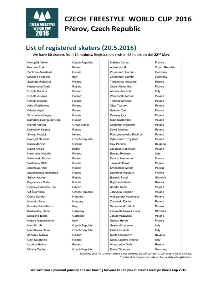 CZECH FREESTYLE WORLD CUP 2016 Přerov, Czech Republic List of registered skaters (20.5.2016) We have 80 skaters from 14 nations. Registration ends in 48 hours on the 22nd May! Konupčík Viktor Czech Republic Maëliss Conan France Koszela Eryk Poland Adam Indrák Czech Republic Zenkova Anastasia Russia Zourmand, Hamun Germany Morrone Federico Italy Zourmand, Ramtin Germany Szałyga Michalina Poland Timchenko Alexandr Russia Kuznetsova Daria Russia Claris Alexandre France Czapla Paulina Poland Alessandro Cola Italy Czapla Justyna Poland Wieczorek Tomek Poland Czapla Ewelina Poland Tomasz Mroczek Poland Ania Wojtkiewicz Poland Olga Twardy Poland Oliwier depta Poland Granjon Zoé France Timchenko Sergey Russia Zelazny Igor Poland Bamatter-Rodriguez Olga Russia Maja Kozłowska Poland Kieran Kintrea Great Britain Kasprzak Wojciech Poland Dubinchik Ksenia Russia Kamil Motyka Poland Sinead Howick Ireland Pierzchanowska Paulina Poland Premysl Navratil Czech Republic Zyborowicz Krzysztof Poland Boiko Maryna Ukraine Iliev Pencho Bulgaria Diego Araujo Brasil Giedziun Sebastian Poland Hartmanis Klaudia Poland Rosato Roberto Italy Sulinowski Michał Poland Fantuz Alexandre France Velikanov Gleb Russia Jaworski Dawid Poland Smirnova Anna Russia Smosarski Wiktor Polska Zapuskalova Nadezhda Russia Dubernet Mallaury France Shitov Andrey Russia Brezník Pavel Slovakia Bogdanova Sofia Russia Krykova Natalia Russia Cochey-Cahuzac Eva France Knodel Kamil Poland Vít Škornička Czech Republic Jarzynka Szymon Poland Duma Sandor Hungary Aleksandra Kozłowska Poland Horvath Anna Hungary Żukowski Daniel Poland Rosato Gian Marco Italy Szczurowski Jakub Polska Koslowsky, René Germany Lacko-Bartosova Lucia Slovakia Mokeeva Elena Germany Jakub Mączyński Poland Notaro Massimiliano Italy Guillou Hervé France Navrátil Jiří Czech Republic Guslandi Lorenzo Italy Navrátilová Hana Czech Republic Ilaria Guslandi Italy Jeziorek Marika Poland Sveta Stepanova Belarus Gzyl Katarzyna Poland Degli Agostini Valerio Italy Labriga Halina Poland Vinogradov Gleb Russia Miketa Ondřej Czech Republic Eilers Thorsten Germany Switching your first and last name is not an issue, we will correct it according to WSSA ranking. The list of participants is ordered by the date of registration. We wish you a pleasant journey and are looking forward to see you at Czech Freestyle World Cup 2016!