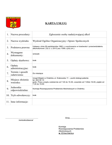 KARTA USŁUG 1. Nazwa procedury: Zgłoszenie osoby nadużywającej alkol 2. Nazwa wydziału: Wydział Ogólno Organizacyjny i Spraw Społecznych 3. Podstawa prawna: Ustawa z dnia 26 października 1982 r o wychowaniu w trzeźwości i przeciwdziałaniu alkoholizmowi ( Dz.U. z 2012 poz.1356 z póź.zm.) 4. Wymagane dokumenty: 5. Opłaty skarbowe: wniosek brak 6. Opłaty administracyjne: brak 7. Termin i sposób załatwienia: Do miesiąca Miejsce złożenia 8. wniosku: 9. Jednostka odpowiedzialna: 10. Tryb odwoławczy: Urząd Miejski w Chełmku ul. Krakowska 11 – punkt obsługi petenta tel. 844 90 10 godz. Pracy urzędu codziennie od 7.30 do 15.30, czwartek od 7.30do 16.00, piątek od 7.30 do 15.00 Komisja Rozwiązywania Problemów Alkoholowych w Chełmku brak 11. Inne informacje: ......................................................... /wnioskodawca/ Dnia............................... Komisja Rozwiązywania Problemów Alkoholowych w Chełmku W n o s z ę o wszczęcie postępowania w sprawie nadużywania alkoholu przez: .. ............................................................................ur. ........................................................... zam. ...... ............................................................................................................................. zmierzające do objęcia leczeniem odwykowym wymienionego, w trybie określonym przepisami w/w ustawy. UZASADNIENIE: ... ............................................................................................................................................ ................................................................................................................................................ ................................................................................................................................................ ................................................................................................................................................ ............................................................................................................................................... ................................................................................................................................................ ................................................. /podpis wnioskodawcy/