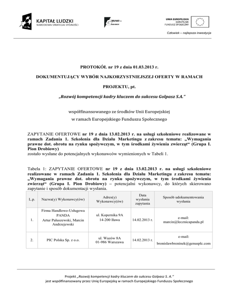 Człowiek – najlepsza inwestycja PROTOKÓŁ nr 19 z dnia 01.03.2013 r. DOKUMENTUJĄCY WYBÓR NAJKORZYSTNIEJSZEJ OFERTY W RAMACH PROJEKTU, pt. „Rozwój kompetencji kadry kluczem do sukcesu Golpasz S.A.” współfinansowanego ze środków Unii Europejskiej w ramach Europejskiego Funduszu Społecznego ZAPYTANIE OFERTOWE nr 19 z dnia 13.02.2013 r. na usługi szkoleniowe realizowane w ramach Zadania 1. Szkolenia dla Działu Marketingu z zakresu tematu: „Wymagania prawne dot. obrotu na rynku spożywczym, w tym środkami żywienia zwierząt“ (Grupa I. Pion Drobiowy) zostało wysłane do potencjalnych wykonawców wymienionych w Tabeli 1. Tabela 1: ZAPYTANIE OFERTOWE nr 19 z dnia 13.02.2013 r. na usługi szkoleniowe realizowane w ramach Zadania 1. Szkolenia dla Działu Marketingu z zakresu tematu: „Wymagania prawne dot. obrotu na rynku spożywczym, w tym środkami żywienia zwierząt“ (Grupa I. Pion Drobiowy) – potencjalni wykonawcy, do których skierowano zapytanie i sposób dokumentacji wysłania. L.p. 1. 2. Nazwa(y) Wykonawcy(ów) Adres(y) Wykonawcy(ów) Firma Handlowo-Usługowa PANDA Artur Paluszewski, Marcin Andrzejewski ul. Kopernika 9A 14-200 Iława PIC Polska Sp. z o.o. ul. Wazów 8A 01-986 Warszawa Data wysłania zapytania Sposób udokumentowania wysłania 14.02.2013 r. e-mail: [email protected] e-mail: 14.02.2013 r. [email protected] Projekt „Rozwój kompetencji kadry kluczem do sukcesu Golpasz S. A.“ jest współfinansowany przez Unię Europejską w ramach Europejskiego Funduszu Społecznego Człowiek – najlepsza inwestycja ETOS Czesłąw Szymandera ul. Katowicka 83c/105 3. 61-131 Poznań. 4. Faber Consulting sp. z o.o. 5. TNOiK „Dom Organizatora w Toruniu e-mail: 14.02.2013 r. [email protected] ul. Rakowiecka 39A, lok. e-mail 14 14.02.2013 r. [email protected] 02-521 Warszawa Al. 500-lecia 31/ul. Czerwona Droga 8 e-mail: 14.02.2013 r. [email protected] 87-100 Toruń W odpowiedzi na zaproszenie do złożenia oferty w postępowaniu prowadzonym w formie ZAPYTANIA nr 19 z dnia 13.02.2013 r. na usługi szkoleniowe realizowane w ramach Zadania 1. Szkolenia dla Działu Marketingu z zakresu tematu: „Wymagania prawne dot. obrotu na rynku spożywczym, w tym środkami żywienia zwierząt“ (Grupa I. Pion Drobiowy) złożono następujące niepodlegające odrzuceniu oferty wymienione w Tabeli 2. Tabela 2: Wykaz ważnych ofert uzyskanych w odpowiedzi na ZAPYTANIE OFERTOWE nr 19 z dnia 13.02.2013 r. na usługi szkoleniowe realizowane w ramach Zadania 1. Szkolenia dla Działu Marketingu z zakresu tematu: „Wymagania prawne dot. obrotu na rynku spożywczym, w tym środkami żywienia zwierząt“ (Grupa I. Pion Drobiowy) Nazwa(y) Wykonawcy(ów) Numer oferty Firma Handlowo-Usługowa PANDA Artur Paluszewski, Marcin Andrzejewski 1. Adres(y) Wykonawcy(ów) Liczba punktów Data wypływu oferty 100 p. 26.02.2013 r. ul. Kopernika 9A 14-200 Iława W wyniku postępowania wybrano ofertę nr 1, która spełnia wszystkie wymagania Zamawiającego określone w zapytaniu ofertowym oraz posiada najwyższą liczbę punktów. Zapytanie ofertowe oraz informacja o rozstrzygnięciu zostały upublicznione (opublikowane) poprzez zamieszczenie w siedzibie Zamawiającego oraz na stronie internetowej [www.golpasz.pl]. Zawiadomienie o rozstrzygnięciu przesłano także do wszystkich Oferentów drogą mailową. Załączniki: 1. Potwierdzenie udokumentowania publikacji zapytania na stronie internetowej 2. Potwierdzenia wysłania zapytania ofertowego do potencjalnych Wykonawców 3. Złożone oferty wraz z zawartymi w nich oświadczeniami Wykonawców o braku powiązań Projekt „Rozwój kompetencji kadry kluczem do sukcesu Golpasz S. A.“ jest współfinansowany przez Unię Europejską w ramach Europejskiego Funduszu Społecznego Człowiek – najlepsza inwestycja 4. Oświadczenie o braku powiązań z Oferentami, którzy złożyli oferty 5. Potwierdzenie zawiadomienia Oferentów o rozstrzygnięciu zapytania i upublicznienia informacji Podpis Koordynatora Projektu –osoby sporządzającej protokół: Aranka Ignasiak-Szulc Podpisy osób umocowanych do reprezentacji Golpasz S. A.: Jolanta Szypnicka-Wołowiec Grażyna Cichuta Golub-Dobrzyń, 01.03.2013 r. Projekt „Rozwój kompetencji kadry kluczem do sukcesu Golpasz S. A.“ jest współfinansowany przez Unię Europejską w ramach Europejskiego Funduszu Społecznego