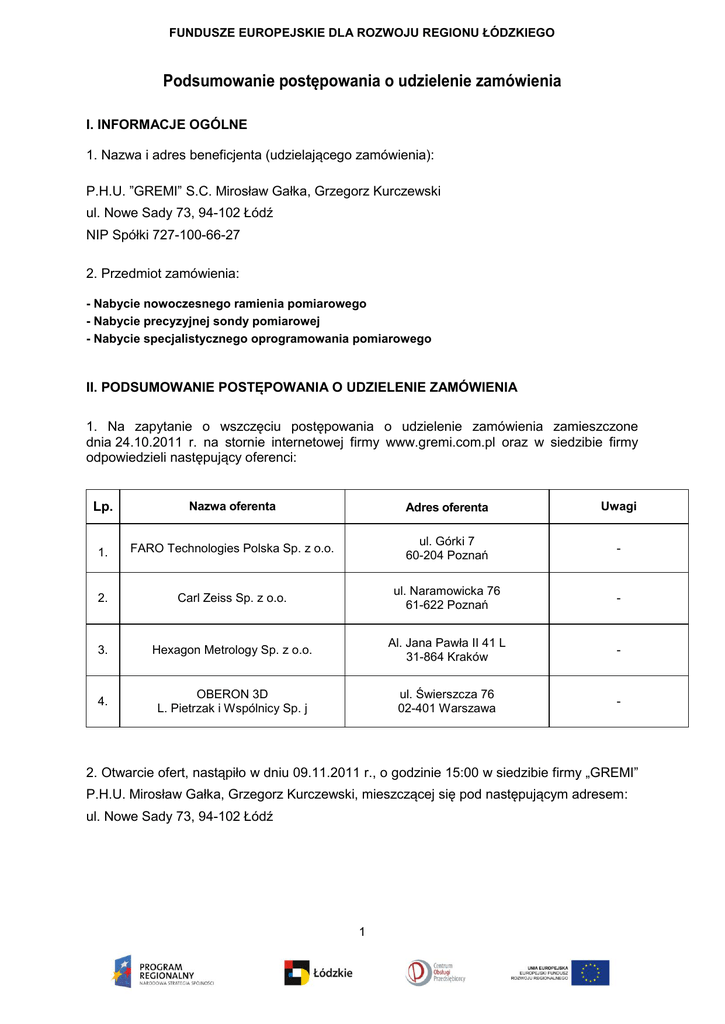 FUNDUSZE EUROPEJSKIE DLA ROZWOJU REGIONU ŁÓDZKIEGO Podsumowanie postępowania o udzielenie zamówienia I. INFORMACJE OGÓLNE 1. Nazwa i adres beneficjenta (udzielającego zamówienia): P.H.U. ”GREMI” S.C. Mirosław Gałka, Grzegorz Kurczewski ul. Nowe Sady 73, 94-102 Łódź NIP Spółki 727-100-66-27 2. Przedmiot zamówienia: - Nabycie nowoczesnego ramienia pomiarowego - Nabycie precyzyjnej sondy pomiarowej - Nabycie specjalistycznego oprogramowania pomiarowego II. PODSUMOWANIE POSTĘPOWANIA O UDZIELENIE ZAMÓWIENIA 1. Na zapytanie o wszczęciu postępowania o udzielenie zamówienia zamieszczone dnia 24.10.2011 r. na stornie internetowej firmy www.gremi.com.pl oraz w siedzibie firmy odpowiedzieli następujący oferenci: Lp. Nazwa oferenta Adres oferenta Uwagi 1. FARO Technologies Polska Sp. z o.o. ul. Górki 7 60-204 Poznań - 2. Carl Zeiss Sp. z o.o. ul. Naramowicka 76 61-622 Poznań - 3. Hexagon Metrology Sp. z o.o. Al. Jana Pawła II 41 L 31-864 Kraków - 4. OBERON 3D L. Pietrzak i Wspólnicy Sp. j ul. Świerszcza 76 02-401 Warszawa - 2. Otwarcie ofert, nastąpiło w dniu 09.11.2011 r., o godzinie 15:00 w siedzibie firmy „GREMI” P.H.U. Mirosław Gałka, Grzegorz Kurczewski, mieszczącej się pod następującym adresem: ul. Nowe Sady 73, 94-102 Łódź 1 FUNDUSZE EUROPEJSKIE DLA ROZWOJU REGIONU ŁÓDZKIEGO 3. Streszczenie oceny i porównania ofert: Ilość Ilość Czas punktów Okres punktów realizacji w gwarancji w zamówienia kryterium (miesiące) kryterium (dni czasu gwarancji robocze) realizacji Oprogramowanie w polskiej wersji językowej (TAK/NIE) Ilość punktów w kryterium oprogr. Suma otrzymanych punktów Cena (netto) Ilość punktów w kryterium ceny 3 4 5 6 7 8 9 10 11 FARO Technologies Polska Sp. z o.o. 194.000,00 PLN 1. ul. Górki 7 60-204 Poznań 55,28 36 10,00 14 5,00 TAK 20,00 90,28 Carl Zeiss Sp. z o.o. 178.966,13 PLN* ul. Naramowicka 76 61-622 Poznań 40.900,00 EUR 59,93 24 6,67 7 10,00 TAK 20,00 96,60 Hexagon Metrology 178.747,35 PLN* Sp. z o.o. 3. Al. Jana Pawła II 41 L 40.850,00 EUR 31-864 Kraków 60,00 24 6,67 28 2,50 TAK 20,00 89,17 42,47 24 6,67 20 3,50 TAK 20,00 72,64 Lp. Nazwa i adres oferenta 1 2. 4. 2 OBERON 3D L. Pietrzak i Wspólnicy Sp. j ul. Świerszcza 76 02-401 Warszawa 252.251,65 PLN* 57.710,00 EUR *) wartości ofert w walucie obcej zostały przeliczone do porównania na PLN według średniego kursu NPB (Tabela nr 217/A/NBP/2011 z dnia 09.11.2011) z dnia otwarcia kopert – zgodnie z informacją podaną w Ogłoszeniu o Zamówieniu. Jest to wartość: 1 EUR = 4,3757 PLN 2 FUNDUSZE EUROPEJSKIE DLA ROZWOJU REGIONU ŁÓDZKIEGO 4. W wyniku oceny ofert za najkorzystniejszą ofertę została uznana: Oferta firmy Carl Zeiss Sp. z o.o. z siedzibą w Poznaniu pod następującym adresem: ul. Naramowicka 76 61-622 Poznań 5.Uzasadnienie: Beneficjent – firma GREMI w odpowiedzi na omawiane ogłoszenie o zamówieniu otrzymała łącznie 4 oferty. Wszystkie otrzymane przez Beneficjenta oferty zostały złożone w terminie oraz są prawidłowe pod względem merytorycznym (zawierają informacje, które były wymagane w Ogłoszeniu o zamówieniu oraz przedstawiają urządzenia i oprogramowanie spełniające parametry wymagane przez Beneficjenta), co umożliwiło ich porównanie zgodnie z kryteriami wyboru najkorzystniejszej oferty umieszczonymi w Ogłoszeniu o zamówieniu. Zgodnie z ustalonymi kryterium wyboru najkorzystniejszej oferty firma Carl Zeiss Sp. z o.o. zaproponowała najkorzystniejszą ofertę na urządzenia i oprogramowanie stanowiące przedmiot zamówienia. Propozycję firmy Carl Zeiss Sp. z o.o. uznaje się za merytorycznie poprawną oraz złożoną w terminie określonym w ogłoszeniu o zamówieniu, co w połączeniu z przedstawionymi warunkami handlowymi dającymi najwyższą ilość punktów powoduje uznanie tej oferty za najkorzystniejszą. Łódź, dnia 15.11.2011 r. 3