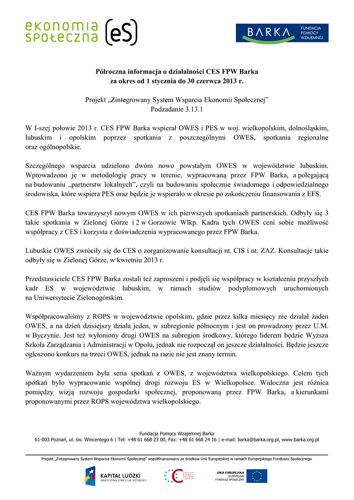 Półroczna informacja o działalności CES FPW Barka za okres od 1 stycznia do 30 czerwca 2013 r. Projekt „Zintegrowany System Wsparcia Ekonomii Społecznej” Podzadanie 3.13.1 W I-szej połowie 2013 r. CES FPW Barka wspierał OWES i PES w woj. wielkopolskim, dolnośląskim, lubuskim i opolskim poprzez spotkania z poszczególnymi OWES, spotkania regionalne oraz ogólnopolskie. Szczególnego wsparcia udzielono dwóm nowo powstałym OWES w województwie lubuskim. Wprowadzono je w metodologię pracy w terenie, wypracowaną przez FPW Barka, a polegającą na budowaniu „partnerstw lokalnych”, czyli na budowaniu społecznie świadomego i odpowiedzialnego środowiska, które wspiera PES oraz będzie je wspierało w okresie po zakończeniu finansowania z EFS. CES FPW Barka towarzyszył nowym OWES w ich pierwszych spotkaniach partnerskich. Odbyły się 3 takie spotkania w Zielonej Górze i 2 w Gorzowie Wlkp. Kadra tych OWES ceni sobie możliwość współpracy z CES i korzysta z doświadczenia wypracowanego przez FPW Barka. Lubuskie OWES zwróciły się do CES o zorganizowanie konsultacji nt. CIS i nt. ZAZ. Konsultacje takie odbyły się w Zielonej Górze, w kwietniu 2013 r. Przedstawiciele CES FPW Barka zostali też zaproszeni i podjęli się współpracy w kształceniu przyszłych kadr ES w województwie lubuskim, w ramach studiów podyplomowych uruchomionych na Uniwersytecie Zielonogórskim. Współpracowaliśmy z ROPS w województwie opolskim, gdzie przez kilka miesięcy nie działał żaden OWES, a na dzień dzisiejszy działa jeden, w subregionie północnym i jest on prowadzony przez U.M. w Byczynie. Jest też wyłoniony drugi OWES na subregion środkowy, którego liderem będzie Wyższa Szkoła Zarządzania i Administracji w Opolu, jednak nie rozpoczął on jeszcze działalności. Będzie jeszcze ogłoszono konkurs na trzeci OWES, jednak na razie nie jest znany termin. Ważnym wydarzeniem była seria spotkań z OWES, z województwa wielkopolskiego. Celem tych spotkań było wypracowanie wspólnej drogi rozwoju ES w Wielkopolsce. Widoczna jest różnica pomiędzy wizją rozwoju gospodarki społecznej, proponowaną przez FPW Barka, a kierunkami proponowanymi przez ROPS województwa wielkopolskiego. Fundacja Pomocy Wzajemnej Barka 61-003 Poznań, ul. św. Wincentego 6 | Tel: +48 61 668 23 00, Fax: +48 61 668 24 16 | e-mail: [email protected], www.barka.org.pl CES FPW Barka reprezentował interes środowiska poprzez kształtowanie społecznie odpowiedzialnych środowisk lokalnych. Przedstawiciele CES uczestniczyli w wielu spotkaniach z różnymi grupami, zarówno lokalnymi jak i ogólnopolskimi po to, aby jak najwięcej osób było świadomych, czym jest zysk społeczny i wspierało rozwój ekonomii społecznej. CES FPW Barka zorganizował konsultacje nt. pomocy publicznej i pomocy de minimis, które odbyły się we Wrocławiu i uczestniczyli w nich przedstawiciele OWES z woj. dolnośląskiego. Kadra wszystkich OWES z terenu działania CES FPW Barka została zaproszona na wizyty studyjne zagraniczne i krajowe. Na przełomie lutego i marca odbyła się wizyta studyjna do PES w Liverpool, w Wielkiej Brytanii. Uczestniczyło w niej 14 osób i byli to przedstawiciele OWES i instytucji związanych z ES, z Wielkopolski i z województwa opolskiego. Zorganizowano także wizytę studyjną do PES w województwie wielkopolskim. Uczestniczyło w niej 20 osób, przedstawicieli OWES oraz ROPS i OHP z województwa lubuskiego. CES zorganizował staże dla części kadry przyszłych CIS w Kędzierzynie-Koźlu oraz w Krobi. U.M. w Żarach wygrał konkurs wygrał projekt tworzenia spółdzielni socjalnych i poprosił CES FPW Barka, o doradztwo w sprawie integracji społeczno–zawodowej, a zwłaszcza praktycznych aspektów przygotowania przyszłych spółdzielców do ich pracy. W wyniku kontaktów telefonicznych i spotkania zmodyfikowano początkową wersję projektu, zwiększając liczbę godzin integracyjno-formacyjnych i liczbę godzin na staże, w okresie poprzedzającym założenie spółdzielni socjalnej. CES Fundacji Barka udzielił także informacji nt. CIS i metodologii tworzenia partnerstw lokalnych oraz zaprosił na wizyty studyjne. 21 osób, skorzystało z tej propozycji. CES FPW Barka zachęcił przedstawicieli U.M. Żary do współpracy z OWES w Zielonej Górze i współpraca ta została nawiązana. Przedstawiciele CES FPW Barka spotkali się także z przedstawicielami Żarskiej Spółdzielni Socjalnej, która de facto pełni rolę OWES. Świadczy ona usługi odpłatnie, ponieważ nie korzysta z dotacji. Spółdzielnia ta zwróciła się do CES o konsultacje w sprawie innowacyjnego systemu działania PES, w kontekście nowej ustawy śmieciowej, który chcieliby wprowadzić w życie na terenie miasta Żary. W okresie sprawozdawczym, CES FPW Barka zorganizował spotkanie przedstawicieli OWES i RO EFS z woj. wielkopolskiego. Zaowocowało ono współpracą pomiędzy w/w podmiotami w subregionach. CES FPW Barka uczestniczył w VII Ogólnopolskim Spotkaniu Sieciującym OWES, które odbyło się w dniach 9-10 maja 2013 r. w Warszawie. Wydarzenie to zgromadziło przedstawicieli OWES i OWSS (Ośrodki Wsparcia Spółdzielni Socjalnych) oraz ROPS z całej Polski. Fundacja Pomocy Wzajemnej Barka 61-003 Poznań, ul. św. Wincentego 6 | Tel: +48 61 668 23 00, Fax: +48 61 668 24 16 | e-mail: [email protected], www.barka.org.pl