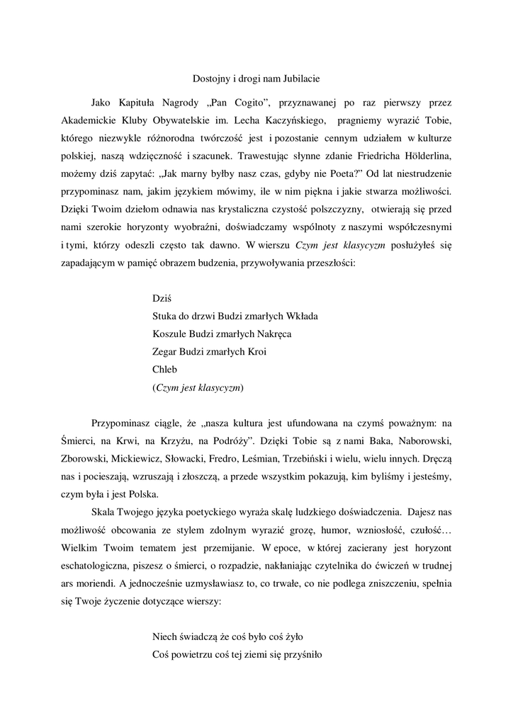 Dostojny i drogi nam Jubilacie Jako Kapituła Nagrody „Pan Cogito”, przyznawanej po raz pierwszy przez Akademickie Kluby Obywatelskie im. Lecha Kaczyńskiego, pragniemy wyrazić Tobie, którego niezwykle różnorodna twórczość jest i pozostanie cennym udziałem w kulturze polskiej, naszą wdzięczność i szacunek. Trawestując słynne zdanie Friedricha Hölderlina, możemy dziś zapytać: „Jak marny byłby nasz czas, gdyby nie Poeta?” Od lat niestrudzenie przypominasz nam, jakim językiem mówimy, ile w nim piękna i jakie stwarza możliwości. Dzięki Twoim dziełom odnawia nas krystaliczna czystość polszczyzny, otwierają się przed nami szerokie horyzonty wyobraźni, doświadczamy wspólnoty z naszymi współczesnymi i tymi, którzy odeszli często tak dawno. W wierszu Czym jest klasycyzm posłużyłeś się zapadającym w pamięć obrazem budzenia, przywoływania przeszłości: Dziś Stuka do drzwi Budzi zmarłych Wkłada Koszule Budzi zmarłych Nakręca Zegar Budzi zmarłych Kroi Chleb (Czym jest klasycyzm) Przypominasz ciągle, że „nasza kultura jest ufundowana na czymś poważnym: na Śmierci, na Krwi, na Krzyżu, na Podróży”. Dzięki Tobie są z nami Baka, Naborowski, Zborowski, Mickiewicz, Słowacki, Fredro, Leśmian, Trzebiński i wielu, wielu innych. Dręczą nas i pocieszają, wzruszają i złoszczą, a przede wszystkim pokazują, kim byliśmy i jesteśmy, czym była i jest Polska. Skala Twojego języka poetyckiego wyraża skalę ludzkiego doświadczenia. Dajesz nas możliwość obcowania ze stylem zdolnym wyrazić grozę, humor, wzniosłość, czułość… Wielkim Twoim tematem jest przemijanie. W epoce, w której zacierany jest horyzont eschatologiczna, piszesz o śmierci, o rozpadzie, nakłaniając czytelnika do ćwiczeń w trudnej ars moriendi. A jednocześnie uzmysławiasz to, co trwałe, co nie podlega zniszczeniu, spełnia się Twoje życzenie dotyczące wierszy: Niech świadczą że coś było coś żyło Coś powietrzu coś tej ziemi się przyśniło Kiedyś gorzko i żartobliwie sportretowałeś poetę, który… …Nie prosi o pieniądze no to niech gryzmoli Kiedy go lewa ręka prawe serce boli (…) O sławę wcale nie dba niech językiem miele W tym domu pełnym czaszek w pajęczym kościele Nie zabiegając o nagrody, zyskałeś tę najcenniejszą: jest nią wierność czytelników, świadomych, jak wiele im ofiarowałeś i przed czym ich ocaliłeś. Gdy mamy bowiem w pamięci Twoje słowa, łatwiej nam oprzeć się temu, co wulgarne, fałszywe, prostackie, koniunkturalne. Pokazujesz, jak Zbigniew Herbert, do którego twórczości nawiązujemy w nazwie naszej nagrody, że są chwile, kiedy trzeba stanowczo odmówić współpracy ornamentatorom i sztukatorom, usilnie maskującym prawdę. Potrafisz, gdy trzeba, rzucić ostre słowo, zmuszasz, byśmy spojrzeli „przez szczeliny Wielkiej Ściemy” i zdali sobie sprawę z podejmowanych współcześnie prób likwidacji polskości. Mówisz o potrzebie zawarcia sojuszu w obronie tego, co dla nas cenne, a swoją twórczością silnię tę konfederację spajasz. Gdy kiedyś charakteryzowałeś historią literatury, posłużyłeś się obrazem, który kojarzy się z miejscem naszego spotkania, Zamkiem w Kórniku, w którego murach chronione jedne z najcenniejszych kart zapisanych w naszym języku. Pisałeś, że „z rozsypanych i wciąż się rozsypujących fragmentów wznosi się budowlę, wysoki zamek literatury ojczystej. Ta budowla stoi w czasie teraźniejszym naszej pamięci”. Wznosisz ten gmach i opatrujesz wytrwale od wielu dziesięcioleci, nie po to jednak, byśmy się w nich skryli, znajdując azyl w martwej przestrzeni pamiątek, ale byśmy wciąż z tego miejsca czerpali wiedzę o nas samych, o naszych powinnościach, o naszej osobistej wolności i o Polsce. Wielki jest nasz dług wobec Ciebie, Poeto i Profesorze.