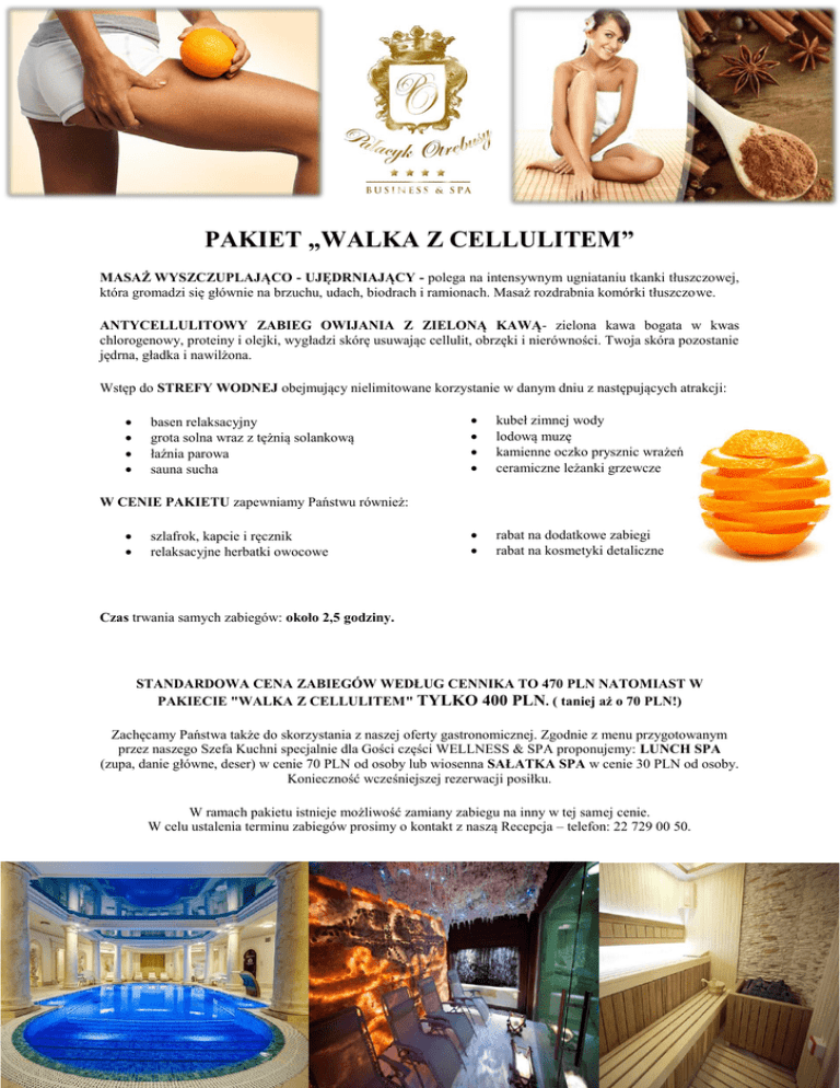 PAKIET „WALKA Z CELLULITEM” MASAŻ WYSZCZUPLAJĄCO - UJĘDRNIAJĄCY - polega na intensywnym ugniataniu tkanki tłuszczowej, która gromadzi się głównie na brzuchu, udach, biodrach i ramionach. Masaż rozdrabnia komórki tłuszczowe. ANTYCELLULITOWY ZABIEG OWIJANIA Z ZIELONĄ KAWĄ- zielona kawa bogata w kwas chlorogenowy, proteiny i olejki, wygładzi skórę usuwając cellulit, obrzęki i nierówności. Twoja skóra pozostanie jędrna, gładka i nawilżona. Wstęp do STREFY WODNEJ obejmujący nielimitowane korzystanie w danym dniu z następujących atrakcji: basen relaksacyjny grota solna wraz z tężnią solankową łaźnia parowa sauna sucha kubeł zimnej wody lodową muzę kamienne oczko prysznic wrażeń ceramiczne leżanki grzewcze rabat na dodatkowe zabiegi rabat na kosmetyki detaliczne W CENIE PAKIETU zapewniamy Państwu również: szlafrok, kapcie i ręcznik relaksacyjne herbatki owocowe Czas trwania samych zabiegów: około 2,5 godziny. STANDARDOWA CENA ZABIEGÓW WEDŁUG CENNIKA TO 470 PLN NATOMIAST W PAKIECIE "WALKA Z CELLULITEM" TYLKO 400 PLN. ( taniej aż o 70 PLN!) Zachęcamy Państwa także do skorzystania z naszej oferty gastronomicznej. Zgodnie z menu przygotowanym przez naszego Szefa Kuchni specjalnie dla Gości części WELLNESS & SPA proponujemy: LUNCH SPA (zupa, danie główne, deser) w cenie 70 PLN od osoby lub wiosenna SAŁATKA SPA w cenie 30 PLN od osoby. Konieczność wcześniejszej rezerwacji posiłku. W ramach pakietu istnieje możliwość zamiany zabiegu na inny w tej samej cenie. W celu ustalenia terminu zabiegów prosimy o kontakt z naszą Recepcja – telefon: 22 729 00 50.