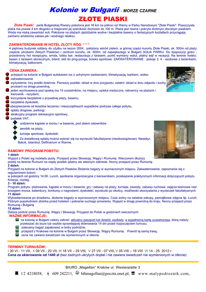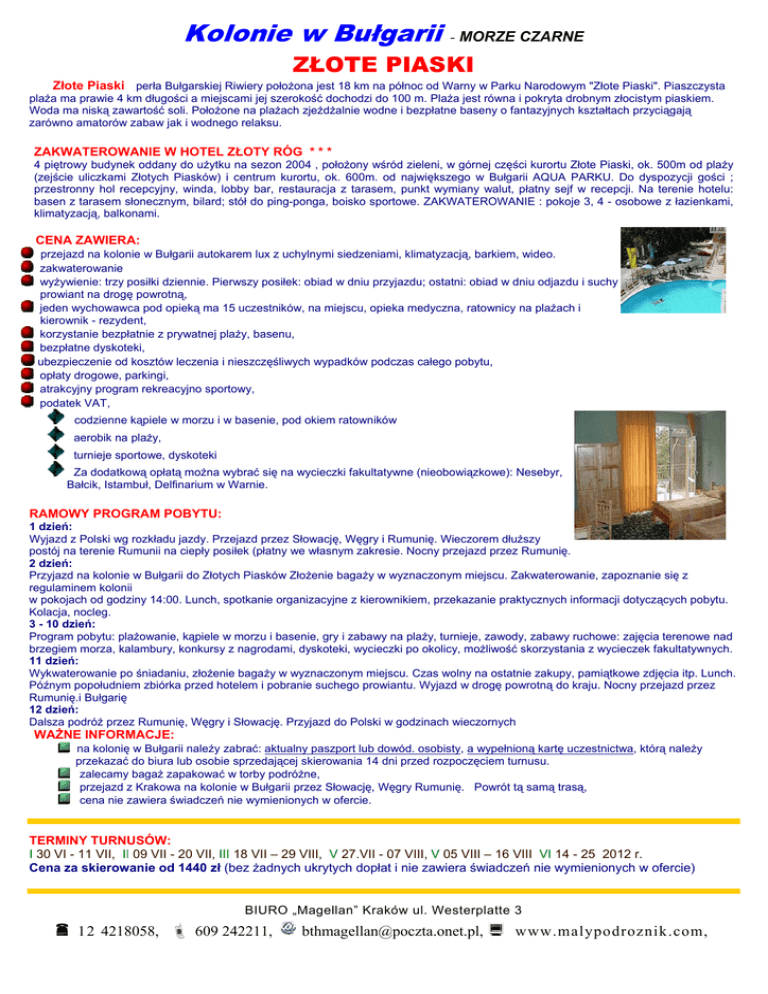 Kolonie w Bułgarii - MORZE CZARNE ZŁOTE PIASKI Złote Piaski - perła Bułgarskiej Riwiery położona jest 18 km na północ od Warny w Parku Narodowym "Złote Piaski". Piaszczysta plaża ma prawie 4 km długości a miejscami jej szerokość dochodzi do 100 m. Plaża jest równa i pokryta drobnym złocistym piaskiem. Woda ma niską zawartość soli. Położone na plażach zjeżdżalnie wodne i bezpłatne baseny o fantazyjnych kształtach przyciągają zarówno amatorów zabaw jak i wodnego relaksu. ZAKWATEROWANIE W HOTEL ZŁOTY RÓG * * * 4 piętrowy budynek oddany do użytku na sezon 2004 , położony wśród zieleni, w górnej części kurortu Złote Piaski, ok. 500m od plaży (zejście uliczkami Złotych Piasków) i centrum kurortu, ok. 600m. od największego w Bułgarii AQUA PARKU. Do dyspozycji gości ; przestronny hol recepcyjny, winda, lobby bar, restauracja z tarasem, punkt wymiany walut, płatny sejf w recepcji. Na terenie hotelu: basen z tarasem słonecznym, bilard; stół do ping-ponga, boisko sportowe. ZAKWATEROWANIE : pokoje 3, 4 - osobowe z łazienkami, klimatyzacją, balkonami. CENA ZAWIERA: przejazd na kolonie w Bułgarii autokarem lux z uchylnymi siedzeniami, klimatyzacją, barkiem, wideo. zakwaterowanie wyżywienie: trzy posiłki dziennie. Pierwszy posiłek: obiad w dniu przyjazdu; ostatni: obiad w dniu odjazdu i suchy prowiant na drogę powrotną, jeden wychowawca pod opieką ma 15 uczestników, na miejscu, opieka medyczna, ratownicy na plażach i kierownik - rezydent, korzystanie bezpłatnie z prywatnej plaży, basenu, bezpłatne dyskoteki, ubezpieczenie od kosztów leczenia i nieszczęśliwych wypadków podczas całego pobytu, opłaty drogowe, parkingi, atrakcyjny program rekreacyjno sportowy, podatek VAT, codzienne kąpiele w morzu i w basenie, pod okiem ratowników aerobik na plaży, turnieje sportowe, dyskoteki Za dodatkową opłatą można wybrać się na wycieczki fakultatywne (nieobowiązkowe): Nesebyr, Bałcik, Istambuł, Delfinarium w Warnie. RAMOWY PROGRAM POBYTU: 1 dzień: Wyjazd z Polski wg rozkładu jazdy. Przejazd przez Słowację, Węgry i Rumunię. Wieczorem dłuższy postój na terenie Rumunii na ciepły posiłek (płatny we własnym zakresie. Nocny przejazd przez Rumunię. 2 dzień: Przyjazd na kolonie w Bułgarii do Złotych Piasków Złożenie bagaży w wyznaczonym miejscu. Zakwaterowanie, zapoznanie się z regulaminem kolonii w pokojach od godziny 14:00. Lunch, spotkanie organizacyjne z kierownikiem, przekazanie praktycznych informacji dotyczących pobytu. Kolacja, nocleg. 3 - 10 dzień: Program pobytu: plażowanie, kąpiele w morzu i basenie, gry i zabawy na plaży, turnieje, zawody, zabawy ruchowe: zajęcia terenowe nad brzegiem morza, kalambury, konkursy z nagrodami, dyskoteki, wycieczki po okolicy, możliwość skorzystania z wycieczek fakultatywnych. 11 dzień: Wykwaterowanie po śniadaniu, złożenie bagaży w wyznaczonym miejscu. Czas wolny na ostatnie zakupy, pamiątkowe zdjęcia itp. Lunch. Późnym popołudniem zbiórka przed hotelem i pobranie suchego prowiantu. Wyjazd w drogę powrotną do kraju. Nocny przejazd przez Rumunię.i Bułgarię 12 dzień: Dalsza podróż przez Rumunię, Węgry i Słowację. Przyjazd do Polski w godzinach wieczornych WAŻNE INFORMACJE: na kolonię w Bułgarii należy zabrać: aktualny paszport lub dowód. osobisty, a wypełnioną kartę uczestnictwa, którą należy przekazać do biura lub osobie sprzedającej skierowania 14 dni przed rozpoczęciem turnusu. zalecamy bagaż zapakować w torby podróżne, przejazd z Krakowa na kolonie w Bułgarii przez Słowację, Węgry Rumunię. Powrót tą samą trasą, cena nie zawiera świadczeń nie wymienionych w ofercie. TERMINY TURNUSÓW: I 30 VI - 11 VII, II 09 VII - 20 VII, III 18 VII – 29 VIII, IV 27.VII - 07 VIII, V 05 VIII – 16 VIII, VI 14 - 25 2012 r. Cena za skierowanie od 1440 zł (bez żadnych ukrytych dopłat i nie zawiera świadczeń nie wymienionych w ofercie) BIURO „Magellan” Kraków ul. Westerplatte 3 « 12 4218058, ª 609 242211, [email protected], ¡ www.malypodroznik.com,