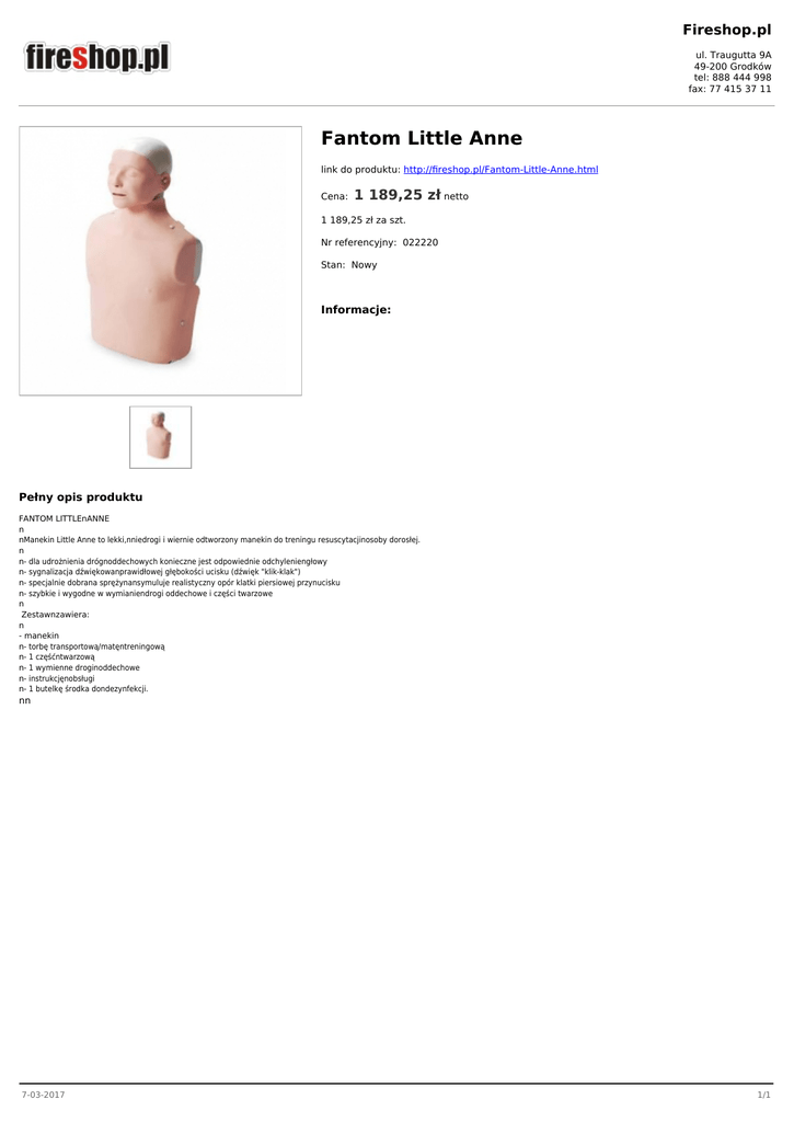 Fireshop.pl ul. Traugutta 9A 49-200 Grodków tel: 888 444 998 fax: 77 415 37 11 Fantom Little Anne link do produktu: http://fireshop.pl/Fantom-Little-Anne.html Cena: 1 189,25 zł netto 1 189,25 zł za szt. Nr referencyjny: 022220 Stan: Nowy Informacje: Pełny opis produktu FANTOM LITTLEnANNE n nManekin Little Anne to lekki,nniedrogi i wiernie odtworzony manekin do treningu resuscytacjinosoby dorosłej. n n- dla udrożnienia drógnoddechowych konieczne jest odpowiednie odchyleniengłowy n- sygnalizacja dźwiękowanprawidłowej głębokości ucisku (dźwięk "klik-klak") n- specjalnie dobrana sprężynansymuluje realistyczny opór klatki piersiowej przynucisku n- szybkie i wygodne w wymianiendrogi oddechowe i części twarzowe n Zestawnzawiera: n - manekin n- torbę transportową/matęntreningową n- 1 częśćntwarzową n- 1 wymienne droginoddechowe n- instrukcjęnobsługi n- 1 butelkę środka dondezynfekcji. nn 7-03-2017 1/1