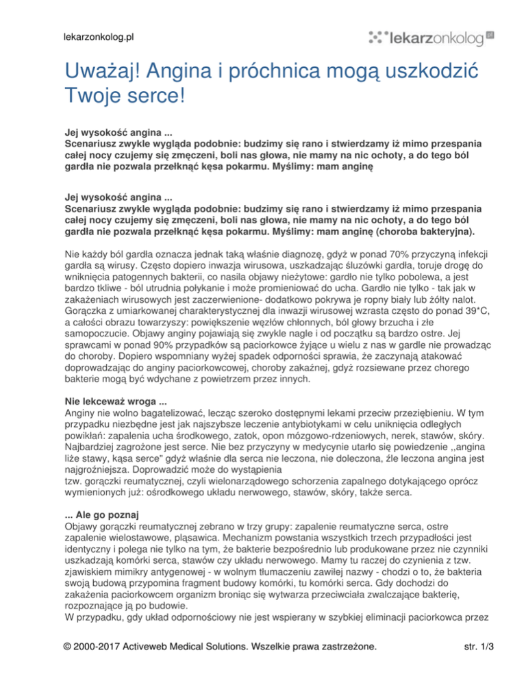lekarzonkolog.pl Uważaj! Angina i próchnica mogą uszkodzić Twoje serce! Jej wysokość angina ... Scenariusz zwykle wygląda podobnie: budzimy się rano i stwierdzamy iż mimo przespania całej nocy czujemy się zmęczeni, boli nas głowa, nie mamy na nic ochoty, a do tego ból gardła nie pozwala przełknąć kęsa pokarmu. Myślimy: mam anginę Jej wysokość angina ... Scenariusz zwykle wygląda podobnie: budzimy się rano i stwierdzamy iż mimo przespania całej nocy czujemy się zmęczeni, boli nas głowa, nie mamy na nic ochoty, a do tego ból gardła nie pozwala przełknąć kęsa pokarmu. Myślimy: mam anginę (choroba bakteryjna). Nie każdy ból gardła oznacza jednak taką właśnie diagnozę, gdyż w ponad 70% przyczyną infekcji gardła są wirusy. Często dopiero inwazja wirusowa, uszkadzając śluzówki gardła, toruje drogę do wniknięcia patogennych bakterii, co nasila objawy nieżytowe: gardło nie tylko pobolewa, a jest bardzo tkliwe - ból utrudnia połykanie i może promieniować do ucha. Gardło nie tylko - tak jak w zakażeniach wirusowych jest zaczerwienione- dodatkowo pokrywa je ropny biały lub żółty nalot. Gorączka z umiarkowanej charakterystycznej dla inwazji wirusowej wzrasta często do ponad 39*C, a całości obrazu towarzyszy: powiększenie węzłów chłonnych, ból głowy brzucha i złe samopoczucie. Objawy anginy pojawiają się zwykle nagle i od początku są bardzo ostre. Jej sprawcami w ponad 90% przypadków są paciorkowce żyjące u wielu z nas w gardle nie prowadząc do choroby. Dopiero wspomniany wyżej spadek odporności sprawia, że zaczynają atakować doprowadzając do anginy paciorkowcowej, choroby zakaźnej, gdyż rozsiewane przez chorego bakterie mogą być wdychane z powietrzem przez innych. Nie lekceważ wroga ... Anginy nie wolno bagatelizować, lecząc szeroko dostępnymi lekami przeciw przeziębieniu. W tym przypadku niezbędne jest jak najszybsze leczenie antybiotykami w celu uniknięcia odległych powikłań: zapalenia ucha środkowego, zatok, opon mózgowo-rdzeniowych, nerek, stawów, skóry. Najbardziej zagrożone jest serce. Nie bez przyczyny w medycynie utarło się powiedzenie ,,angina liże stawy, kąsa serce" gdyż właśnie dla serca nie leczona, nie doleczona, źle leczona angina jest najgroźniejsza. Doprowadzić może do wystąpienia tzw. gorączki reumatycznej, czyli wielonarządowego schorzenia zapalnego dotykającego oprócz wymienionych już: ośrodkowego układu nerwowego, stawów, skóry, także serca. ... Ale go poznaj Objawy gorączki reumatycznej zebrano w trzy grupy: zapalenie reumatyczne serca, ostre zapalenie wielostawowe, pląsawica. Mechanizm powstania wszystkich trzech przypadłości jest identyczny i polega nie tylko na tym, że bakterie bezpośrednio lub produkowane przez nie czynniki uszkadzają komórki serca, stawów czy układu nerwowego. Mamy tu raczej do czynienia z tzw. zjawiskiem mimikry antygenowej - w wolnym tłumaczeniu zawiłej nazwy - chodzi o to, że bakteria swoją budową przypomina fragment budowy komórki, tu komórki serca. Gdy dochodzi do zakażenia paciorkowcem organizm broniąc się wytwarza przeciwciała zwalczające bakterię, rozpoznające ją po budowie. W przypadku, gdy układ odpornościowy nie jest wspierany w szybkiej eliminacji paciorkowca przez © 2000-2017 Activeweb Medical Solutions. Wszelkie prawa zastrzeżone. str. 1/3 lekarzonkolog.pl antybiotyk, dochodzi do nadmiernej produkcji przeciwciał przeciw bakterii, a że jak napisałam wyżej niektóre komórki naszego organizmu mogą przypominać swą budową komórkę danego szczepu paciorkowca, przeciwciała ,,mylą" je z komórkami bakterii i zaczynają niszczyć także te zdrowe komórki własnego organizmu. W takim przypadku mówimy o chorobie auto-immunologicznej, chorobie z auto- agresji, podkreślając fakt, że to już nie drobnoustrój, a tak naprawdę, własny układ odpornościowy ( auto-immuno) staje się agresorem, uszkadzającym serce. O uszkdzeniu serca ... Gorączka reumatyczna powoduje uszkodzenie całego serca, wszystkich jego warstw: wsierdzia, mięśnia serca i osierdzia. Rokowanie zależy od przebiegu zapalenia wsierdzia. Objawy mogą nie występować lub być niecharakterystyczne. W badaniu zwraca uwagę szmer skurczowy lub rozkurczowy nad sercem (zapalenie wsierdzia). Tarcie osierdziowe, ból w okolicy serca (w zapaleniu osierdzia). Jeżeli dojdzie do zapalenia układu przewodzącego serca u pacjenta mogą wystąpić zaburzenia rytmu: odczuwane jako niemiarowa praca serca - może ono przyspieszać (tachykardia) lub zwalniać rytm pracy ( bradykardia, która jeśli jest stała i znacznego stopnia może wymagać wszczepienia rozrusznika). W badaniu ultrasonograficznym ( ECHO serca) można uwidocznić zmiany na zastawkach, płyn w worku osierdziowym, a nawet rozstrzeń serca. Zapalenie wsierdzia prowadzi do zniszczenia zastawek, ich niedomykalności - czyli utraty funkcji co zaburzając prace serca jako całości może doprowadzić do jego niewydolności. "W przypadku, gdy układ odpornościowy nie jest wspierany w szybkiej eliminacji paciorkowca przez antybiotyk, dochodzi do nadmiernej produkcji przeciwciał przeciw bakterii, a że jak napisałam wyżej niektóre komórki naszego organizmu mogą przypominać swą budową komórkę danego szczepu paciorkowca, przeciwciała mylą je z komórkami bakterii i zaczynają niszczyć także te zdrowe komórki własnego organizmu." Co powinno Cię zaniepokoić ... Jeśli w przeszłości często chorowałeś na anginy lub też kilka tygodni temu dopadła Cię ta choroba i nagle bez jasnej przyczyny masz stany podgorączkowe, czujesz się osłabiony, bola Cię stawy, męczysz się znacznie łatwiej odczuwasz niemiarową pracę serca, nie zwlekaj i jak najszybciej skontaktuj się z lekarzem. W celach diagnostycznych zleci on z pewnością: badanie EKG serca, ECHO serca - może uwidocznić narośla bakteryjne na zastawkach i ocenić ich niedomykalność, RTG
