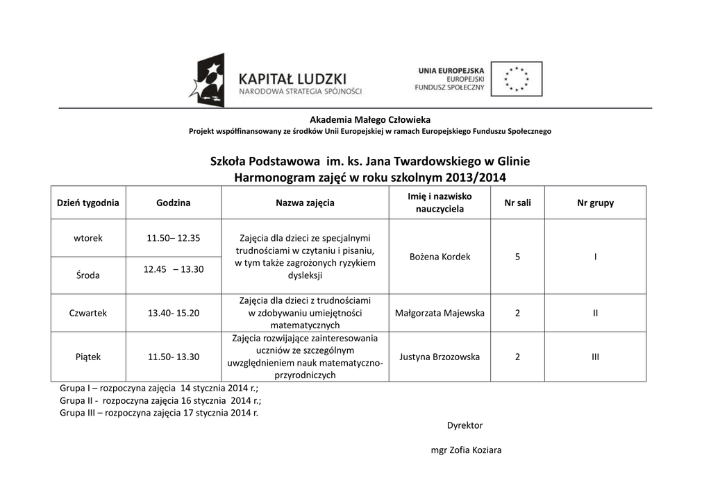 Akademia Małego Człowieka Projekt współfinansowany ze środków Unii Europejskiej w ramach Europejskiego Funduszu Społecznego Szkoła Podstawowa im. ks. Jana Twardowskiego w Glinie Harmonogram zajęć w roku szkolnym 2013/2014 Dzień tygodnia Godzina Nazwa zajęcia Imię i nazwisko nauczyciela Nr sali Nr grupy wtorek 11.50– 12.35 Zajęcia dla dzieci ze specjalnymi trudnościami w czytaniu i pisaniu, w tym także zagrożonych ryzykiem dysleksji Bożena Kordek 5 I Małgorzata Majewska 2 II Justyna Brzozowska 2 III Środa 12.45 – 13.30 Zajęcia dla dzieci z trudnościami Czwartek 13.40- 15.20 w zdobywaniu umiejętności matematycznych Zajęcia rozwijające zainteresowania uczniów ze szczególnym Piątek 11.50- 13.30 uwzględnieniem nauk matematycznoprzyrodniczych Grupa I – rozpoczyna zajęcia 14 stycznia 2014 r.; Grupa II - rozpoczyna zajęcia 16 stycznia 2014 r.; Grupa III – rozpoczyna zajęcia 17 stycznia 2014 r. Dyrektor mgr Zofia Koziara