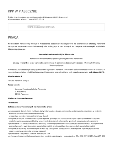 KPP W PIASECZNIE Źródło: http://kpppiaseczno.policja.waw.pl/pp1/aktualnosci/51621,Praca.html Wygenerowano: Wtorek, 7 marca 2017, 15:16 Strona znajduje się w archiwum. PRACA Komendant Powiatowy Policji w Piasecznie poszukuje kandydatów na stanowisko: starszy referent do spraw wprowadzania informacji do policyjnych baz danych w Zespole Informatyki Wydziału Wspomagającego. Komenda Powiatowa Policji w Piasecznie Komendant Powiatowy Policji poszukuje kandydatów na stanowisko: starszy referent do spraw wprowadzania informacji do policyjnych baz danych w Zespole Informatyki Wydziału Wspomagającego W miesiącu poprzedzającym datę upublicznienia ogłoszenia wskaźnik zatrudnienia osób niepełnosprawnych w urzędzie, w rozumieniu przepisów o rehabilitacji zawodowej i społecznej oraz zatrudnianiu osób niepełnosprawnych, jest niższy niż 6%. Wymiar etatu: 1 ● Liczba stanowisk pracy: 1 Adres urzędu Komenda Powiatowa Policji w Piasecznie ul. Kościelna 3 05-500 Piaseczno Miejsce wykonywania pracy: ● Piaseczno Zakres zadań wykonywanych na stanowisku pracy: ● wprowadzanie danych (m.in. meldunki, karty informacyjne, decyzje, orzeczenia, postanowienia), rejestracja w systemie KSIP oraz sprawdzanie i udzielanie informacji w oparciu o policyjne i poza policyjne bazy danych ● weryfikacja danych na meldunkach o przestępstwie, przestępcach, wykroczeniach pod kątem prawidłowości zapisów, modyfikowanie zauważonych błędów, uzupełnianie brakujących informacji w granicach obowiązujących przepisami ● prowadzenie i na bieżąco aktualizacja ewidencji ilościowo przychodowo-rozchodowej sprzętu informatyki, koordynowanie prac związanych z wybrakowaniem sprzętu informatyki, branie udziału w inwentaryzacjach sprzętu informatyki ● weryfikacja rejestracji wprowadzonych do KSIP (np. zatrzymani, postępowania, przestępstwa, rejestracje procesowe, dozory, areszty, wydarzenia, imprezy masowe) ● prowadzenie i weryfikacja kartotek manualnych KSIP ● wykonywanie czynności zleconych przez inne komórki organizacyjne - sprawdzenia w CEL, CEK, CEP, REGON, Noe.NET, KRS ● typowanie zdarzeń podobnych i przestępców oraz typowanie pojazdów po niepełnych danych dla celów rozpoznania policyjnego ● archiwizacja danych informatycznych w celu przekazania do składnicy akt. Warunki pracy Warunki dotyczące charakteru pracy na stanowisku i sposobu wykonywania zadań Praca z komputerem w środowisku biurowym. Miejsce i otoczenie organizacyjno-techniczne stanowiska pracy - praca przy monitorze ekranowym powyżej 4 godzin, - naturalne i sztuczne oświetlenie, - miejsce pracy, przy którym realizowane są zadania usytuowane jest na pierwszym piętrze, - budynek częściowo spełnia wymogi architektoniczne dla osób niepełnosprawnych tj. na zewnątrz i wewnątrz budynku znajduje się winda, wewnątrz budynku można swobodnie poruszać się, jest odpowiednia szerokość drzwi i ciągów komunikacyjnych, brak progów, - na pierwszym piętrze, gdzie usytuowane jest miejsce pracy brak pomieszczenia sanitarnohigienicznego przystosowanego dla osób niepełnosprawnych, - brak oznaczeń i specjalistycznych urządzeń umożliwiających pracę osobom niewidomym, niedosłyszącym oraz głuchoniemym, - w budynku nie występują szkodliwe, czy niebezpieczne warunki pracy. Inne Wymagania związane ze stanowiskiem pracy niezbędne ● wykształcenie: średnie ● doświadczenie zawodowe/staż pracy: 1 rok doświadczenia zawodowego w administracji lub pracy biurowej ● pozostałe wymagania niezbędne: ❍ umiejętność wykorzystania systemów informatycznych ❍ umiejętność obsługi komputera i urządzeń biurowych ❍ umiejętność interpretacji przepisów ❍ umiejętność pracy w zespole ❍ umiejętność organizacji pracy własnej ❍ komunikatywność ❍ odpowiedzialność wymagania dodatkowe ● wykształcenie wyższe ● uprawnienia dostępu do informacji niejawnych oznaczonych klauzulą "poufne" ● znajomość zasad funkcjonowania jednostki Policji ● umiejętność działania w sytuacjach stresowych ● zdolności analitycznego myślenia ● 2 lata doświadczenia zawodowego w obszarze informatyczno-łącznościowym Wymagane dokumenty i oświadczenia: ● życiorys i list motywacyjny ● oświadczenie kandydata o wyrażeniu zgody na przetwarzanie danych osobowych do celów rekrutacji ● oświadczenie kandydata o korzystaniu z pełni praw publicznych ● oświadczenie kandydata o nieskazaniu prawomocnym wyrokiem za umyślne przestępstwo lub umyślne przestępstwo skarbowe ● kopie dokumentów potwierdzających wykształcenie ● kopia dokumentu potwierdzającego posiadanie polskiego obywatelstwa lub oświadczenie o posiadaniu obywatelstwa polskiego ● kopia poświadczenia bezpieczeństwa uprawniającego do dostępu do informacji niejawnych oznaczonych klauzulą "poufne" lub oświadczenie o wyrażeniu zgody na przeprowadzenie postępowania sprawdzającego zgodnie z ustawą z dnia 5 sierpnia 2010 r. o ochronie informacji niejawnych (Dz. U. Nr 182, poz. 1228), Inne dokumenty i oświadczenia ● kopia dokumentu potwierdzającego niepełnosprawność - w przypadku kandydatów, którzy zamierzają skorzystać z pierwszeństwa w zatrudnieniu w przypadku, gdy znajdą się w gronie najlepszych kandydatów ● dokumenty potwierdzające posiadanie 1 roku doświadczenia zawodowego w administracji lub pracy biurowej (kopie świadectw pracy, zakresy czynności, zaświadczenie o zatrudnieniu itp.) ● dokumenty potwierdzające posiadanie 2 lat doświadczenia zawodowego w obszarze informatyczno-łącznościowym (kopie świadectw pracy, zakresy czynności, zaświadczenie o zatrudnieniu itp.) Termin składania dokumentów: 15-10-2014 Miejsce składania dokumentów: Komenda Powiatowa Policji Kościelna 3 05-500 Piaseczno z dopiskiem na kopercie i w liście motywacyjnym "ZI/st. ref./1" Inne informacje: Proponowane warunki wynagrodzenia zasadniczego - mnożnik 1,069 kwoty bazowej. Do składania dok