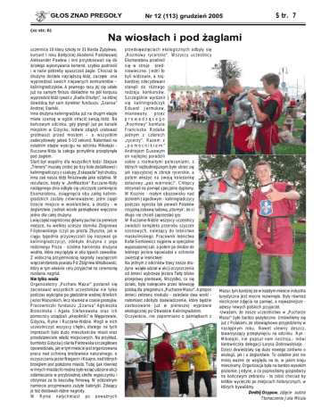 GŁOS ZNAD PREGOŁY (ze str. 6) Nr 12 (113) grudzień 2005 Str. 7 Na wiosłach i pod żaglami uczennica 10 klasy szkoły nr 31 Nastia Żyżylewa, kursant I roku Bałtyckiej Akademii Państwowej Aleksander Pawłow i inni przystosowali się do ścisłego wykonywania komend, szybko podnosili i w razie potrzeby opuszczali żagle. Chociaż ta drużyna dostała najcięższą łódź, zaczęła ona wyprzedzać swoich niejawnych konkurentów – kaliningradczyków. A pewnego razu jej się udało już na samym finiszu dokładnie na pół korpusu wyprzedzić łódź rywali z „Radio Olsztyn”, na której dowódcą był sam dyrektor funduszu „Szansa” Andrzej Stański. Inna drużyna kaliningradzka już na drugim etapie miała szansę w ogóle stracić swoją łódź. Na końcowym odcinku, gdy płynęli już po kanale miejskim w Giżycku, ledwie zdążyli uratować grotmaszt przed mostem – o wszystkim zadecydowały jakieś 5-10 sekund. Natomiast na ostatnim etapie wyścigu na odcinku Mikołajki Ruczane-Nida ta załoga pomyślnie przepłynęła pod żaglem. Start był wspólny dla wszystkich łodzi (lżejsze „Trenery” musiały zrobić po trzy koła dodatkowe) i kaliningradczycy z szalupy „Eskapada” byli drudzy, inna zaś nasza łódź finiszowała jako ostatnia. W rezultacie, kiedy w „Amfiteatrze” Ruczane-Nidy następnego dnia odbyło się uroczyste zamknięcie Ekomaratonu, osiągnięcia obu załóg kaliningradzkich zostały zrównoważone: jedni zajęli trzecie miejsce w wioślarstwie, a drudzy - w żeglarstwie. Jednak wiosło pamiątkowe wręczono jedno dla całej drużyny. Lwią część nagród oraz główny puchar za pierwsze miejsce, ku wielkiej uciesze sternika Zbigniewa Filipkowskiego (czyli po prostu Zbyszka, jak w ciągu tygodnia przyzwyczaili się nazywać go kaliningradczycy), zdobyła drużyna z jego rodzimego Pisza - siódma harcerska drużyna wodna, która zwyciężyła w obu typach zawodów. Z widoczną przyjemnością nagrody zwycięzcom wręczał starosta powiatu Piz Zbigniew Włodkowski, który w tym właśnie celu przyjechał na ceremonię rozdania nagród. Nie tylko woda Organizatorzy „Pucharu Mazur” postarali się zaciekawić wszystkich uczestników nie tylko podczas wyścigów po gładziźnie wodnej Wielkich Jezior Mazurskich, lecz również w czasie postojów. Pracowniczki funduszu „Szansa” Agnieszka Brzezińska i Agata Stefanowska oraz ich pomocnicy urządzali „ekopikniki” w Węgorzewie, Giżycku, Rynie i Ruczane-Nidzie. Mogli w nich uczestniczyć wszyscy chętni, dlatego na tych imprezach było dużo mieszkańców miast oraz przedstawiciele władz miejscowych. Na przykład, burmistrz Giżycka Jolanta Pietrowska szczegółowo opowiedziała, jak w tym mieście jest organizowana praca nad ochroną środowiska naturalnego, o oczyszczaniu jezior Niegocin i Kisajno, nad których brzegiem jest położone miasto. Tutaj (jak również w innych miastach) można było wziąć udział w akcji odśmiecania w przybrzeżnej strefie wypoczynku i otrzymać za to koszulkę firmową. W oddzielnym namiocie przyjmowano zużyte bateryjki. Zdający je też dostawali różne nagrody. W Rynie natychmiast po poważnych przedsięwzięciach ekologicznych odbyły się „Rozmowy rycerskie”. Wszyscy uczestnicy Ekomaratonu przebrali się w stroje średniowieczne. Jedni to byli widzowie, a najbardziej zdecydowani stanęli do różnego rodzaju konkursów. Szczególnie wyróżnił się kaliningradczyk Eduard Jermukow, mianowany przez prowadzącego „Rozmowy” komtura Franciszka Rodaka jednym z czterech „rycerzy”. Razem z „pomocnikiem” Andriejem Gusewym on najlepiej poradzili sobie z rozmaitymi poleceniami, z których najtrudniejszeym było ubrać się jak najszybciej w zbroje rycerskie, a potem włożyć na swoją koleżankę żelazowy „pas wierności”. Chłopcy otrzymali na pamięć specjalne dyplomy. W Kozinie - małym obozowisku nad jeziorem Jagodowym - kaliningradczycy podczas ogniska tak porwali Polaków rosyjską zabawą ludową „strumyk’, że ci długo nie chcieli zaprzestać gry. W Ruczanie-Nidzie wszyscy uczestnicy zwiedzili kompleks przerobu szyszek sosnowych, należący do leśnictwa maskulinskiego. Pracownik leśnictwa Rafał Sienkiewicz najpierw w specjalnie wyposażonej sali, a potem po drodze do leśnego jeziora opowiadał o ochronie zwierząt w leśnictwie. Na jednym z odcinków trasy nasza drużyna wzięła udział w akcji oczyszczenia od śmieci wybrzeża jeziora Tałty blisko przeprawy promowej. Wszystko, co się działo, było nakręcane przez telewizję polską dla programu o „Pucharze Mazur”. A propos śmieci zebrano niedużo - zaledwie dwa worki natomiast zdobyto doświadczenie, które będzie zastosowane już w pierwszej wyprawie ekologicznej po Obwodzie Kaliningradzkim. Oczywiście, nie zapomniano o pamiątkach z Mazur, tym bardziej że w każdym mieście industria turystyczna jest mocno rozwinięta. Były również niezliczone zdjęcia na pamięć, a najważniejsze adresy nowych polskich przyjaciół. -Uważam, że nasze uczestnictwo w „Pucharze Mazur” było bardzo pożyteczne. Umówiliśmy się już z Polakami, że obowiązkowo przyjedziemy w następnym roku. Nawet ulewny deszcz, towarzyszący przepłynięciu na odcinku Ryn Mikołajki, nie popsuł nam nastroju,- mówi kierowniczka delegacji Łarysa Dobrowolskaja. Dzieci dowiedziały się dużo nowego zarówno o ekologii, jak i o żeglarstwie. To ostatnie jest nie mniej ważne ze względu na to, w jakim kraju mieszkamy. Organizacja była na bardzo wysokim poziomie. Jedyne, o co poprosiliśmy gospodarzy na końcowym zebraniu - to robić chociaż by krótkie wycieczki po miejscach historycznych, w których bywaliśmy. Dmitrij Osypow, zdjęcie autora Tłumaczenie Julia Micula
