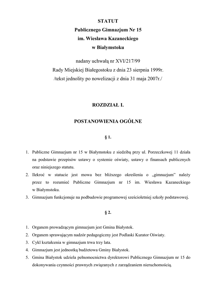 STATUT Publicznego Gimnazjum Nr 15 im. Wiesława Kazaneckiego