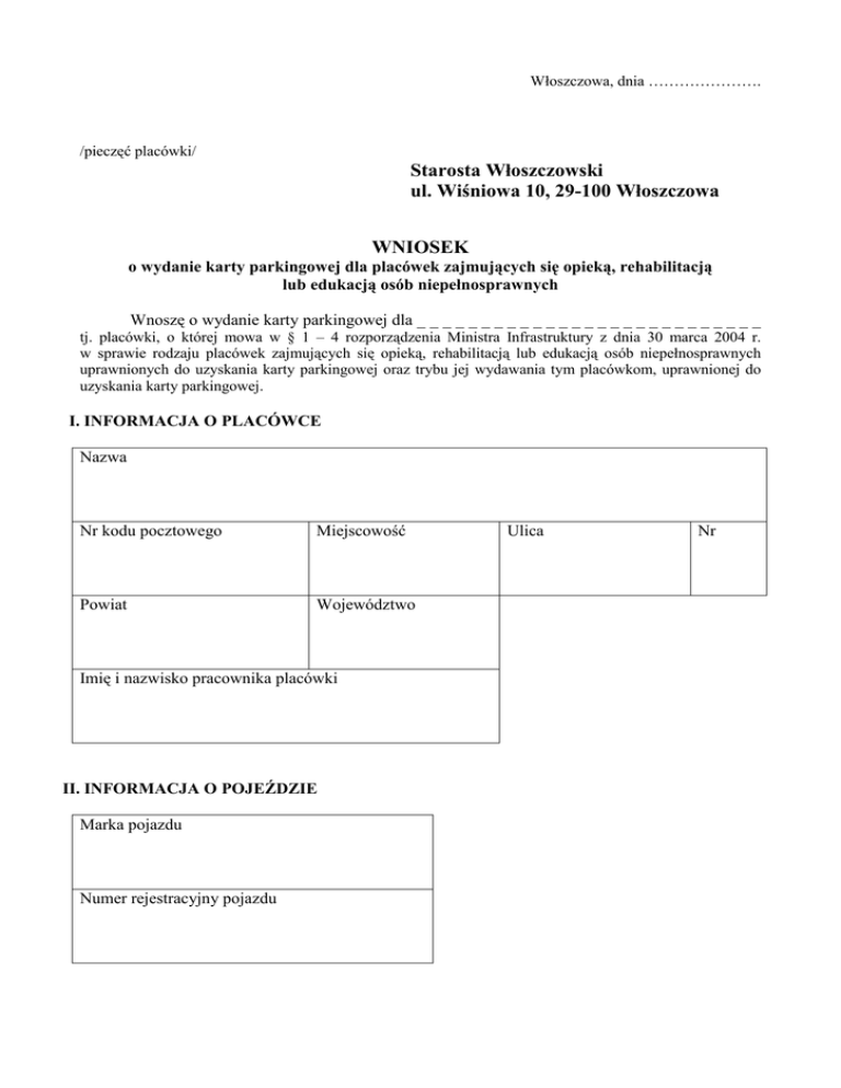 Włoszczowa, dnia …………………. /pieczęć placówki/ Starosta Włoszczowski ul. Wiśniowa 10, 29-100 Włoszczowa WNIOSEK o wydanie karty parkingowej dla placówek zajmujących się opieką, rehabilitacją lub edukacją osób niepełnosprawnych Wnoszę o wydanie karty parkingowej dla _ _ _ _ _ _ _ _ _ _ _ _ _ _ _ _ _ _ _ _ _ _ _ _ _ _ _ tj. placówki, o której mowa w § 1 – 4 rozporządzenia Ministra Infrastruktury z dnia 30 marca 2004 r. w sprawie rodzaju placówek zajmujących się opieką, rehabilitacją lub edukacją osób niepełnosprawnych uprawnionych do uzyskania karty parkingowej oraz trybu jej wydawania tym placówkom, uprawnionej do uzyskania karty parkingowej. I. INFORMACJA O PLACÓWCE Nazwa Nr kodu pocztowego Miejscowość Powiat Województwo Imię i nazwisko pracownika placówki II. INFORMACJA O POJEŹDZIE Marka pojazdu Numer rejestracyjny pojazdu Ulica Nr III. INFORMACJA O PRZEBYWANIU W PLACÓWKACH OSÓB NIEPEŁNOSPRAWNYCH W placówce przebywają bądź kształcą się osoby posiadające: Tak* WaŜne orzeczenia o niesprawności lub stopniu niesprawności Tak* WaŜne orzeczenia o niezdolności do pracy wydane przez lekarza orzecznika Zakładu Ubezpieczeń Społecznych WaŜne orzeczenia o zaliczeniu do jednej z grup inwalidztwa do pracy wydane przez komisję Ministerstwa Obrony Narodowej lub Ministerstwa Spraw Wewnętrznych i Administracji WaŜne orzeczenia o niezdolności do pracy w gospodarstwie rolnym wydane przez lekarza rzeczoznawcę lub Komisję Kasy Rolniczej Ubezpieczenia Społecznego WaŜne orzeczenia o zaliczeniu do jednej z grup inwalidztwa przez Komisję ds. Inwalidztwa i Zatrudnienia Tak* Tak* Tak* * Zaznaczyć prawidłowe przez podkreślenie. …………………………………… ……………………………. (podpis osoby uprawnionej do reprezentowania placówki) (miejscowość, data) IV. OŚWIADCZENIE WNIOSKODAWCY Na podstawie art. 75 § 2 Kodeksu postępowania administracyjnego, świadomy(a) odpowiedzialności karnej, zgodnie z art. 233 § 1 – 3 i 6 Kodeksu karnego, za podanie w niniejszym wniosku nieprawdy, potwierdzam własnoręcznym podpisem prawdziwość danych w nim zamieszczonych. Oświadczam jednocześnie, Ŝe jest mi znana treść art. 233 § 1 – 3 i 6 Kodeksu karnego. „Art. 233 § 1. Kto, składając zeznanie mające słuŜyć za dowód w postępowaniu sądowym lub w innym postępowaniu prowadzonym na podstawie ustawy, zeznaje nieprawdę lub zataja prawdę, podlega karze pozbawienia wolności do lat 3. § 2. Warunkiem odpowiedzialności jest, aby przyjmujący zeznanie, działając w zakresie swoich uprawnień, uprzedził zeznającego o odpowiedzialności karnej za fałszywe zeznanie lub odebrał od niego przyrzeczenie. § 3. Nie podlega karze, kto, nie wiedząc o prawie odmowy zeznania lub odpowiedzi na pytania, składa fałszywe zeznanie z obawy przed odpowiedzialnością karną groŜącą jemu samemu lub jego najbliŜszym. ………………………………………………………………………………………………………………... § 6. Przepisy § 1 – 3 oraz 5 stosuje się odpowiednio do osoby, która składa fałszywe oświadczenie, jeŜeli przepis ustawy przewiduje moŜliwość odebrania oświadczenia pod rygorem odpowiedzialności karnej.” …………………………………… (podpis osoby uprawnionej do reprezentowania placówki) ……………………………. (miejscowość, data)