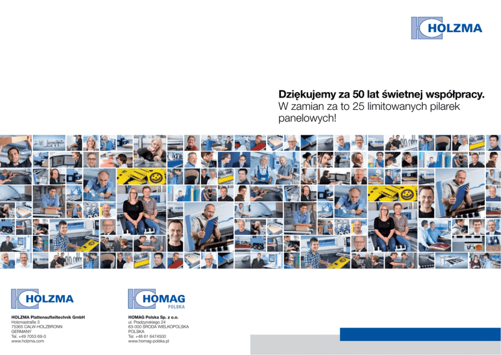 Dziękujemy za 50 lat świetnej współpracy. W zamian za to 25 limitowanych pilarek panelowych! HOLZMA Plattenaufteiltechnik GmbH Holzmastraße 3 75365 Calw-Holzbronn Germany Tel. +49 7053 69-0 www.holzma.com HOMAG Polska Sp. z o.o. ul. Pradzynskiego 24 63-000 SRODA WIELKOPOLSKA POLSKA Tel. +48 61 6474500 www.homag-polska.pl Świętuj z nami 50-lecie firmy HOLZMA! Z tej okazji mamy dla Ciebie prezent: Jedną z 25 jubileuszowych pilarek panelowych serii 3 w atrakcyjnej cenie! owa bileusz 6 ju ja c Ak .201 - 31.10 01.06. HPP 300 HPL 300 OFERTA LIMITOWANA: KORZYŚCI: WARUNKI: •z okazji 50-lecia firmy HOLZMA oferujemy 5 extra korzystnych cenowo maszyn z serii 3 (HPP 300,HPL 300) miesięcznie Pilarki z serii 3 są jak szyte na miarę. Dotyczy to również wersji jubileuszowej tych maszyn. Przy wyborze wyposażenia nie stawiamy Tobie żadnych ograniczeń. Dzięki temu będziesz mógł się cieszyć z doskonale “skrojonej” maszyny. Pospiesz się – to oferta limitowana! Czas trwania: Od 01.06 do 31.10.2016. Uwaga: Akcja nie łączy się z innymi promocjami. Akcja obejmuje 25 jubileuszowych pilarek panelowych. Decyduje data i czas wpłynięcia zamówienia do HOMAG Polska Sp. z o.o., Środa Wlkp. bądź HOLZMA Plattenaufteiltechnik GmbH, Holzbronn. Czas dostawy: Szybki czas realizacji Twojego zamówienia. •5-miesięczny czas trwania oferty (czerwiec-październik 2016) Dobierz sobie odpowiedni model jubileuszowy: • HPP 300 bądź HPL 300 • indywidualnie wyposażony • w specjalnej jubileuszowej cenie Zainteresowany? Zapraszamy po szczegóły do Działu Handlowego HOMAG Polska! Nie zwlekaj – Oferta LIMITOWANA!