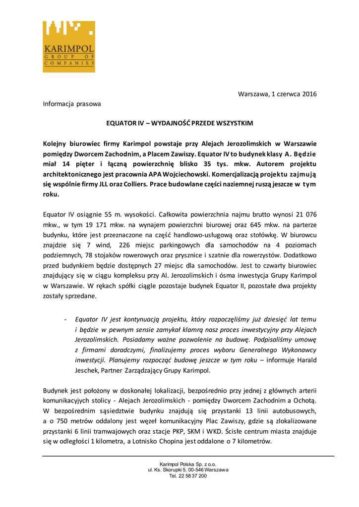 Warszawa, 1 czerwca 2016 Informacja prasowa EQUATOR IV – WYDAJNOŚĆ PRZEDE WSZYSTKIM Kolejny biurowiec firmy Karimpol powstaje przy Alejach Jerozolimskich w Warszawie pomiędzy Dworcem Zachodnim, a Placem Zawiszy. Equator IV to budynek klasy A. Będzie miał 14 pięter i łączną powierzchnię blisko 35 tys. mkw. Autorem projektu architektonicznego jest pracownia APA Wojciechowski. Komercjalizacją projektu zajmują się wspólnie firmy JLL oraz Colliers. Prace budowlane części naziemnej ruszą jeszcze w tym roku. Equator IV osiągnie 55 m. wysokości. Całkowita powierzchnia najmu brutto wynosi 21 076 mkw., w tym 19 171 mkw. na wynajem powierzchni biurowej oraz 645 mkw. na parterze budynku, które jest przeznaczone na część handlowo-usługową oraz stołówkę. W biurowcu znajdzie się 7 wind, 226 miejsc parkingowych dla samochodów na 4 poziomach podziemnych, 78 stojaków rowerowych oraz prysznice i szatnie dla rowerzystów. Dodatkowo przed budynkiem będzie dostępnych 27 miejsc dla samochodów. Jest to czwarty biurowiec znajdujący się w ciągu kompleksu przy Al. Jerozolimskich i ósma inwestycja Grupy Karimpol w Warszawie. W rękach spółki ciągle pozostaje budynek Equator II, pozostałe dwa projekty zostały sprzedane. - Equator IV jest kontynuacją projektu, który rozpoczęliśmy już dziesięć lat temu i będzie w pewnym sensie zamykał klamrą nasz proces inwestycyjny przy Alejach Jerozolimskich. Posiadamy ważne pozwolenie na budowę. Podpisaliśmy umowę z firmami doradczymi, finalizujemy proces wyboru Generalnego Wykonawcy inwestycji. Planujemy rozpocząć budowę jeszcze w tym roku – informuje Harald Jeschek, Partner Zarządzający Grupy Karimpol. Budynek jest położony w doskonałej lokalizacji, bezpośrednio przy jednej z głównych arterii komunikacyjych stolicy - Alejach Jerozolimskich - pomiędzy Dworcem Zachodnim a Ochotą. W bezpośrednim sąsiedztwie budynku znajdują się przystanki 13 linii autobusowych, a o 750 metrów oddalony jest węzeł komunikacyjny Plac Zawiszy, gdzie są zlokalizowane przystanki 6 linii tramwajowych oraz stacje PKP, SKM i WKD. Ścisłe centrum miasta znajduje się w odległości 1 kilometra, a Lotnisko Chopina jest oddalone o 7 kilometrów. Karimpol Polska Sp. z o.o. ul. Ks. Skorupki 5, 00-546 Warszawa Tel. 22 58 37 200 Equator IV jest certyfikowany w systemie BREEAM na poziomie Very Good. Będzie budynkiem przyjaznym najemcom i środowisku naturalnemu dzięki zastosowaniu ekologicznych materiałów wykończeniowych oraz rozwiązaniom energooszczędnym. - Planowany obiekt stanowić będzie kontynuację budynków biurowych o podobnej architekturze i zbliżonych gabarytach. Jest czwartym z kolei budynkiem biurowym zamykającym cały układ w spójną całość – mówi Michał Sadowski z biura APA Wojciechowski. Usytuowanie biurowca zapewnia pomieszczeniom ekspozycję słoneczną o każdej porze roku. Dbaliśmy więc o to, by od świtu do zmierzchu wnętrza wypełniało naturalne światło. Dużą uwagę poświęciliśmy zaprojektowaniu jak najbardziej elastycznej i wydajnej w kontekście najmu możliwości aranżacji powierzchni – dodaje. Na działce wykonano już prace ziemne oraz ściany szczelinowe, które zabezpieczają teren. Ich realizatorem była firma budowlana PORR. Szczegółowe informacje na temat projektu znajdują się na stronie: www.equator4.pl EQUATOR IV w liczbach: 55 m. wysokości 34 935 mkw. – powierzchnia całkowita budynku 21 076 mkw. GLA 645 mkw. powierzchni handlowo-usługowej 18 poziomów (13 poziomów biurowych, 1 poziom handlowo-usługowy, 4 poziomy garaży podziemnych) 226 podziemnych miejsc parkingowych i 27 miejsc naziemnych 78 stojaków dla rowerów 7 wind Biuro prasowe Karimpol Polska: Lidia Piekarska e-mail: [email protected] kom. +48 691 38 13 38 *** Karimpol Polska Sp. z o.o. ul. Ks. Skorupki 5, 00-546 Warszawa Tel. 22 58 37 200 Grupa Karimpol to spółka deweloperska założona w 1991 roku. Jej celem jest budowa i wynajem powierzchni ko mer c yjn ych w kr ajac h Europy Środkowo-Wschodniej. Dziś Grupa działa w 8 krajach regionu: Polsce, Czechach, Austrii, Bośni i Hercegowinie, Luksemburgu, Ro sj i oraz na Słowacji i na Węgrzech. Polski oddział firmy został otwarty w 1997 roku. Dotychczas Karimpol Polska zr e ali zo wa ł w W ar sza w i e 7 projektów biurowych: Stratos, Mistral, Passat, Taifun, Equator I, II i III. Obecnie spółka realizuje dwie nowe inwestycje: Eq u at or I V o r az Skyliner – największy i najbardziej prestiżowy projekt Grupy. Łączna powierzchnia najmu wszystkich inwestycj i w P o l sce w yn o si b l isko 200 tys. mkw. Przez 25 lat działalności Grupa Karimpol stała się jedną z najsprawniej funkcjonujących prywatnych firm deweloperski ch n a terenie Europy Środkowo-Wschodniej. Karimpol Polska Sp. z o.o. ul. Ks. Skorupki 5, 00-546 Warszawa Tel. 22 58 37 200