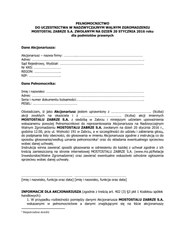 PEŁNOMOCNICTWO DO UCZESTNICTWA W NADZWYCZAJNYM WALNYM ZGROMADZENIU MOSTOSTAL ZABRZE S.A. ZWOŁANYM NA DZIEŃ 20 STYCZNIA 2016 roku dla podmiotów prawnych Dane Akcjonariusza: Akcjonariusz – nazwa firmy: …………...……………………………………………………………… Adres: ……………………………………………………………………………………………………………. Sąd Rejestrowy, Wydział: ………………………………………………………………………………… Nr KRS: ………………………… REGON: ……………………….. NIP: …………………………….. Dane Pełnomocnika: Imię i nazwisko: ……………………………………………………………………………………………… Adres: ……………………………………………………………………………………………………………. Seria i numer dokumentu tożsamości:……………………………………………………………….. PESEL: …………………………………………. Oświadczam, iż jako Akcjonariusz jestem uprawniony z …………………………………….. (liczba) akcji zwykłych na okaziciela i z …………………………………….. (liczba) akcji imiennych MOSTOSTALU ZABRZE S.A. z siedzibą w Zabrzu i niniejszym udzielam upoważnienia wskazanemu powyżej Pełnomocnikowi do reprezentowania Akcjonariusza na Nadzwyczajnym Walnym Zgromadzeniu MOSTOSTALU ZABRZE S.A. zwołanym na dzień 20 stycznia 2016 r., godzina 12.00, przy ul. Wolności 191 w Zabrzu, a w szczególności do udziału i zabierania głosu, do podpisania listy obecności, do głosowania w imieniu Akcjonariusza zgodnie z instrukcją co do sposobu głosowania/według uznania pełnomocnika1 oraz do składania ewentualnego sprzeciwu wobec danej uchwały. Instrukcja winna zawierać sposób głosowania w odniesieniu do każdej z uchwał zgodnie z ich treścią zamieszczoną na stronie internetowej MOSTOSTALU ZABRZE S.A. (www.mz.pl/Relacje Inwestorskie/Walne Zgromadzenie) oraz zawierać ewentualne wskazówki odnośnie ogłoszenia sprzeciwu wobec danej uchwały. ……………………………………………….. ………………………………………………… [imię i nazwisko, funkcja oraz data] [imię i nazwisko, funkcja oraz data] INFORMACJE DLA AKCJONARIUSZA (zgodnie z treścią art. 402 (3) §3 pkt 1 Kodeksu spółek handlowych): 1. W przypadku rozbieżności pomiędzy danymi Akcjonariusza MOSTOSTALU ZABRZE S.A. wskazanymi w pełnomocnictwie a danymi znajdującymi się na liście akcjonariuszy 1 Niepotrzebne skreślić sporządzonej w oparciu o wykaz otrzymany od Krajowego Depozytu Papierów Wartościowych S.A. i przekazanego MOSTOSTALOWI ZABRZE S.A. na podstawie art. 406 (3) Kodeksu spółek handlowych Pełnomocnik Akcjonariusza MOSTOSTALU ZABRZE S.A. może, decyzją Zarządu, zostać nie dopuszczony do uczestnictwa w Nadzwyczajnym Walnym Zgromadzeniu. 2. Wykorzystanie niniejszego formularza zależy tylko i wyłącznie od decyzji Akcjonariusza. Akcjonariusz ma prawo do udzielenia pełnomocnictwa w innej formie, pod warunkiem, iż treść takiego pełnomocnictwa umożliwia: (a) identyfikację Akcjonariusza oddającego głos oraz jego pełnomocnika, (b) oddanie głosu w rozumieniu art. 4 § 1 pkt 9 Kodeksu spółek handlowych, (c) złożenie sprzeciwu przez Akcjonariuszy głosujących przeciwko uchwale.