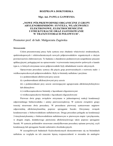 ROZPRAWA DOKTORSKA Mgr. inż. PAWŁA GAWRYSIA „NOWE PÓŁPRZEWODNIKI ORGANICZNE Z GRUPY ARYLENOBISIMIDÓW: SYNTEZA, WŁAŚCIWOŚCI ELEKTRONOWE, ELEKTROCHEMICZNE I STRUKTURALNE ORAZ ZASTOSOWANIE W TRANZYSTORACH POLOWYCH”. Promotor prof. dr hab. Małgorzata Zagórska Streszczenie Celem prezentowanej pracy była synteza oraz zbadanie właściwości strukturalnych, spektroskopowych i elektrochemicznych nowych półprzewodników organicznych o dużym powinowactwie elektronowym. Te badania o charakterze podstawowym uzupełniono pracami aplikacyjnymi, polegającymi na opracowaniu i wytworzeniu tranzystorów polowych o kanale typu n, w których otrzymane nowe półprzewodniki były składnikami warstw aktywnych. Opracowano procedury syntezy dla pięciu grup przetwarzalnych z roztworu mało- i wielkocząsteczkowych półprzewodników. Były to bisimidy naftalenu i perylenu: i) z podstawnikami alkilowymi przy azocie ii) z podstawnikami alkiloarylowymi przy azocie iii) z podstawnikami przy azocie zawierającymi ugrupowania alkilotienylofenylowe lub ditienylowe iv) wielkocząsteczkowe bisimidy z łącznikami oligoeterowymi v) wielkocząsteczkowe bisimidy z łącznikami oligoarylowymi Pierwsze dwie grupy związków otrzymano w jednoetapowej reakcji kondensacji odpowiedniego bisbezwodnika i aminy pierwszorzędowej. W syntezie związków grupy trzeciej stosowano dwie procedury. W procedurze pierwszej syntezowano najpierw odpowiednią alkilotienyloanilinę poprzez sprzęganie Suzuki. Otrzymany związek kondensowano z bisbezwodnikiem naftalenowym. Druga procedura polegała na kondensacji 2-tienylometyloaminy z bisbezwodnikiem naftalenowym w pierwszym etapie i przyłączeniu, w drugim etapie, dodatkowego pierścienia alkilotienylowego także poprzez sprzęganie Suzuki. W syntezie poliimidów stosowano zmodyfikowane procedury opisane powyżej, czyli kondensację lub sprzęganie Suzuki substratów dwufunkcyjnych. W szczegółowych badaniach fizykochemicznych skoncentrowano się na bisimidach naftalenu ze względu na ich znacznie lepszą rozpuszczalność w stosunku do analogów perylenowych. Cecha ta jest szczególnie pożądana we wszystkich zastosowaniach dotyczących elektroniki organicznej. Wspólną cechą wszystkich otrzymanych związków było charakterystyczne pasmo o strukturze oscylacyjnej w widmie UV-vis, pochodzące od przejścia w rdzeniu bisimidu. Położenie tego pasma było niezależne od podstawnika, co wskazuje na brak sprzężenia poprzez azot amidowy. W widmach bisimidów z podstawnikami zawierającymi grupy tienylofenylowe, ditienylowe i oligoarylowe pojawiały się dodatkowo pasma od tych grup chromoforowych. Badania elektrochemiczne wykazały jednak, że w przypadku bisimidów naftalenowych podstawniki, poprzez efekt indukcyjny, mogą wpływać na potencjał redukcji rdzenia. Zastąpienie podstawników alkilowych alkiloarylowymi powoduje podwyższenie tego potencjału o 70 - 90 mV, a wprowadzanie ugrupowań tienylenowych o dalsze 10-40 mV. Te ostatnie pochodne redukują się przy potencjale ok. - 1,05 V względem ferrocenu. Wysoki potencjał redukcji stanowi warunek sine qua non zastosowań półprzewodników organicznych w tranzystorach polowych typu n, działających na powietrzu. Otrzymane bisimidy warunek ten spełniają. Badania spektroelektrochemiczne bisimidów wielkocząsteczkowych pozwoliły z kolei na eksperymentalną weryfikację mechanizmu redukcji rdzenia, zaproponowanego wcześniej na podstawie badań elektrochemicznych. Analiza przesunięć pasm ramanowskich jednoznacznie pokazała, że wprowadzony w wyniku redukcji elektron jest delokalizowany w heteropierścieniu zawierającym azot amidowy. Badania elektrochemiczne, a w niektórych przypadkach również spektroelektrochemiczne, pozwoliły na określenie poziomów HOMO i LUMO w otrzymanych bisimidach. Uzyskane wartości pozostawały w dobrej zgodności z wynikami obliczeń metoda DFT. Do badań monowarstw bisimidów na podłożach przewodzących (HOPG, złoto) zastosowano skaningową mikroskopię tunelową (STM). Uzyskane obrazy mikroskopowe wykazały dużą tendencję tych związków do tworzenia uporządkowanych struktur nadcząsteczkowych w wyniku oddziaływań pomiędzy rdzeniami cząsteczek (-stacking) i zazębiania się ich grup alkilowych (interdigitation). Uporządkowane i zorientowane warstwy powstawały również na innych podłożach (poliestry, szkło, krzem), przy czym, jak pokazały badania metodami dyfrakcji rentgenowskiej, na tych podłożach cząsteczki ustawiały się długą osią prostopadle lub prawie prostopadle do podłoża. Większość otrzymanych bisimidów małocząsteczkowych zostało wykorzystane jako warstwy aktywne, a wykonane z nich tranzystory o kanale typu n działały na powietrzu. Nie obserwowano natomiast ruchliwości warstw aktywnych z bisimidów wielkocząsteczkowych.