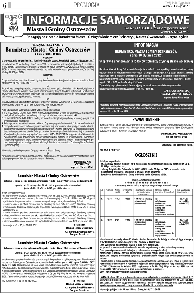 6 PROMOCJA Twój Puls Tygodnia wtorek - 14 lutego 2012 r. INFORMACJA ZARZ¥DZENIE Nr 19/2012 Burmistrza Miasta i Gminy Ostrzeszów z dnia 6 lutego 2012 r. w sprawie: przeprowadzenia na terenie miasta i gminy Ostrzeszów obowi¹zkowej akcji deratyzacji (odszczurzania) Na podstawie art.30 ust.1 ustawy z dnia 8 marca 1990 r. o samorz¹dzie gminnym (tekst jednolity Dz. U. z 2001 r. nr 142 poz.1591, z póŸniejszymi zmianami), w zwi¹zku z § 28 i 29 uchwa³y Nr XXXVII302/2006 z dnia 29 czerwca 2006 r. w sprawie Regulaminu utrzymania czystoœci i porz¹dku na terenie miasta i gminy Ostrzeszów (Dz. Urz. Woj. Wielkop. Nr 127 poz.3127), zarz¹dzam §1 Przeprowadzenie na ca³ym terenie miasta i gminy Ostrzeszów obowi¹zkowej deratyzacji (odszczurzania) w dniach od 20 lutego 2012 do 30.06.2012 r. §2 Akcja odszczurzania polega na jednoczesnym wy³o¿eniu trutki we wszystkich budynkach mieszkalnych, u¿ytkowych, zak³adach handlowych, sklepach, magazynach, obiektach przemys³owych, fabrykach, wytwórniach i przetwórniach artyku³ów spo¿ywczych, obiektach kolejowych oraz na terenie gospodarstw rolnych, itp. stanowi¹cych w³asnoœæ pañstwow¹, gminn¹, spó³dzielcz¹ lub prywatn¹. §3 Wszyscy w³aœciciele, administratorzy, zarz¹dcy i u¿ytkownicy obiektów wymienionych w § 2 niniejszego zarz¹dzenia zobowi¹zani s¹ zaopatrzyæ siê w trutkê przeciw gryzoniom na koszt w³asny. §4 Akcjê odszczurzania nale¿y przeprowadziæ wed³ug nastêpuj¹cych zasad: 1. W dniu 20.02.2012 r. nale¿y trutkê w³o¿yæ w miejscach pojawienia siê gryzoni, a w szczególnoœci na œmietnikach, na strychach, w budynkach gospodarczych, itp. zgodnie z instrukcj¹ na opakowaniu trutki. 2. Od dnia 20.02.2012 r. do 30.06.2012 r. nale¿y pozostawiæ wy³o¿on¹ trutkê uzupe³niaj¹c j¹ w miarê spo¿ycia przez gryzonie w czasie trwania akcji. 3. Pad³e gryzonie oraz resztki trutki usuwaæ na bie¿¹co. Ca³y teren posprz¹taæ w terminie do 2 dni po zakoñczeniu akcji. 4. Osoby zobowi¹zane do bezpoœredniego przeprowadzania akcji odszczurzania winny podj¹æ czynnoœci zabezpieczaj¹ce przed nieszczêœliwymi wypadkami zatruæ mieszkañców i zwierz¹t domowych, a w szczególnoœci pouczyæ dzieci o niebezpieczeñstwie zatrucia. Zwierzêta i ptactwo domowe trzymaæ w trakcie trwania akcji w zamkniêciu. W miejscach wy³o¿enia trucizny wywiesiæ ostrze¿enie: UWAGA TRUCIZNA! W przypadku zatruæ kierowaæ niezw³ocznie osoby chore do najbli¿szego pomocy lekarskiej. Nadzór nad akcj¹, jej przygotowaniem i wykonaniem (w³aœciwe uporz¹dkowanie terenu, terminowe wy³o¿enie trutki oraz póŸniejsze zebranie i zniszczenie pad³ych gryzoni i pozosta³ej trucizny) pe³ni¹ przedstawiciele Urzêdu Miasta, w porozumieniu z Powiatow¹ Stacj¹ Sanitarno-Epidemiologiczn¹. §5 Wykonanie zarz¹dzenia powierzam Zastêpcy Burmistrza Miasta i Gminy. §6 Zarz¹dzenie wchodzi w ¿ycie z dniem podpisania i zostaje podane do wiadomoœci przez rozplakatowanie. Treœæ plakatu przygotowuje Wydzia³ Gospodarki Gruntami i Rolnictwa. BURMISTRZ MiG OSTRZESZÓW mgr in¿. Mariusz Witek Burmistrz Miasta i Gminy Ostrzeszów informuje, ¿e na tablicy og³oszeñ w Urzêdzie Miasta i Gminy Ostrzeszów, ul. Zamkowa 31 zgodnie z art. 35 ustawy z dnia 21.08.1997r. o gospodarce nieruchomoœciami (jedn. tekst Dz. U. z 2010r Nr 102, poz. 651 z póŸn. zm.), BURMISTRZA MIASTA I GMINY OSTRZESZÓW z dnia 30 stycznia 2012r. w sprawie uhonorowania rodziców ¿o³nierzy czynnej s³u¿by wojskowej Burmistrz Miasta i Gminy Ostrzeszów informuje, ¿e w celu okazania wysokiego uznania rodzicom, którzy wychowali trzech i wiêcej synów na wzorowych i ofiarnych ¿o³nierzy (to znaczy odbyli zasadnicz¹ s³u¿bê wojskow¹), istnieje mo¿liwoœæ uhonorowania tych rodziców medalem „Za zas³ugi dla obronnoœci kraju”*. Stosownych zg³oszeñ nale¿y dokonywaæ w Urzêdzie Miasta i Gminy w Ostrzeszowie, pokój nr 16 (I piêtro), w godz. 7:00 – 15:00, do dnia 24 lutego 2012 roku. Zg³aszaæ siê mog¹ tylko rodzice, którzy do tej pory nie zostali uhonorowani stosownym medalem. Dodatkowe informacje mo¿na uzyskaæ pod nr tel. 62/ 732 06 23. ZASTÊPCA BURMISTRZA MIASTA I GMINY OSTRZESZÓW mgr in¿. Pawe³ Uœcinowicz * podstawa prawna: § 2 rozporz¹dzenia Ministra Obrony Narodowej z dnia 19 kwietnia 1991 r. w sprawie zasad i trybu nadawania medalu „Za zas³ugi dla obronnoœci Kraju” oraz wzoru odznaki tego medalu i sposobu jego noszenia (Dz. U. Nr 39, poz. 170). ZAWIADOMIENIE Burmistrz Miasta i Gminy Ostrzeszów przypomina o terminie p³atnoœci z tytu³u u¿ytkowania wieczystego, który mija z dniem 31 marca ka¿dego roku. Informacje mo¿na uzyskaæ pod numerem telefonu 62/ 732 06 22 w Wydziale Gospodarki Gruntami i Rolnictwa tut. Urzêdu - pokój 26. BURMISTRZ MiG OSTRZESZÓW mgr in¿. Mariusz Witek Ostrzeszów, dnia 31 stycznia 2012 r. GPR 6840.9.2011.2012 OG£OSZENIE Dzia³aj¹c na podstawie: - art. 35 ustawy z dnia 21 sierpnia 1997 r. o gospodarce nieruchomoœciami (jednolity tekst z 2010 r. Dz. U, Nr 102 poz. 651 z póŸn. zm.), - Uchwa³y Rady Miejskiej Ostrzeszów Nr XVIII/108/2012 z dnia 26 stycznia 2012 r. w sprawie: zbycia nieruchomoœci gruntowych, po³o¿onych w Rojowie, gmina Ostrzeszów - Zarz¹dzenia Burmistrza Miasta i Gminy nr 14/2012 z dnia 30 stycznia 2012 r. Podajê do publicznej wiadomoœci wykaz nieruchomoœci gruntowych przeznaczonych do sprzeda¿y w trybie przetargu ustnego nieograniczonego zosta³y wywieszone wykazy: - na nieruchomoœæ gruntow¹ przeznaczon¹ do dzier¿awy na rzecz dotychczasowego dzier¿awcy po³o¿on¹ w miejscowoœci Ostrzeszów, oznaczon¹ jako czêœæ dzia³ki ewidencyjnej nr: 2224/8 i 2224/9 o pow. 680 m2, grunt wydzier¿awia siê z przeznaczeniem pod uprawy warzywniczo-ogrodnicze, okres dzier¿awy do 3 lat; - na nieruchomoœæ gruntow¹ przeznaczon¹ do dzier¿awy na rzecz dotychczasowego dzier¿awcy po³o¿on¹ w miejscowoœci Ostrzeszów, oznaczon¹ jako czêœæ dzia³ki ewidencyjnej nr: 222/8 