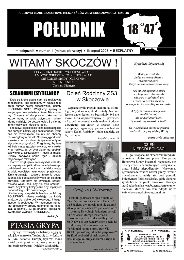 PUBLICYSTYCZNE CZASOPISMO MIESZKAÑCÓW ZIEMI SKOCZOWSKIEJ I OKOLIC miesiêcznik numer -1 (minus pierwszy) listopad 2005 18 47 ‘ POLUDNIK BEZP£ATNY WITAMY SKOCZÓW ! Krajobraz Skoczowski LECZ LUDZI DOBREJ WOLI JEST WIÊCEJ I MOCNO WIERZÊ W TO ¯E TEN ŒWIAT NIE ZGINIE NIGDY DZIÊKI NIM NIE! NIE! NIE! (Czes³aw Niemen) Widzê ju¿ z bliska jad¹c od strony Bielska wieczorn¹ pora Krzy¿ na Kaplicówce oœwietlony Krok po kroku udaje nam siê realizowaæ zamierzenia i oto oddajemy w Wasze rêce drugi numer nowej skoczowskiej gazety PO£UDNIK 18o47’. Wziêliœmy sprawy w swoje rêce i nie jesteœmy bierni. Nie czekamy. Chcemy iœæ do przodu! Jako m³odzi ludzie mamy w sobie optymizm i wiarê. Mamy nadziejê, ¿e bêdzie lepiej. Bo nie ma innej mo¿liwoœci. Musi byæ lepiej. Skoczów i jego okolice to nasze miasto i od nas samych zale¿y jego codziennoœæ. ¯ycie nas nie rozpieszcza, ale my nie chcemy chowaæ g³owy w piasek. Chcemy j¹ podnosiæ wysoko, chodziæ odwa¿nie i patrzeæ optymistycznie w przysz³oœæ. Pragniemy, by taka te¿ by³a nasza gazeta - otwarta, konstruktywna i odwa¿na, by by³a platform¹ spotkañ cz³owieka z cz³owiekiem i myœli z myœl¹. Byœmy podawali sobie rêce i szukali racjonalnych rozwi¹zañ. Bardzo dziêkujemy za wszystkie mi³e s³owa i wyrazy sympatii, które dotar³y do nas po paŸdziernikowym debiucie i nadal docieraj¹. W wielu osobistych rozmowach przyjmowaliœmy gratulacje i szczere ¿yczenia powodzenia. Nie spodziewaliœmy siê tak ciep³ego przyjêcia. Staramy siê zmieniaæ rzeczywistoœæ wokó³ nas, aby nie by³o smutno i szaro. Aby ka¿dy kolejny dzieñ by³ lepszy od poprzedniego. Oto nasza droga. Zachêcamy wszystkich bardzo do lektury PO£UDNIKA. Mamy nadziejê, ¿e ka¿dy znajdzie dla siebie coœ ciekawego, intryguj¹cego i krzepi¹cego. W nastêpnym numerze obiecujemy drobny upominek od Miko³aja, a póŸniej, 23-go grudnia, specjalne, œwi¹teczne wydanie PO£UDNIKA . Redakcja a PTASIA GRYPA (ci¹g dalszy na str. 2) 22 paŸdziernik. Pogoda znakomita. Mimo tego, ¿e jest sobota, idê do szko³y. Nie, nie jestem ¿aden kujon, co bez szko³y ¿yæ nie mo¿e! Dziœ odpracowujemy 31 paŸdziernika, bêdziemy mieæ wtedy wolne. A odpracowujemy ten dzieñ w sposób doœæ nietypowy, organizuj¹c pierwszy w historii szko³y Dzieñ Rodzinny. Mam nadziejê, ¿e bêdzie fajnie... A by³y to zmienne dzieje losu upadki i wzloty ale czuwa³ anio³ z³oty by miasto siê rozros³o i kwit³o Tu w Beskidach otoczone górami nad srebrz¹c¹ siê piêkn¹ Wis³¹ Maria Otylia Hluszczyk (ci¹g dalszy na str. 6) foto. Marzena Moska³a DZIEÑ NIEPODLEG£OŒCI Test na Wiedzê 1) Jak d³ugo trwa³a Wojna Stuletnia? 2) Który kraj robi kapelusze Panama? 3) Z jakiego zwierzêcia robi siê catgut? 4) W jakim miesi¹cu Rosjanie obchodz¹ rocznicê Rewolucji PaŸdziernikowej? 5) Z w³osów którego zwierzêcia zrobiona jest szczotka wielb³¹dzia? 6) Nazwa Wysp Kanaryjskich pochodzi od nazwy którego zwierzêcia? 7) Jak mia³ na imiê król Jerzy VI? 8) Jakiego koloru jest ziêba purpurowa? 9) Sk¹d pochodzi chiñski agrest? 10) Jakiego koloru jest czarna skrzynka w samolocie (odpowiedzi na str. 31) 11-go listopada, na skoczowskim rynku, raportem z³o¿onym przez Kompaniê Honorow¹ Stra¿y Po¿arnej, rozpoczê³y siê uroczystoœci upamiêtniaj¹ce odzyskanie przez Polskê niepodleg³oœci. Nastêpnie, zgromadzone w³adze naszej gminy, wraz z mieszkañcami, uda³y siê pod pomnik Poleg³ym za Polskoœæ Œl¹ska, gdzie z³o¿ono symboliczne wi¹zanki kwiatów. Uroczystoœæ zakoñczy³a siê nabo¿eñstwem ekumenicznym, które w tym roku odby³o siê w koœciele ewangelicko-augsburskim. A W NUMERZE... ! A W NUMERZE... ! KONKURS !!! - str. 4 LOTERIA FANTOWA - str. 14 KRZY¯ÓWKI I HUMOR - str. 30 WOJNA W SKOCZOWIE - str. 27 FOTORELACJA “ONLY BREAKE” - str. 28 WYWIAD Z PANEM JÓZEFEM PALOWSKIM - str.18 A W NUMERZE... A W NUMERZE... A W NUMERZE... Chyba jeszcze nigdy nie baliœmy siê grypy tak, jak w tym roku. Trudno siê dziwiæ, skoro w tym sezonie Europejczyków mo¿e zaatakowaæ ptasi wirus, który zebra³ ju¿ œmiertelne ¿niwo na Dalekim Wschodzie. Tak mi jest ogromnie bliski ten krajobraz skoczowski wiatr co w ga³êziach gra i rzeka co z cicha szemrze o dziejach skoczowskiej spo³ecznoœci Dzieñ Rodzinny ZS3 w Skoczowie A W NUMERZE... SZANOWNI CZYTELNICY PO£UDNIK 18o47’ POWIEDZ GRYPIE NIE!!!! “Cz³owiek m¹dry czasem zmienia zdanie, g³upiec nigdy” (ci¹g dalszy ze str. 1) K iedy epidemia jakieœ choroby opanowuje œwiat, fachowcy nazywaj¹ j¹ pandemi¹.Epidemiolodzy otwarcie przyznaj¹, ¿e dziœ grozi nam w³aœnie pandemia niebezpiecznej dla cz³owieka ptasiej grypy. N a pocz¹tku XX w. Œwiat prze¿y³ ju¿ pandemiê grypy. Nazwano j¹ hiszpank¹. Poch³onê³a 50 mln osób. Prawdziwy kataklizm, jeœli zwa¿yæ, ¿e w czasie I wojny œwiatowej zginê³o 8 mln ludzi. ¯eby zapobiec podobnej sytuacji w przysz³oœci, w 1945r. Œwiatowa Organizacja Zdrowia (WHO) stworzy³a miêdzynarodowy program nadzoru grypy. Na ka¿dym kontynencie powsta³ oœrodek zbieraj¹cy informacje o nowych wirusach i ich rozprzestrzenianiu siê. Kontynentalne centra informacji o grypie wspó³pracuj¹ ze 114 oœrodkami krajowymi. W³aœnie dziêki temu mo¿liwe jest dziœ produkowanie szczepionek przeciwko grypie. Wirus grypy co roku ma now¹ postaæ. Jeœli wiêc gdzieœ na Wschodzie pojawi siê jego nowa odmiana, wytwarza siê now¹ szczepionkê i rozprowadza siê j¹ na Zachodzie, nim dotrze tu sam wirus. W³aœnie dlatego tak Irlandia ProwadŸ do siebie. Powietrze drewniane jak zegar obraca w tarczy krzywa ga³¹Ÿ, dzwon œwiszcze pusty, okna obsiad³y balkony. Dom trzeba by³o opuœciæ, dom w zwierciad³ach zwêglony i ruszyæ w niem¹ pielgrzymkê do grobu cz³owieka którego siê nie zna³o. JUDYTA WATO£A Ptasia grypa znana jest od 1901r., ale dopiero w 1955r. Zidentyfikowano wywo³uj¹cy j¹ wirus. Wystêpuje w ró¿nych odmianach, które wywo³u