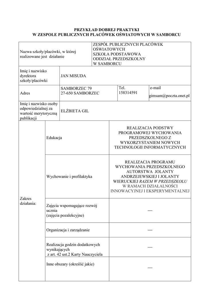 PRZYKŁAD DOBREJ PRAKTYKI W ZESPOLE PUBLICZNYCH PLACÓWEK OŚWIATOWYCH W SAMBORCU Nazwa szkoły/placówki, w której realizowane jest działanie Imię i nazwisko dyrektora szkoły/placówki Adres ZESPÓŁ PUBLICZNYCH PLACÓWEK OŚWIATOWYCH SZKOŁA PODSTAWOWA ODDZIAŁ PRZEDSZKOLNY W SAMBORCU JAN MISUDA SAMBORZEC 79 27-650 SAMBORZEC Tel. 158314591 e-mail [email protected] Imię i nazwisko osoby odpowiedzialnej za ELŻBIETA GIL wartość merytoryczną publikacji Edukacja Wychowanie i profilaktyka Zakres działania: REALIZACJA PODSTWY PROGRAMOWEJ WYCHOWANIA PRZEDSZKOLNEGO Z WYKORZYSTANIEM NOWYCH TECHNOLOGII INFORMATYCZNYCH REALIZACJA PROGRAMU WYCHOWANIA PRZEDSZKOLNEGO AUTORSTWA JOLANTY ANDRZEJEWSKIEJ I JOLANTY WIERUCKIEJ RAZEM W PRZEDSZKOLU W RAMACH DZIAŁALNOŚCI INNOWACYJNEJ I EKSPERYMENTALNEJ Zajęcia wspomagające rozwój ucznia (zajęcia pozalekcyjne) ⎯ Organizacja i zarządzanie ⎯ Realizacja godzin dodatkowych wynikających z art. 42 ust.2 Karty Nauczyciela ⎯ Inne obszary (określić jakie) ⎯ Temat działania: ZABAWY Z KOMPUTEREM Cele działania: - doskonalenie umiejętności pracy z wykorzystaniem nowoczesnych technologii (tablica interaktywna, wizualizer, komputer, ); - rozwijanie umiejętności twórczego myślenia, zdolności kojarzenia i spostrzegawczości; - wspomaganie dzieci w rozwijaniu uzdolnień oraz kształtowanie czynności intelektualnych potrzebnych im w codziennych sytuacjach i w dalszej edukacji; - kształtowanie u dzieci odporności emocjonalnej koniecznej do racjonalnego radzenia sobie w nowych i trudnych sytuacjach, w tym także do łagodnego znoszenia stresów i porażek; - stwarzanie warunków sprzyjających wspólnej i zgodnej zabawie oraz nauce dzieci o zróżnicowanych możliwościach fizycznych i intelektualnych; - budowanie dziecięcej wiedzy o świecie społecznym, przyrodniczym i technicznym oraz rozwijanie umiejętności prezentowania swoich przemyśleń w sposób zrozumiały dla innych; - zapewnienie dzieciom lepszych szans edukacyjnych poprzez wspieranie ich ciekawości, aktywności i samodzielności, a także kształtowanie tych wiadomości i umiejętności, które są ważne w edukacji szkolnej; - rozwijanie umiejętności współpracy w grupie, integracja z grupą. Opis działania: Technologia informacyjna wraz z technologią komunikacyjną jest obecnie nieodzownym elementem wspierania edukacji. Stanowi ona jeden z ważnych czynników wpływających na uatrakcyjnienie zajęć. Co najmniej raz w tygodniu lub w miarę potrzeb organizuję zajęcia komputerowe dla dzieci, w trakcie których realizuję aktualny temat zajęć zgodny z rozkładem materiału. W pracy z dziećmi przedszkolnymi bardzo często korzystam z komputera oraz technologii informacyjnych.. Na zajęciach wykorzystuję komputer, wizualizer i tablicę multimedialną. Opracowuję i tworzę różnorodne pomoce dydaktyczne bazując na programach: • program graficzny Paint (tworzenie i edytowanie rysunków); • program do tworzenia prezentacji multimedialnych PowerPoint (tworzenie prezentacji), • multimedialne oprogramowanie edukacyjne SMART Notebook (wykorzystanie technologii komputerowej w edukacji). Korzystam również z programów edukacyjnych dostosowanych do wieku dziecka, tj.: encyklopedie multimedialne, filmy edukacyjne, gry multimedialne oraz ze strony internetowe dla dzieci. W trakcie korzystania z tych programów, dzieci bawiąc się, jednocześnie uczą się i utrwalają zdobyte wiadomości. Zabawy z komputerem dają także dzieciom możliwość rozwijania swoich zainteresowań. W lutym 2011 r. nawiązałam współpracę z portalem internetowym Multimedia w szkole, Multimedia w przedszkolu oraz miesięcznikiem EduFakty, od których wypożyczyłam wizualizer, który wykorzystywałam na zajęciach dydaktycznych oraz w zabawach z dziećmi. Wzięłam również udział w ogólnopolskim konkursie „Umiem uczyć nowocześnie”, w którym zajęłam I miejsce w kategorii Najlepszy scenariusz z wykorzystaniem wizualizera. Opis uzyskanych efektów: W ciągu ostatnich lat komputer stał się powszechnie przeze mnie stosowanym narzędziem pracy. Przynosi to korzyści dzieciom i rodzicom a także przyczynia się do uatrakcyjnienia zajęć dydaktycznych i metod pracy z dziećmi, rozwijania zainteresowań czy unowocześniania procesu edukacyjnego. Dzięki temu poszerzam swoją wiedzę i umiejętności pedagogiczne i udoskonalam swoje umiejętności w zakresie posługiwania się komputerem. Przygotowałam i zgromadziłam także wiele pomocy dydaktycznych, wzbogaciłam swój warsztat pracy oraz nawiązałam kontakt z wydawnictwami i portalami edukacyjnymi. Ponadto zajęcie I miejsca w konkursie ogólnopolskim „Umiem uczyć nowocześnie”, dało mi dużo satysfakcji oraz pozwoliło na pozyskanie sprzętu multimedialnego - wzbogaciłam placówkę w nowe sprzęty multimedialne - wizualizer i rzutnik, z których mogą korzystać również uczniowie z całego Zespołu Publicznych Placówek Oświatowych w Samborcu. Wykorzystanie i doskonalenie umiejętności stosowania technologii informacyjno – komunikacyjnej, pomaga mi w podnoszeniu poziomu swojej pracy, w doskonaleniu i podwyższaniu jakości pracy szkoły a także promowaniu szkoły w szerszym środowisku. Wnioski z realizacji: Korzystanie z nowych technologii komputerowych czyni zajęcia bardziej atrakcyjnymi dla dzieci i podwyższa ich skuteczność motywuje do aktywnej pracy a także umożliwia dzieciom przedszkolnym łatwiejsze przekraczanie progu szkolnego. Systematyczne wykorzystywanie technologii komputerowej i informacyjnej jest prostym i bogatym sposobem wspierania procesów oddziaływań edukacyjno – wychowawczych. Staram się maksymalnie wykorzystywać i doskonalić umiejętność stosowania technologii informacyjno – komunikacyjnej, gdyż wykorzystanie komputera i innych nowości technicznych w pracy z dziećmi jest bardzo pomocne - ułatwia pracę i stanowi wygodę. Mam świadomość, że jeszcze wiele mogę i powi