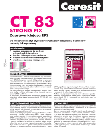 CT 83 STRONG FIX Zaprawa klejąca EPS CERESIT CT_83_KT_03.14 Do mocowania płyt styropianowych przy ocieplaniu budynków metodą lekką-mokrą WŁAŚCIWOŚCI wysoce przyczepna do podłoży mineralnych i styropianu bardzo dobre parametry robocze odporna na warunki atmosferyczne możliwość aplikacji maszynowej ZASTOSOWANIE Zaprawa Ceresit CT 83 służy do przyklejania płyt styropianowych w ramach złożonego systemu ocieplania ścian zewnętrznych (ETICS) budynków metodą lekką-mokrą w systemach Ceresit Ceretherm. Jest odpowiednia zarówno do obiektów nowo wznoszonych, jak i poddawanych termorenowacji. Przyklejone zaprawą płyty wymagają dodatkowego mocowania łącznikami mechanicznymi tj. odpowiednimi kołkami rozprężnymi z tworzywa sztucznego. Do wykonywania na płytach styropianowych warstwy zbrojonej siatką z włókna szklanego należy stosować zaprawę Ceresit CT 85 lub CT 87. W przypadku ocieplania ścian fasadowymi płytami z wełny mineralnej należy używać zaprawy Ceresit CT 190, CT 180 lub CT 87. PRZYGOTOWANIE PODŁOŻA Zaprawa CT 83 wykazuje dobrą przyczepność do podłoży nośnych, zwartych, suchych np. powierzchni murów, tynków i betonów wolnych od substancji zmniejszających przyczepność (takich jak tłuszcze, bitumy, pyły). Należy sprawdzić przyczepność istniejących tynków i powłok malarskich. „Głuche” tynki trzeba odkuć. Ubytki i nierówności podłoża poniżej 20 mm należy wypełnić szpachlówką CT 29 lub pokryć tynkiem cementowym. Zabrudzenia, resztki substancji antyadhezyjnych, paroszczelne powłoki malarskie i powłoki o niskiej przyczepności do podłoża należy usunąć całkowicie, np. za pomocą myjek ciśnieniowych. Miejsca będące siedliskiem mchów i glonów należy oczyścić szczotkami stalowymi, a następnie nasycić roztworem preparatu Ceresit CT 99, zgodnie z jego instrukcją techniczną. Stare, nieotynkowane mury, odpowiednio mocne tynki i powłoki malarskie należy obmieść z kurzu, a potem zmyć wodą pod ciśnieniem i pozostawić do całkowitego wyschnięcia. Podłoża o dużej nasiąkliwości, np. mury z bloczków gazobetonowych czy silikatowych, należy obficie zagruntować preparatem Ceresit CT 17 i pozostawić do wyschnięcia, przez co najmniej 2 godziny. WYKONANIE Do odmierzonej ilości czystej, chłodnej wody wsypywać CT 83 i mieszać za pomocą wiertarki z mieszadłem, aż do uzyskania jednorodnej masy bez grudek. Gotową zaprawę należy nakładać kielnią po obwodzie płyty pasmem o szerokości 3÷4 cm i kilkoma plackami o średnicy ok. 8cm. Bezzwłocznie przyłożyć płytę do ściany i docisnąć uderzeniami długiej pacy. Prawidłowo nałożona zaprawa, po dociśnięciu płyty, pokrywa minimum 40% jej powierzchni. W przypadku równych, gładkich podłoży, zaprawę można nakładać na płyty za pomocą pacy zębatej (zęby 10–12 mm). Płyty styropianowe należy mocować ściśle jedna przy drugiej, w jednej płaszczyźnie, z zachowaniem mijankowego układu styków pionowych. UWAGA Prace należy wykonywać w suchych warunkach, przy temperaturze otoczenia i podłoża od +5°C do +25°C. Wszelkie dane odnoszą się do temperatury +20°C oraz wilgotności względnej powietrza 60%. W innych warunkach należy uwzględnić szybsze lub wolniejsze wiązanie materiału. Sypka zaprawa ma właściwości drażniące, a zawartość cementu i wapna powoduje, że wyrób zmieszany z wodą ma odczyn alkaliczny. W związku z tym należy chronić naskórek i oczy. Zabrudzenia myć wodą. W przypadku kontaktu materiału z oczami płukać je obficie wodą i zasięgnąć porady lekarza. Właściwości użytkowe podane są w treści odpowiadającej wyrobowi Deklaracji Właściwości Użytkowych. Zawartość chromu VI – poniżej 2 ppm w okresie ważności wyrobu. SKŁADOWANIE Do 12 miesięcy od daty produkcji, przy składowaniu na paletach, w suchych warunkach i w oryginalnych, nieuszkodzonych opakowaniach. OPAKOWANIA Worki 25 kg. DANE TECHNICZNE Baza: mieszanka cementowo-wapienna z wypełniaczami mineralnymi i modyfikatorami Gęstość nasypowa: ok.1,3 kg/dm3 Proporcje mieszania: 4,75-5,25 l wody na 25 kg Temperatura stosowania: od +5°C do +25°C Czas zużycia: do 90 min Przyczepność: do betonu do styropianu > 0,6 MPa > 0,1 MPa (rozerwanie w warstwie styropianu) Ocena promieniotwórczości naturalnej: ZALECENIA Szczegóły dotyczące prac ociepleniowych opisane są w Instrukcji ITB nr 418/2007 oraz 447/2009. Niniejsza karta techniczna określa zakres stosowania materiału i zalecany sposób prowadzenia robót, ale nie może zastąpić zawodowego przygotowania wykonawcy. Oprócz podanych zaleceń prace należy wykonywać zgodnie ze sztuką budowlaną i zasadami BHP. Producent gwarantuje jakość wyrobu, natomiast nie ma wpływu na warunki i sposób jego użycia. W przypadku wątpliwości należy wykonać własne próby stosowania. Wraz z ukazaniem się tej karty technicznej tracą ważność karty wcześniejsze. Orientacyjne zużycie: spełnia wymagania określone w Instrukcji ITB nr 234/2003,p.6.2.1- zgodnie z Rozporządzeniem Rady Ministrów z dnia 2 stycznia 2007r.&3, p.1 ok. 5,0 kg/m2 Wyrób posiada następujące dokumenty odniesienia: - Atest Higieniczny PZH w systemie: Ceresit Ceretherm CLASSIC nr. AH/B/1352/01/2009 Ceresit Ceretherm PREMIUM nr. AH/B/1352/04/2009 - Europejską Aprobatę Techniczną ETA w systemach: System Ceresit Ceretherm Classic Classic (R) Classic (B) Classic (S) Classic (E) Premium Premium (B) Visage ETA 09/0014 09/0095 09/0097 09/0096 10/0228 08/0308 09/0137 11/0395 1488-CPD- 1488-CPD- 1488-CPD- 1488-CPD- 1488-CPD- 0108/W 0107/W 0110/W 1488-CPD0200/W 1488-CPD- 0104/W 0103/W 0109/W 1488-CPD0237/W 00420 00462 00421 00423 00422 00428 00429 00431 Certyfikat DWU - Aprobatę Techniczną w systemach: System Ceresit Ceretherm AT Certyfikat D.Z.: Ceresit Ceretherm Classic Premium Ceramic Reno Visage 15-4397/2013 15-6986 /2008 + Aneksy 15-7027/2011 15-8077 /2009 + Aneksy 15-8399/2011 ITB-0109/Z
