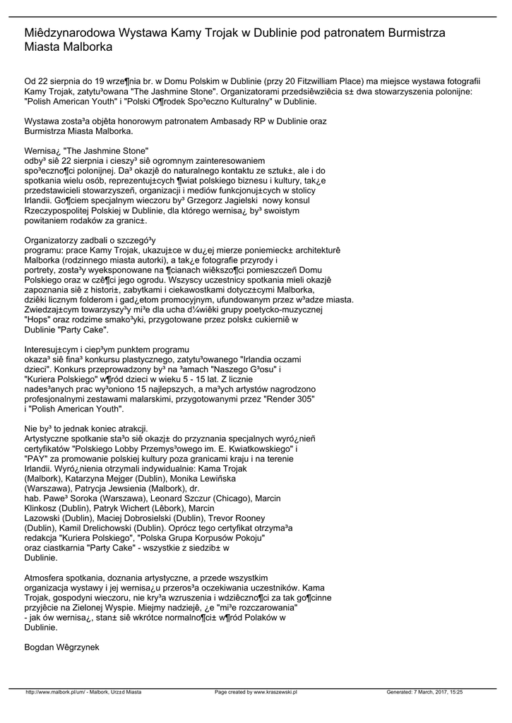 Miêdzynarodowa Wystawa Kamy Trojak w Dublinie pod patronatem Burmistrza Miasta Malborka Od 22 sierpnia do 19 wrze¶nia br. w Domu Polskim w Dublinie (przy 20 Fitzwilliam Place) ma miejsce wystawa fotografii Kamy Trojak, zatytu³owana "The Jashmine Stone". Organizatorami przedsiêwziêcia s± dwa stowarzyszenia polonijne: "Polish American Youth" i "Polski O¶rodek Spo³eczno Kulturalny" w Dublinie. Wystawa zosta³a objêta honorowym patronatem Ambasady RP w Dublinie oraz Burmistrza Miasta Malborka. Wernisa¿ "The Jashmine Stone" odby³ siê 22 sierpnia i cieszy³ siê ogromnym zainteresowaniem spo³eczno¶ci polonijnej. Da³ okazjê do naturalnego kontaktu ze sztuk±, ale i do spotkania wielu osób, reprezentuj±cych ¶wiat polskiego biznesu i kultury, tak¿e przedstawicieli stowarzyszeñ, organizacji i mediów funkcjonuj±cych w stolicy Irlandii. Go¶ciem specjalnym wieczoru by³ Grzegorz Jagielski nowy konsul Rzeczypospolitej Polskiej w Dublinie, dla którego wernisa¿ by³ swoistym powitaniem rodaków za granic±. Organizatorzy zadbali o szczegó³y programu: prace Kamy Trojak, ukazuj±ce w du¿ej mierze poniemieck± architekturê Malborka (rodzinnego miasta autorki), a tak¿e fotografie przyrody i portrety, zosta³y wyeksponowane na ¶cianach wiêkszo¶ci pomieszczeñ Domu Polskiego oraz w czê¶ci jego ogrodu. Wszyscy uczestnicy spotkania mieli okazjê zapoznania siê z histori±, zabytkami i ciekawostkami dotycz±cymi Malborka, dziêki licznym folderom i gad¿etom promocyjnym, ufundowanym przez w³adze miasta. Zwiedzaj±cym towarzyszy³y mi³e dla ucha d¼wiêki grupy poetycko-muzycznej "Hops" oraz rodzime smako³yki, przygotowane przez polsk± cukierniê w Dublinie "Party Cake". Interesuj±cym i ciep³ym punktem programu okaza³ siê fina³ konkursu plastycznego, zatytu³owanego "Irlandia oczami dzieci". Konkurs przeprowadzony by³ na ³amach "Naszego G³osu" i "Kuriera Polskiego" w¶ród dzieci w wieku 5 - 15 lat. Z licznie nades³anych prac wy³oniono 15 najlepszych, a ma³ych artystów nagrodzono profesjonalnymi zestawami malarskimi, przygotowanymi przez "Render 305" i "Polish American Youth". Nie by³ to jednak koniec atrakcji. Artystyczne spotkanie sta³o siê okazj± do przyznania specjalnych wyró¿nieñ certyfikatów "Polskiego Lobby Przemys³owego im. E. Kwiatkowskiego" i "PAY" za promowanie polskiej kultury poza granicami kraju i na terenie Irlandii. Wyró¿nienia otrzymali indywidualnie: Kama Trojak (Malbork), Katarzyna Mejger (Dublin), Monika Lewiñska (Warszawa), Patrycja Jewsienia (Malbork), dr. hab. Pawe³ Soroka (Warszawa), Leonard Szczur (Chicago), Marcin Klinkosz (Dublin), Patryk Wichert (Lêbork), Marcin Lazowski (Dublin), Maciej Dobrosielski (Dublin), Trevor Rooney (Dublin), Kamil Drelichowski (Dublin). Oprócz tego certyfikat otrzyma³a redakcja "Kuriera Polskiego", "Polska Grupa Korpusów Pokoju" oraz ciastkarnia "Party Cake" - wszystkie z siedzib± w Dublinie. Atmosfera spotkania, doznania artystyczne, a przede wszystkim organizacja wystawy i jej wernisa¿u przeros³a oczekiwania uczestników. Kama Trojak, gospodyni wieczoru, nie kry³a wzruszenia i wdziêczno¶ci za tak go¶cinne przyjêcie na Zielonej Wyspie. Miejmy nadziejê, ¿e "mi³e rozczarowania" - jak ów wernisa¿, stan± siê wkrótce normalno¶ci± w¶ród Polaków w Dublinie. Bogdan Wêgrzynek http://www.malbork.pl/um/ - Malbork, Urz±d Miasta Page created by www.kraszewski.pl Generated: 7 March, 2017, 15:25 http://www.malbork.pl/um/ - Malbork, Urz±d Miasta Page created by www.kraszewski.pl Generated: 7 March, 2017, 15:25