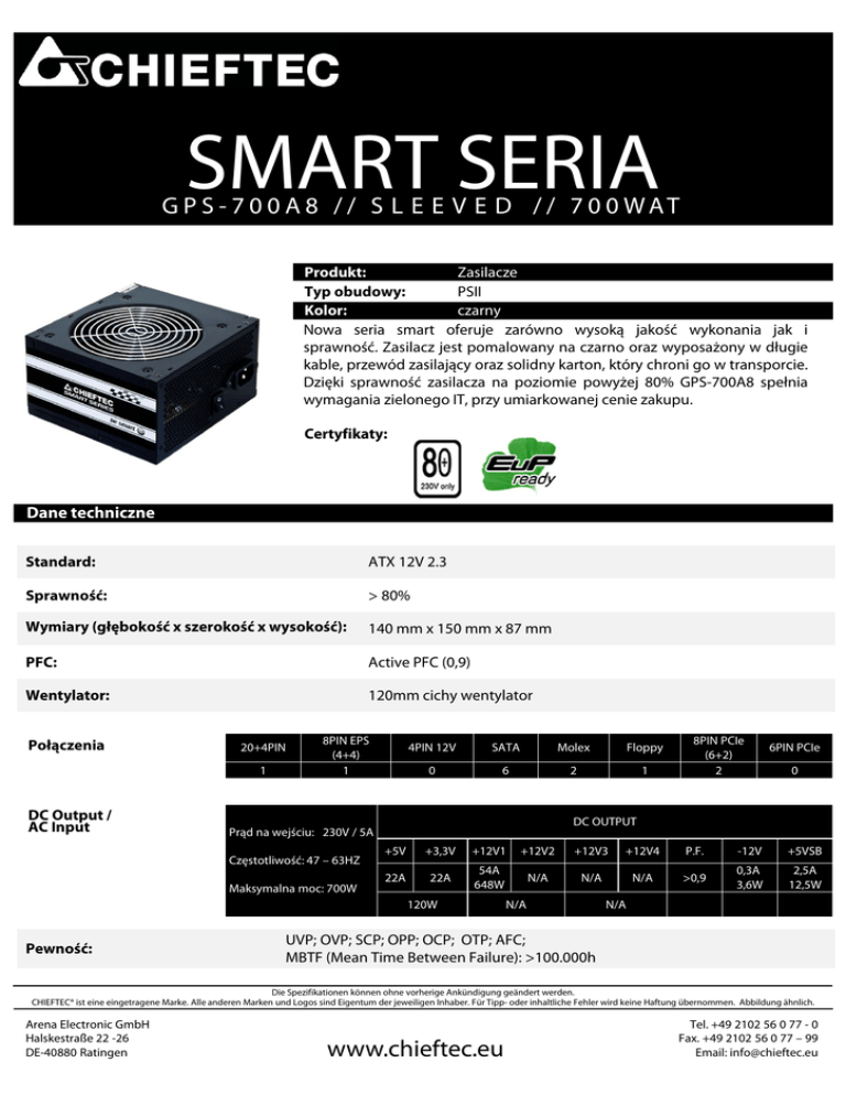 SMART SERIA G P S - 7 0 0 A 8 / / S L E E V E D / / 7 0 0 WAT Produkt: Zasilacze Typ obudowy:Ko PSII Kolor: czarny Nowa seria smart oferuje zarówno wysoką jakość wykonania jak i sprawność. Zasilacz jest pomalowany na czarno oraz wyposażony w długie kable, przewód zasilający oraz solidny karton, który chroni go w transporcie. Dzięki sprawność zasilacza na poziomie powyżej 80% GPS-700A8 spełnia wymagania zielonego IT, przy umiarkowanej cenie zakupu. Certyfikaty: Dane techniczne Standard: ATX 12V 2.3 Sprawność: > 80% Wymiary (głębokość x szerokość x wysokość): 140 mm x 150 mm x 87 mm PFC: Active PFC (0,9) Wentylator: 120mm cichy wentylator Połączenia 20+4PIN 1 DC Output / AC Input 8PIN EPS (4+4) 1 4PIN 12V SATA Molex Floppy 0 6 2 1 6PIN PCIe 0 DC OUTPUT Prąd na wejściu: 230V / 5A Częstotliwość: 47 – 63HZ +5V +3,3V +12V1 +12V2 +12V3 +12V4 P.F. -12V +5VSB 22A 22A 54A 648W N/A N/A N/A >0,9 0,3A 3,6W 2,5A 12,5W Maksymalna moc: 700W 120W Pewność: 8PIN PCIe (6+2) 2 N/A N/A UVP; OVP; SCP; OPP; OCP; OTP; AFC; MBTF (Mean Time Between Failure): >100.000h Die Spezifikationen können ohne vorherige Ankündigung geändert werden. CHIEFTEC® ist eine eingetragene Marke. Alle anderen Marken und Logos sind Eigentum der jeweiligen Inhaber. Für Tipp- oder inhaltliche Fehler wird keine Haftung übernommen. Abbildung ähnlich. Arena Electronic GmbH Halskestraße 22 -26 DE-40880 Ratingen www.chieftec.eu Tel. +49 2102 56 0 77 - 0 Fax. +49 2102 56 0 77 – 99 Email: [email protected]