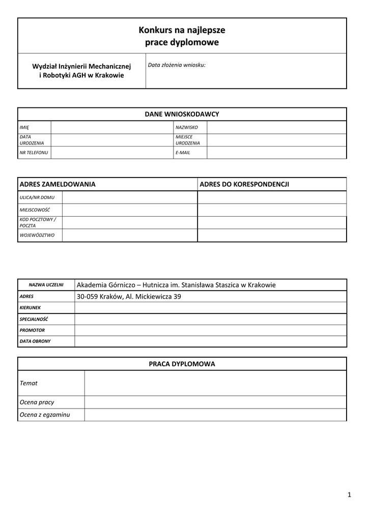Konkurs na najlepsze prace dyplomowe Wydział Inżynierii Mechanicznej i Robotyki AGH w Krakowie Data złożenia wniosku: DANE WNIOSKODAWCY IMIĘ NAZWISKO DATA URODZENIA MIEJSCE URODZENIA NR TELEFONU E-MAIL ADRES ZAMELDOWANIA ADRES DO KORESPONDENCJI ULICA/NR DOMU MIEJSCOWOŚĆ KOD POCZTOWY / POCZTA WOJEWÓDZTWO NAZWA UCZELNI ADRES Akademia Górniczo – Hutnicza im. Stanisława Staszica w Krakowie 30-059 Kraków, Al. Mickiewicza 39 KIERUNEK SPECJALNOŚĆ PROMOTOR DATA OBRONY PRACA DYPLOMOWA Temat Ocena pracy Ocena z egzaminu 1 STRESZCZENIE PRACY DYPLOMOWEJ: LISTA ZAŁĄCZNIKÓW Nr załącznika Załącznik Lp. 1 Recenzje: promotora pracy oraz recenzenta 2 Praca w wersji drukowanej 3 Praca na nośniku elektronicznym (np. CD) 4 Zaświadczenie potwierdzające ocenę uzyskaną z pracy dyplomowej (np. Protokół z obrony) 5 6 7 8 _________________________ Miejscowość, data __________________________ czytelny podpis 2