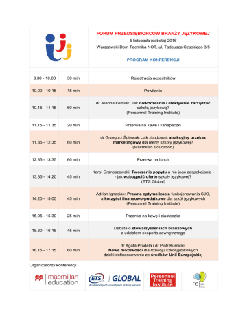 FORUM PRZEDSIĘBIORCÓW BRANŻY JĘZYKOWEJ 5 listopada (sobota) 2016 Warszawski Dom Technika NOT, ul. Tadeusza Czackiego 3/5 PROGRAM KONFERENCJI 9.30 - 10.00 30 min Rejestracja uczestników 10.00 - 10.15 15 min Powitanie 10.15 - 11.15 60 min dr Joanna Femiak: Jak nowocześnie i efektywnie zarządzać szkołą językową? (Personnel Training Institute) 11.15 - 11.35 20 min Przerwa na kawę i kanapeczki 11.35 - 12.35 60 min dr Grzegorz Śpiewak: Jak zbudować atrakcyjny przekaz marketingowy dla oferty szkoły językowej? (Macmillan Education) 12.35 - 13.35 60 min Przerwa na lunch 13.35 - 14.20 45 min Karol Granoszewski: Tworzenie popytu a nie jego zaspokajanie - jak wzbogacić ofertę szkoły językowej? (ETS Global) 14.20 - 15.05 45 min Adrian Ignasiak: Prawna optymalizacja funkcjonowania SJO, a korzyści finansowo-podatkowe dla szkół językowych (Personnel Training Institute) 15.05 - 15.30 25 min Przerwa na kawę i ciasteczka 15.30 - 16.15 45 min Debata o stowarzyszeniach branżowych z udziałem eksperta zewnętrznego 16.15 - 17.15 60 min dr Agata Pradela i dr Piotr Kurnicki: Nowe możliwości dla rozwoju szkół językowych dzięki dofinansowaniu ze środków Unii Europejskiej Organizatorzy konferencji