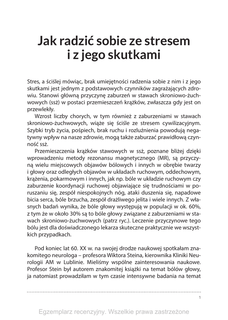 Jak radzić sobie ze stresem i z jego skutkami Stres, a ściślej mówiąc, brak umiejętności radzenia sobie z nim i z jego skutkami jest jednym z podstawowych czynników zagrażających zdrowiu. Stanowi główną przyczynę zaburzeń w stawach skroniowo-żuchwowych (ssż) w postaci przemieszczeń krążków, zwłaszcza gdy jest on przewlekły. Wzrost liczby chorych, w tym również z zaburzeniami w stawach skroniowo-żuchwowych, wiąże się ściśle ze stresem cywilizacyjnym. Szybki tryb życia, pośpiech, brak ruchu i rozluźnienia powodują negatywny wpływ na nasze zdrowie, mogą także zaburzać prawidłową czynność ssż. Przemieszczenia krążków stawowych w ssż, poznane bliżej dzięki wprowadzeniu metody rezonansu magnetycznego (MR), są przyczyną wielu miejscowych objawów bólowych i innych w obrębie twarzy i głowy oraz odległych objawów w układach ruchowym, oddechowym, krążenia, pokarmowym i innych, jak np. bóle w układzie ruchowym czy zaburzenie koordynacji ruchowej objawiające się trudnościami w poruszaniu się, zespół niespokojnych nóg, ataki duszenia się, napadowe bicia serca, bóle brzucha, zespół drażliwego jelita i wiele innych. Z własnych badań wynika, że bóle głowy występują w populacji w ok. 60%, z tym że w około 30% są to bóle głowy związane z zaburzeniami w stawach skroniowo-żuchwowych (patrz ryc.). Leczenie przyczynowe tego bólu jest dla doświadczonego lekarza skuteczne praktycznie we wszystkich przypadkach. Pod koniec lat 60. XX w. na swojej drodze naukowej spotkałam znakomitego neurologa – profesora Wiktora Steina, kierownika Kliniki Neurologii AM w Lublinie. Mieliśmy wspólne zainteresowania naukowe. Profesor Stein był autorem znakomitej książki na temat bólów głowy, ja natomiast prowadziłam w tym czasie intensywne badania na temat 1 Egzemplarz recenzyjny. Wszelkie prawa zastrzeżone