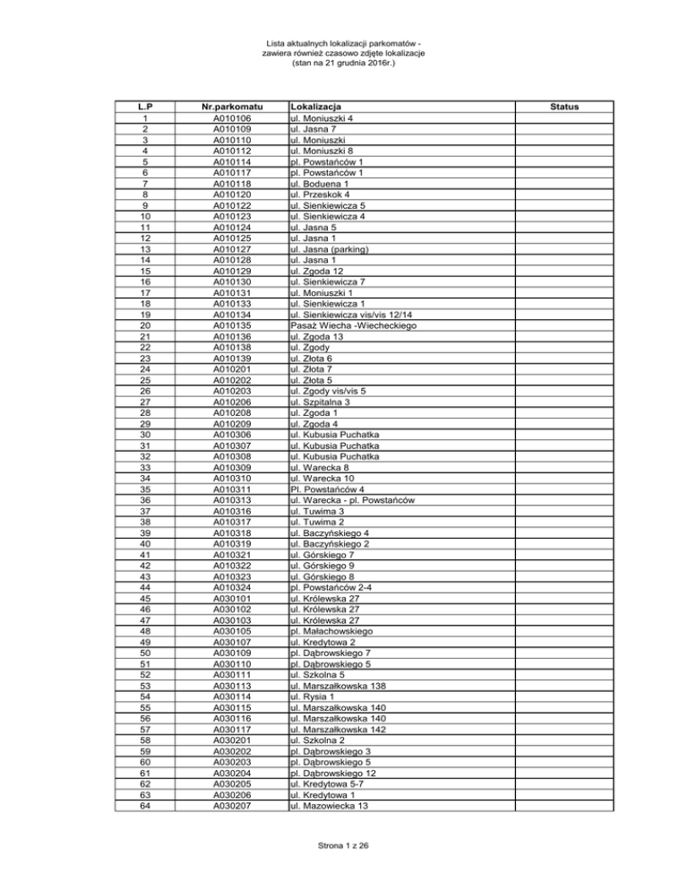 Lista aktualnych lokalizacji parkomatów zawiera również czasowo zdjęte lokalizacje (stan na 21 grudnia 2016r.) L.P 1 2 3 4 5 6 7 8 9 10 11 12 13 14 15 16 17 18 19 20 21 22 23 24 25 26 27 28 29 30 31 32 33 34 35 36 37 38 39 40 41 42 43 44 45 46 47 48 49 50 51 52 53 54 55 56 57 58 59 60 61 62 63 64 Nr.parkomatu A010106 A010109 A010110 A010112 A010114 A010117 A010118 A010120 A010122 A010123 A010124 A010125 A010127 A010128 A010129 A010130 A010131 A010133 A010134 A010135 A010136 A010138 A010139 A010201 A010202 A010203 A010206 A010208 A010209 A010306 A010307 A010308 A010309 A010310 A010311 A010313 A010316 A010317 A010318 A010319 A010321 A010322 A010323 A010324 A030101 A030102 A030103 A030105 A030107 A030109 A030110 A030111 A030113 A030114 A030115 A030116 A030117 A030201 A030202 A030203 A030204 A030205 A030206 A030207 Lokalizacja ul. Moniuszki 4 ul. Jasna 7 ul. Moniuszki ul. Moniuszki 8 pl. Powstańców 1 pl. Powstańców 1 ul. Boduena 1 ul. Przeskok 4 ul. Sienkiewicza 5 ul. Sienkiewicza 4 ul. Jasna 5 ul. Jasna 1 ul. Jasna (parking) ul. Jasna 1 ul. Zgoda 12 ul. Sienkiewicza 7 ul. Moniuszki 1 ul. Sienkiewicza 1 ul. Sienkiewicza vis/vis 12/14 Pasaż Wiecha -Wiecheckiego ul. Zgoda 13 ul. Zgody ul. Złota 6 ul. Złota 7 ul. Złota 5 ul. Zgody vis/vis 5 ul. Szpitalna 3 ul. Zgoda 1 ul. Zgoda 4 ul. Kubusia Puchatka ul. Kubusia Puchatka ul. Kubusia Puchatka ul. Warecka 8 ul. Warecka 10 Pl. Powstańców 4 ul. Warecka - pl. Powstańców ul. Tuwima 3 ul. Tuwima 2 ul. Baczyńskiego 4 ul. Baczyńskiego 2 ul. Górskiego 7 ul. Górskiego 9 ul. Górskiego 8 pl. Powstańców 2-4 ul. Królewska 27 ul. Królewska 27 ul. Królewska 27 pl. Małachowskiego ul. Kredytowa 2 pl. Dąbrowskiego 7 pl. Dąbrowskiego 5 ul. Szkolna 5 ul. Marszałkowska 138 ul. Rysia 1 ul. Marszałkowska 140 ul. Marszałkowska 140 ul. Marszałkowska 142 ul. Szkolna 2 pl. Dąbrowskiego 3 pl. Dąbrowskiego 5 pl. Dąbrowskiego 12 ul. Kredytowa 5-7 ul. Kredytowa 1 ul. Mazowiecka 13 Strona 1 z 26 Status Lista aktualnych lokalizacji parkomatów zawiera również czasowo zdjęte lokalizacje (stan na 21 grudnia 2016r.) 65 66 67 68 69 70 71 72 73 74 75 76 77 78 79 80 81 82 83 84 85 86 87 88 89 90 91 92 93 94 95 96 97 98 99 100 101 102 103 104 105 106 107 108 109 110 111 112 113 114 115 116 117 118 119 120 121 122 123 124 125 126 127 128 129 130 A030208 A030209 A030215 A030216 A030301 A030302 A030304 A030305 A030306 A030307 A030308 A030309 A030310 A030311 A030401 A030402 A030403 A030404 A030405 A030406 A030407 A030408 A030409 A030410 A030415 A070101 A070102 A070104 A070105 A070106 A070107 A070108 A070109 A070111 A070113 A070114 A070116 A070118 A070119 A070121 A070123 A070124 A070125 A070126 A070127 A070128 A070130 A070131 A070132 A070201 A070202 A070203 A070204 A070205 A070206 A070207 A070209 A070210 A070214 A070215 A070216 A070218 A070219 A070220 A070221 A070223 ul. Mazowiecka 11 ul. Mazowiecka 3-5 pl. Dąbrowskiego 1 pl. Dąbrowskiego 2-4 ul. Królewska 1-7 ul. Królewska 1-7 ul. Traugutta - Krak. Przedm. ul. Traugutta ul. Pasaż Niżyńskiego ul. Pasaż Niżyńskiego ul. Pasaż Niżyńskiego ul. Pasaż Niżyńskiego ul. Traugutta pl. Małachowskiego 2 ul. Traugutta 3 ul. Traugutta 5a ul. Czackiego 21-23 ul. Czackiego 21-23 ul. Czackiego 21-23 ul. Czackiego 15-17 ul. Czackiego 7-11 ul. Dowcip ul. Czackiego 7-11 ul. Czackiego 3-5 ul. Krakowskie Przedm.Kościół al. Solidarności 77 ul. Bielańska 5 ul. Corazziego 2 ul. Corazziego 5 ul. Bielańska 3 ul. Bielańska 1 ul. Senatorska 20 ul. Senatorska 24 ul. Senatorska 28 ul. Senatorska 30 ul. Senatorska 38 ul. Senatorska 37 ul. Senatorska 35 ul. Senatorska 27 ul. Wierzbowa 3 ul. Canaletta 4 ul. Canaletta 2 ul. Niecała 8 ul. Niecała 12 ul. Fredry 6 ul. Fredry 8 ul. Królewska 23 ul. Królewska 27 ul. Królewska 27 al. Solidarności 71 al. Solidarności 62 "środek" al. Solidarności 71 ul. Bielańska 10 ul. Bielańska 10 ul. Hipoteczna ul. Daniłowiczowska18 ul. Daniłowiczowska 11 ul. Bielańska 6 pl. Teatralny pl. Teatralny pl. Teatralny pl. Teatralny Pl. Teatralny pl. Teatralny pl. Teatralny ul. Moliera 5 Strona 2 z 26 Lista aktualnych lokalizacji parkomatów zawiera również czasowo zdjęte lokalizacje (stan na 21 grudnia 2016r.) 131 132 133 134 135 136 137 138 139 140 141 142 143 144 145 146 147 148 149 150 151 152 153 154 155 156 157 158 159 160 161 162 163 164 165 166 167 168 169 170 171 172 173 174 175 176 177 178 179 180 181 182 183 184 185 186 187 188 189 190 191 192 193 194 195 196 A070226 A070301 A070304 A070305 A070306 A070309 A070310 A070316 A070318 A070319 A110101 A110102 A110103 A110105 A110106 A110107 A110108 A110109 A110110 A110116 A110118 A110119 A110120 A110201 A110202 A110203 A110204 A110206 A110210 A110214 A110215 A110217 A110219 A110224 A110225 A110229 A110230 A110303 A110304 A110306 A110308 A110309 A110310 A110311 A110312 A150101 A150102 A150103 A150104 A150105 A150106 A150109 A150110 A150111 A150112 A150113 A150115 A150116 A150117 A150118 A150119 A150120 A150122 A150124 A150125 A150126 pl. Piłsudskiego 1 ul. Nowy Przejazd ul. Moliera 6 ul. Moliera 2 ul. Trębacka 4 ul. Trębacka 2 ul. Trębacka 3 ul. Tokarzewskiego - Karasz. ul. Tokarzewskiego - Karasz. ul. Królewska 2 pl. Mirowski pl. Mirowski ul. Ptasia 3 pl. Żelaznej Bramy ul. Marszałkowska 111 pl. Mirowski ul. Królewska 14 ul. Królewska ul. Grzybowska 4 al. Jana Pawła II 20 al. Jana Pawła II 26 ul. Twarda 14 ul. Graniczna ul. Królewska 45 ul. Królewska 43 ul. Królewska 29-41 ul. Zielna 49 ul. Zielna 45 pl. Grzybowski 4 pl. Grzybowski 2 ul. Bagno vis/vis 7 ul. Twarda 1 ul. Wallenberga 7 (Kościół) ul. Zielna 37 ul. Marszałkowska 109 ul. Bagno 5 ul. Bagno 3 ul. Emilii Plater 36 ul. Emilii Plater 36 ul. E. Plater 55 ul. Emilii Plater 55 ul. Twarda 8-12 ul. Mariańska ul. Mariańska 5 ul. Twarda v.v 14 ul. Elektoralna 10 ul. Elektoralna 12 ul. Elektoralna 14 Al. Jana Pawła II 32 al. Jana Pawła II 36 al. Jana Pawła II 38 al. Solidarności 113 al. Solidarności 95 ul. Orla 8 ul. Orla 13 ul. Orla 6 ul. Orla 7
