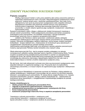 ZDROWY PRACOWNIK SUKCESEM FIRMY Pakiety socjalne Według najnowszych badań z rynku pracy jesteśmy jako polscy pracownicy jednymi z najbardziej zestresowanych ludzi w Europie. Nieprzestrzeganie podstawowych zasad ergonomii, szalone tempo pracy, niezdrowe współzawodnictwo, zbyt mało ruchu, niehigieniczny tryb życia są przyczynami występowania wielu zespołów bólowych. Najczęstszym powodem jest sztywność stawów kończyn oraz dysfunkcje w funkcjonowaniu kręgosłupa. Sytuacja taka powoduje dyskomfort zdrowotny pracownika i w dużym stopniu ogranicza jego wydajność, kreatywność i satysfakcję z wykonywanej pracy. Świadomi pracodawcy zatem, dbając o efektywność działań biznesowych inwestują w zdrowie swoich pracowników. Takie postępowanie pracodawcy jest bardzo pozytywnie postrzegane przez pracowników, ma charakter motywujący i sprzyja budowaniu pozytywnego wizerunku firmy w aspekcie zarządzania personelem. Jesteśmy dla Państwa w stanie opracować i zrealizować pakiety zabiegów rehabilitacyjno-relaksacyjnych eliminujące zespoły bólowe pracowników (np. profesjonalne masaże, ćwiczenia zmniejszające napięcie mięśniowe, aroma terapia, terapia manualna, biofeedback - terapia relaksem etc.), dostosowane do konkretnych grup zawodowych z uwzględnieniem indywidualnych potrzeb każdego pracownika. Jednocześnie wykorzystując efekt skali, przy grupowym zakupie pakietów pracowniczych możemy zaproponować Państwu bardzo korzystne ceny naszych usług. Oferta skierowana jest dla Firm. Jest to program socjalny polegający na zakupie comiesięcznych pakietów według własnego wyboru zgodnie z proponowaną ofertą. Pakiety socjalne są świetną formą podziękowania pracownikom w zamian za zaangażowanie poświęcone firmie, jak również doskonałą formą motywacji dla pracowników. Ponadto umożliwiają aby pracownicy stanowiący najważniejszy kapitał firmy byli cały czas w doskonałej kondycji co również umożliwi zwiększenie wydajności pracy. Zły styl życia, zbyt mało aktywności ruchowej oraz stres są przyczynami występowania wielu zespołów bólowych w organizmie każdego z nas. Przyczynia się to do dyskomfortu zdrowotnego pracownika, a w dużym stopniu do ograniczenia jego wydajności i efektywności w pracy. Prywatne Centrum Rehabilitacji w Łapanowie wychodzi do Państwa z ofertą pakietów na zabiegi rehabilitacyjne i relaksacyjne, przyczyniając się tym samym do eliminacji zespołów bólowych i przeciążeniowych pracowników. W naszej ofercie znajdą Państwo m.in. masaże, ćwiczenia indywidualne i grupowe, zabiegi z zakresu fizykoterapii itp. - dostosowane do konkretnych grup zawodowych, z uwzględnieniem indywidualnego podejścia do potrzeb każdego pracownika. Pakiety rehabilitacyjne to: idealny prezent dla zasłużonych pracowników firmy nagroda w programach lojalnościowych i konkursach podziękowanie pracownikom za zaangażowanie i poświęcenie dla firmy forma motywacji dla pracowników budowanie pozytywnego wizerunku firmy w aspekcie zarządzania personelem • • • • • "inwestycje w zdrowie pracowników = zwiększone zyski mniej zwolnień lekarskich = zwiększona wydajność w pracy lepsza atmosfera w pracy = zwiększone zaufanie do pracodawcy" Zapraszamy do zakupu comiesięcznych pakietów według oferty poniżej. Oferujemy następujący system gratyfikacji: • • • Przy zakupie bonów o wartości 1000 zł - rabat 5% Przy zakupie bonów o wartości 2000 zł – rabat 10% Przy zakupie bonów o wartości 3000 zł - rabat 12% REGULAMIN 1. Pakiety socjalne upoważniają do skorzystania z usług wymienionych w pkt 2. w Prywatnym Centrum Rehabilitacji w Łapanowie zgodnie z aktualnie obowiązującą ofertą i wartością pakietu socjalnego. 2. W skład usług wchodzą: - wizyta u lekarza specjalisty ortopedy - wizyty u fizjoterapeuty: * masaż leczniczy kręgosłupa * zabiegi fizykoterapeutyczne * terapia indywidualna wg metod neurofizjologicznych – terapia wg. metody McKenzie, PNF, 3. Przed planowaną wizytą należy dokonać osobistej lub telefonicznej rezerwacji terminu na zabiegi zgodnie z wartością pakietu socjalnego pod nr tel. 519 77 80 07 4. W przypadku braku możliwości przybycia na wizytę w umówionym terminie prosimy o kontakt telefoniczny pod nr tel. 519 77 80 07 celem przesunięcia terminu. Umówione spotkanie należy odwołać co najmniej 24 godziny wcześniej. Nieodwołanie wizyty lub odwołanie jej zbyt późno skutkuje potrąceniem z pakietu socjalnego 50% kwoty przeznaczonej na umówiony zabieg. 5. Miesięczny pakiet socjalny należy wykorzystać w ciągu 6 miesięcy zgodnie z wydanymi zaleceniami przez lekarza. W przypadku niewykorzystania pakietu socjalnego w danym okresie pakiet socjalny traci ważność. 6. Pakietu socjalnego nie można zwrócić ani wymienić na gotówkę; nie wydajemy reszty w gotówce z pakietu socjalnego. 7. Pakiety socjalne otrzymuje Firma dokonująca zakupu po podpisaniu umowy. 8. Zakup pakietu socjalnego jest równoznaczny z akceptacją niniejszego regulaminu. Na życzenie Klienta wystawiamy rachunek. Istnieje też możliwość płatności przelewem. VOUCHERY Przedstawiamy szeroką ofertę Prywatnego Centrum Rehabilitacji w Łapanowie oferując współpracę w postaci voucherów podarunkowych na masaże i zabiegi fizykoterapii na korzystnych warunkach. Oferta stworzona została z myślą o: • partnerach biznesowych, • pracownikach – vouchery motywujące, jako nagrody i wyróżnienia dla najlepszych. Vouchery podarunkowe stanowią nowoczesny element gratyfikacji, jednocześnie stanowią doskonałą formę podziękowania dla pracowników w zaangażowanie i w rozwój firmy oraz motywację do dalszej pracy. Pozwalają zadbać o to, aby najbardziej wartościowy kapitał firmy, jej pracownicy, byli zrelaksowani, wypoczęci i cieszyli się dobrą kondycją fizyczną. Vouchery dla partnerów biznesowych mogą stanowić doskonałą formę podziękowania za dotychczaso