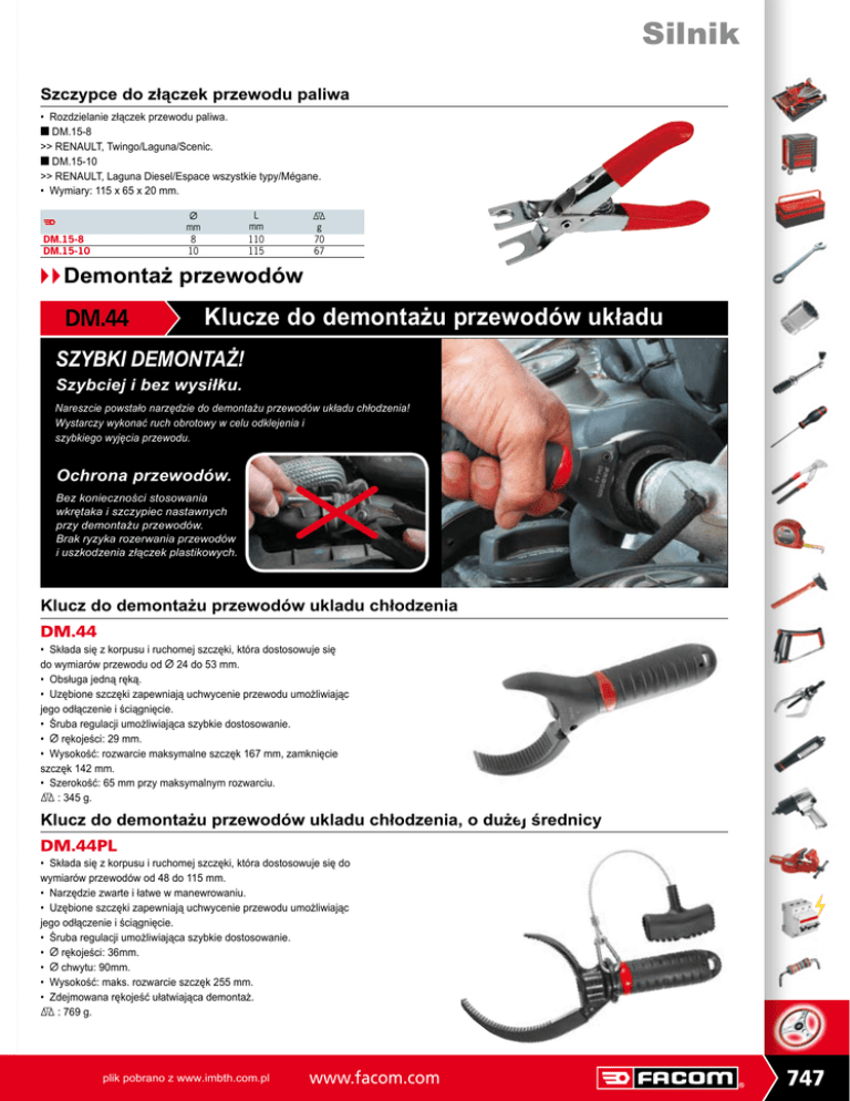 Silnik Szczypce do złączek przewodu paliwa • Rozdzielanie złączek przewodu paliwa. P DM.15-8 >> RENAULT, Twingo/Laguna/Scenic. P DM.15-10 >> RENAULT, Laguna Diesel/Espace wszystkie typy/Mégane. • Wymiary: 115 x 65 x 20 mm. L mm 110 115 d mm 8 10 F DM.15-8 DM.15-10 D g 70 67 u u Demontaż przewodów DM.44 Klucze do demontażu przewodów układu SZYBKI DEMONTAŻ! Szybciej i bez wysiłku. Nareszcie powstało narzędzie do demontażu przewodów układu chłodzenia! Wystarczy wykonać ruch obrotowy w celu odklejenia i szybkiego wyjęcia przewodu. Ochrona przewodów. Bez konieczności stosowania wkrętaka i szczypiec nastawnych przy demontażu przewodów. Brak ryzyka rozerwania przewodów i uszkodzenia złączek plastikowych. Klucz do demontażu przewodów ukladu chłodzenia DM.44 • Składa się z korpusu i ruchomej szczęki, która dostosowuje się do wymiarów przewodu od d 24 do 53 mm. • Obsługa jedną ręką. • Uzębione szczęki zapewniają uchwycenie przewodu umożliwiając jego odłączenie i ściągnięcie. • Śruba regulacji umożliwiająca szybkie dostosowanie. • d rękojeści: 29 mm. • Wysokość: rozwarcie maksymalne szczęk 167 mm, zamknięcie szczęk 142 mm. • Szerokość: 65 mm przy maksymalnym rozwarciu. D : 345 g. Klucz do demontażu przewodów ukladu chłodzenia, o dużej średnicy DM.44PL • Składa się z korpusu i ruchomej szczęki, która dostosowuje się do wymiarów przewodów od 48 do 115 mm. • Narzędzie zwarte i łatwe w manewrowaniu. • Uzębione szczęki zapewniają uchwycenie przewodu umożliwiając jego odłączenie i ściągnięcie. • Śruba regulacji umożliwiająca szybkie dostosowanie. • d rękojeści: 36mm. • d chwytu: 90mm. • Wysokość: maks. rozwarcie szczęk 255 mm. • Zdejmowana rękojeść ułatwiająca demontaż. D : 769 g. plik pobrano z www.imbth.com.pl www.facom.com 747