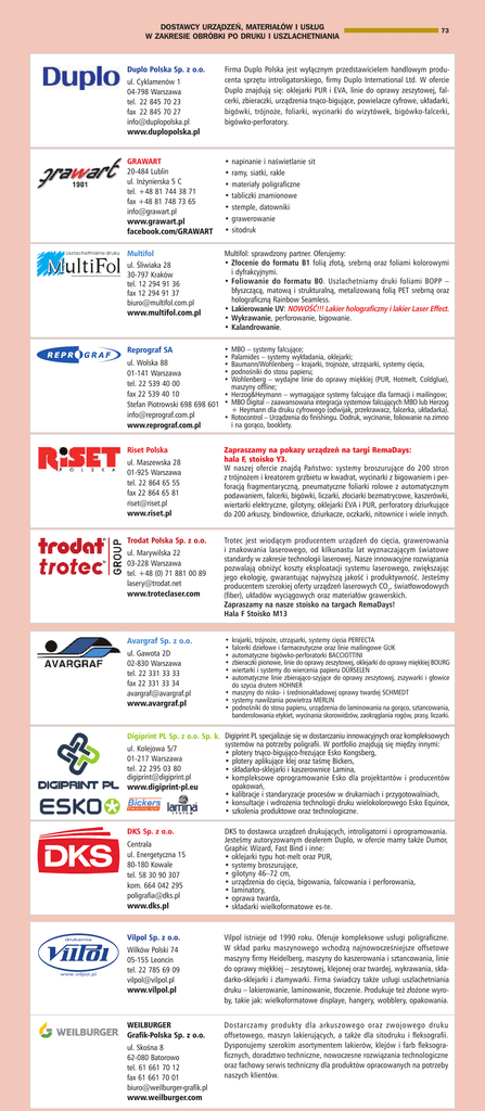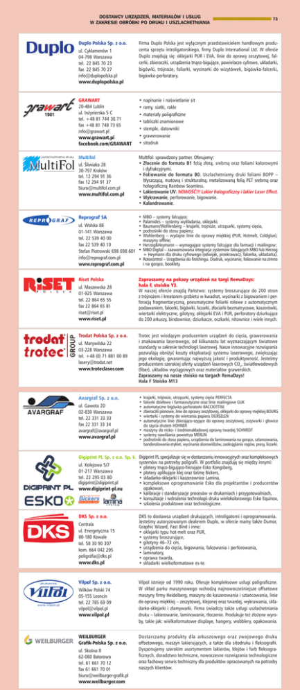 DOSTAWCY URZĄDZEŃ, MATERIAŁÓW M A I N T IOUSŁUG P I C S N E W S W ZAKRESIE OBRÓBKI PO DRUKU I USZLACHETNIANIA Duplo Polska Sp. z o.o. ul. Cyklamenów 1 04-798 Warszawa tel. 22 845 70 23 fax 22 845 70 27 [email protected] www.duplopolska.pl GRAWART 20-484 Lublin ul. Inżynierska 5 C tel. +48 81 744 38 71 fax +48 81 748 73 65 [email protected] www.grawart.pl facebook.com/GRAWART 73 Firma Duplo Polska jest wyłącznym przedstawicielem handlowym producenta sprzętu introligatorskiego, firmy Duplo International Ltd. W ofercie Duplo znajdują się: oklejarki PUR i EVA, linie do oprawy zeszytowej, falcerki, zbieraczki, urządzenia tnąco-bigujące, powielacze cyfrowe, układarki, bigówki, trójnoże, foliarki, wycinarki do wizytówek, bigówko-falcerki, bigówko-perforatory. • • • • • • • napinanie i naświetlanie sit ramy, siatki, rakle materiały poligraficzne tabliczki znamionowe stemple, datowniki grawerowanie sitodruk Multifol: sprawdzony partner. Oferujemy: Multifol • Złocenie do formatu B1 folią złotą, srebrną oraz foliami kolorowymi ul. Śliwiaka 28 i dyfrakcyjnymi. 30-797 Kraków • Foliowanie do formatu B0. Uszlachetniamy druki foliami BOPP – tel. 12 294 91 36 błyszczącą, matową i strukturalną, metalizowaną folią PET srebrną oraz fax 12 294 91 37 holograficzną Rainbow Seamless. [email protected] M A I N T O P I CDOSTAWCY S N E W•PODŁOŻY SLakierowanie DO UV: DRUKU NOWOŚĆ!!! Lakier holograficzny i lakier Laser Effect. www.multifol.com.pl • Wykrawanie, perforowanie, bigowanie. • Kalandrowanie. 72 Europapier Polska Sp. z o.o. Reprograf SA Magazyn centralny: ul. Wolska Pass 20 J 88 01-141 Błonie Warszawa 05-870 k. Warszawy 22 539 00 tel. 801 98940800 fax 22 539 40 10 [email protected] www.europapier.pl Stefan Piotrowski 698 698 601 [email protected] www.reprograf.com.pl PANTA Sp. z o.o. Biuro magazyn: Riset iPolska ul. Warecka 3 A ul. Maszewska 28 91-202 Łódź 01-925 Warszawa tel. 42 612 35 01 tel. 22 864 65 55 tel. 42 612 35 74 fax 22 864 65 81 [email protected] [email protected] www.panta.com.pl www.riset.pl Europapier Polska jest jednym z czołowych dystrybutorów podłoży do druku • MBO – do systemy falcujące; i mediów reklamy w Polsce i Europie Środkowo-Wschodniej. Naszą ofertę • Palamides systemy wykładania, oklejarki; opieramy na –produktach renomowanych, międzynarodowych producentów. • Baumann/Wohlenberg – krajarki, trojnoże, utrząsarki, systemy cięcia, Nasz asortyment stanowią m.in.: papiery graficzne (m.in. powlekane, offse• podnośniki do stosu papieru; towe, etykietowe, samokopiujące, objętościowe), biurowe,Coldglue), papiery • Wohlenberg – wydajne linie do oprawy miękkiejpapiery (PUR, Hotmelt, maszyny pod offline; kreatywne marką Papierowy Dizajn, materiały opakowaniowe (m.in. • Herzog&Heymann – wymagające systemy falcującemedia dla farmacji i mailingow; tektury faliste, lite, powlekane, papiery pakowe), reklamowe: folie, • MBO Digital – zaawansowana integracja systemow falcujących MBO lubtkaniny Herzog laminaty, papiery (blueback, whiteback, citylight, tapety), banery, + Heymann dla druku cyfrowego (odwijak, przekrawacz, falcerka, układarka). typu canvas, tworzywa sztuczne, systemy ekspozycji. • Rotocontrol – Urządzenia do finishingu. Dodruk, wycinanie, foliowanie na zimno i na gorąco, booklety. • NOWOŚĆ: papiery multifunkcyjne • NOWOŚĆ: okleiny płócienne oraz rysunkowe do zadruku na drukarkach Zapraszamy na pokazy urządzeń na targilaserowych RemaDays: • papiery objętościowe Premium – ALTO 1.2; 1.3 Y3. i 1.5 • okleiny papierowe hala F, stoisko • papiery powlekane, okleiny PCV na W naszej jednokrotnie ofercie znajdą Państwo: systemy •broszurujące dopapierze 200 stron w tym 1.25 • skóropodobne okleiny PU z trójnożem i kreatorem grzbietu w kwadrat, wycinarki z bigowaniem • papiery barwione w masie • materiały flokowane i perforacją fragmentaryczną, pneumatyczne foliarki rolowe z automatycznym • satynowane papiery do kalendarzy książkowych falcerki, bigówki, liczarki, złociarki• bezmatrycowe, folie PP, PCV, APET i GAG podawaniem, kaszerówki, • lite tektury introligatorskie do zadruku offsetowego wiertarki elektryczne, gilotyny, oklejarki EVA i PUR, perforatory dziurkujące • tektury z pianką • folie BOPP na etykiety IML do 200 arkuszy, bindownice, dziurkacze, oczkarki, nitownice i wiele innych. Oferujemy: • Podłoża druku wielkoformatowego: banery, siatki, grawerowania folie, papiery, Trotec jest do wiodącym producentem urządzeń do cięcia, canvasy itp. laserowego, od kilkunastu lat wyznaczającym światowe i znakowania ul. Marywilska 22 01-141 Warszawa • TekstyliawPONGS w technologii szerokości do 5m do zadruku UV, sublimacja, solvent, standardy zakresie laserowej. Nasze innowacyjne rozwiązania 03-228 Warszawa tel. 22 539 40 00 latex pozwalają obniżyć koszty eksploatacji systemu laserowego, zwiększając tel. +48 (0)40 7110 881 00 89 • DESCOR – nowatorski system napinania tekstyliów w plastikowe ramy fax 22 539 jego ekologię, gwarantując najwyższą jakość i produktywność. Jesteśmy [email protected] Kontakt: [email protected] producentem szerokiej oferty urządzeń laserowych CO2, światłowodowych www.troteclaser.com Anna Andruszkiewicz 698 698 oraz 612 materiałów [email protected] (fiber), układów wyciągowych grawerskich. www.reprograf.com.pl Paweł Górniak 698 698 610 [email protected] Zapraszamy na nasze stoisko na targach RemaDays! Hala F Stoisko M13 DOSTAWCY URZĄDZEŃ, MATERIAŁÓW I USŁUG W ZAKRESIE OBRÓBKI PO DRUKU I USZLACHETNIANIA Reprograf SA Trodat Polska ul. Wolska 88 Sp. z o.o. Avargraf Sp. z o.o. ul. Gawota 2D 02-830 Warszawa tel. 22 331 33 33 fax 22 331 33 34 [email protected] www.avargraf.pl • • • • • • krajarki, trójnoże, utrząsarki, systemy cięcia PERFECTA Ś W A T mailingowe D R U KGUK U 1/2 0 1 7 falcerki dziełowe i farmaceutyczne orazI linie autom