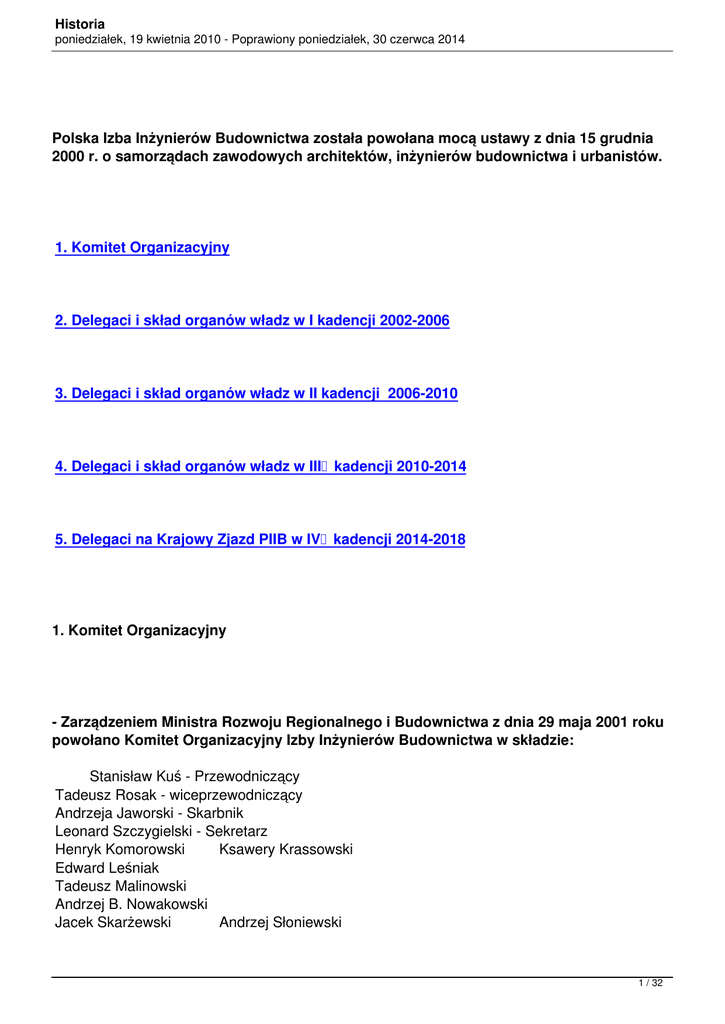 Historia poniedziałek, 19 kwietnia 2010 - Poprawiony poniedziałek, 30 czerwca 2014 Polska Izba Inżynierów Budownictwa została powołana mocą ustawy z dnia 15 grudnia 2000 r. o samorządach zawodowych architektów, inżynierów budownictwa i urbanistów. 1. Komitet Organizacyjny 2. Delegaci i skład organów władz w I kadencji 2002-2006 3. Delegaci i skład organów władz w II kadencji 2006-2010 4. Delegaci i skład organów władz w III kadencji 2010-2014 5. Delegaci na Krajowy Zjazd PIIB w IV kadencji 2014-2018 1. Komitet Organizacyjny - Zarządzeniem Ministra Rozwoju Regionalnego i Budownictwa z dnia 29 maja 2001 roku powołano Komitet Organizacyjny Izby Inżynierów Budownictwa w składzie: Stanisław Kuś - Przewodniczący Tadeusz Rosak - wiceprzewodniczący Andrzeja Jaworski - Skarbnik Leonard Szczygielski - Sekretarz Henryk Komorowski Ksawery Krassowski Edward Leśniak Tadeusz Malinowski Andrzej B. Nowakowski Jacek Skarżewski Andrzej Słoniewski 1 / 32 Historia poniedziałek, 19 kwietnia 2010 - Poprawiony poniedziałek, 30 czerwca 2014 Krzysztof Stelągowski Wacław Trojanowski Bronisław Wosiek - Zarządzeniem nr 11 Ministra Infrastruktury z dnia 01 lipca 2002 roku powołano Komitet Organizacyjny Izby Inżynierów Budownictwa w składzie: Zbigniew Grabowski - Przewodniczący Andrzej Orczykowski - wiceprzewodniczący Andrzeja Jaworski - Skarbnik Leonard Szczygielski - Sekretarz Henryk Komorowski Ksawery Krassowski Edward Leśniak Jacek Skarżewski Krzysztof Stelągowski Wacław Trojanowski Henryk Bałuch Jerzy Bielawski Jan Urbaniak Jerzy Zieliński Stanisław Wierzbicki Tadeusz Nawracaj Andrzej Mikołajczak 2. Delegaci i skład organów władz w I kadencji 2002-2006 - Delegaci na Krajowy Zjazd PIIB w I kadencji 2002-2006 DOLNOŚLĄSKA Jasieńko Jerzy Dobrucki Adam Wosiek Bronisław Hotała Eugeniusz Bieńkowski Tadeusz Nowak Aleksander Persona Marian Rybiańska Roma Haznar Kazimierz Naskręt Zenon 2 / 32 Historia poniedziałek, 19 kwietnia 2010 - Poprawiony poniedziałek, 30 czerwca 2014 Zwierzchowska Zofia Olichwer Tadeusz Szurlej Zbigniew Janiaczyk Małgorzata Biliszczuk Jan Paginowska Danuta Dąbrowski Andrzej Skorys Barbara Dobrowolska Ewa Grzelka Wiesława Gulbicka Grażyna KUJAWSKO-POMORSKA Dobrowoslki Ryszard Myśliwiec Andrzej Piotrowiak Paweł Nagórski Olgierd Kasperkiewicz Tomasz Kołodziej Jacek Biegański Janusz Przybylski Witold Kamiński Jacek Staroń Grażyna Kalinowski Stefan LUBELSKA Błażukiewicz Jakub Iberszer Janusz Król Mieczysław Kukiełka Jan Leniak Andrzej Nurek Wiesław Pichla Andrzej Woźniak Andrzej LUBUSKA Krzyżanowski Józef Herma Jolanta Koczwara Piotr (GORZÓW WIELKOPOLSKI) LUBUSKA (ZIELONA GÓRA) Rupieta Piotr Teterycz Ryszard Baran Jan Wesołowski Włodzimierz 3 / 32 Historia poniedziałek, 19 kwietnia 2010 - Poprawiony poniedziałek, 30 czerwca 2014 ŁÓDZKA Nowakowski Andrzej Ciborska Beata Cichosz Roman Grabowski Jaromir Jońca Agnieszka Kuligowski Andrzej Krassowski Ksawery Malec Barbara Malinowski Tadeusz Nowak Józef Soszkowski Zdzisław Wojciechowski Stanisław Wrzeszcz Bogdan MAŁOPOLSKA Rawicki Zygmunt Abrahamowicz Stanisław Kałkowski Zbysław Karczmarczyk Stanisław Bobulska-Pacek Irena Szostak Józef Mierzowska Elżbieta Pełech Andrzej Ślusarczyk Kazimierz Korniak-Figa Krystyna Reguła Leszek Duraczyńska Krystyna Oprocha Jerzy Kawik Antoni Drożdż Andrzej Cieśliński Janusz Racoń Zbigniew Kot Zbigniew MAZOWIECKA Aptowicz Urszula Badowski Kazimierz Baranowski Jerzy Bratkowski Andrzej Cieślak Bronisław Chaciński Ryszard Czarnecki Andrzej Dobrucki Andrzej Garwoliński Zygmunt Grabowski Zbigniew Groniecki Edward 4 / 32 Historia poniedziałek, 19 kwietnia 2010 - Poprawiony poniedziałek, 30 czerwca 2014 Kledyński Zbigniew Klicki Lech Kotowski Jerzy Kuś Stanisław Lendzion Grażyna Olechnowicz Wiesław Rymsza Janusz Szczygielski Leonard Szulborski Kazimierz Tomaszewska Elżbieta Tabor Andrzej Walerych Włodzimierz Wojtkiewicz Jan Wolski Wojciech Zobel Henryk Jończyk Adam OPOLSKA Daszkiewicz Elżbieta Kraus Marian Mizera Jan Mleczko-Król Maria Rak Adam Skardowski Adam PODKARPACKA Kerste Jerzy Kaczor Wiesław Lewiński Jerzy Mazur Stanisława Siwowski Tomasz Skiba Ryszard Szalwa Adam Tarnawski Adam PODLASKA Miedziałowski Czesław Okulicz-Kozaryn Gilbert Tabędzki Aleksander Jurkowski Karol Sykała Grażyna Kruszewski Ryszard Drapa Jerzy POMORSKA Guziński Stefan 5 / 32 Historia poniedziałek, 19 kwietnia 2010 - Poprawiony poniedziałek, 30 czerwca 2014 Kolasa Ryszard Kroplewski Jarosław Kwiatkowski Ryszard Trykosko Ryszard Chojnacki Wiesław Daniszewski Maciej Grecki Krzysztof Jankowska Joanna Korczak Piotr Kowieski Wiesław Mazur-Nagórka Alicja Owedyk Kazimierz Pietrzak Ryszard Wawrzyniak Henryk Wawrzyński Andrzej Kozieł Stanisław ŚLĄSKA Bochyńska-Podloch Danuta Ciesiński Krzysztof Czarniecki Stefan Dzierżewicz Jerzy Dzierżewicz Zbigniew Eder Leszek Grzesik Jerzy Jurkiewicz Bolesław Kallik Urszula Krasnowski Janusz Kowalski Franciszek Kozula Janusz Lipiński Tadeusz Matuszyk Zbigniew Mokrosz Rudolf Nowak Andrzej Pala Jacek Panicz Zenon Szleper Waldemar Skotny Jerzy Twardosz-Michniewska Barbara Wójcik Stefan Wyrwas Piotr ŚWIĘTOKRZYSKA Jantura Marian Łapiński Michał Pawelec Andrzej Płaza Wojciech 6 / 32 Historia poniedziałek, 19 kwietnia 2010 - Poprawiony poniedziałek, 30 czerwca 2014 Skawiński Marian Skiba Ewa Zieliński Stanisław WARMIŃSKO-MAZURSKA Binerowski Zdzisław Domińczak Mieczysław Harasim Józef Łepecki Wiesław Sośnierz-Ogrodzińska Anna Stasiorowski Andrzej Głębocki Andrzej Majewski Lech Harasymczuk Janusz Rogala Benedykt WIELKOPOLSKA Gorgolewski Łukasz Czajka Kazimierz Krzysztofiak Marian Ratajczak Grzegorz Łuczak Jan Bartczak Piotr Lemański Jan Jędraszak Wojciech Kowalski Janusz Mikołajczak Andrzej Rakowski Michał Patalas Andrzej Marcinkowski Kajetan Gałach Jadwiga Kania Stanisław Mikurenda Szczepan Barczyński Andrzej Piotrowski Zdzisław Stroński Jerzy Gawęcka 