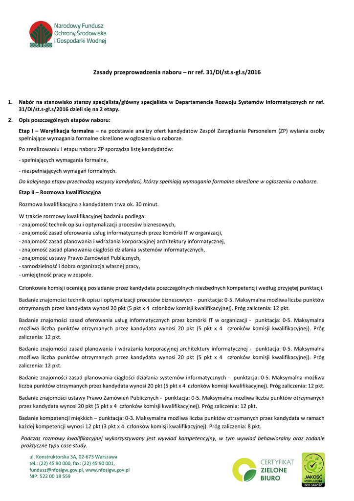 Zasady przeprowadzenia naboru – nr ref. 31/DI/st.s-gł.s/2016 1. Nabór na stanowisko starszy specjalista/główny specjalista w Departamencie Rozwoju Systemów Informatycznych nr ref. 31/DI/st.s-gł.s/2016 dzieli się na 2 etapy. 2. Opis poszczególnych etapów naboru: Etap I – Weryfikacja formalna – na podstawie analizy ofert kandydatów Zespół Zarządzania Personelem (ZP) wyłania osoby spełniające wymagania formalne określone w ogłoszeniu o naborze. Po zrealizowaniu I etapu naboru ZP sporządza listę kandydatów: - spełniających wymagania formalne, - niespełniających wymagań formalnych. Do kolejnego etapu przechodzą wszyscy kandydaci, którzy spełniają wymagania formalne określone w ogłoszeniu o naborze. Etap II – Rozmowa kwalifikacyjna Rozmowa kwalifikacyjna z kandydatem trwa ok. 30 minut. W trakcie rozmowy kwalifikacyjnej badaniu podlega: - znajomość technik opisu i optymalizacji procesów biznesowych, - znajomość zasad oferowania usług informatycznych przez komórki IT w organizacji, - znajomość zasad planowania i wdrażania korporacyjnej architektury informatycznej, - znajomość zasad planowania ciągłości działania systemów informatycznych, - znajomość ustawy Prawo Zamówień Publicznych, - samodzielność i dobra organizacja własnej pracy, - umiejętność pracy w zespole. Członkowie komisji oceniają posiadanie przez kandydata poszczególnych niezbędnych kompetencji według przyjętej punktacji. Badanie znajomości technik opisu i optymalizacji procesów biznesowych - punktacja: 0-5. Maksymalna możliwa liczba punktów otrzymanych przez kandydata wynosi 20 pkt (5 pkt x 4 członków komisji kwalifikacyjnej). Próg zaliczenia: 12 pkt. Badanie znajomości zasad oferowania usług informatycznych przez komórki IT w organizacji - punktacja: 0-5. Maksymalna możliwa liczba punktów otrzymanych przez kandydata wynosi 20 pkt (5 pkt x 4 członków komisji kwalifikacyjnej). Próg zaliczenia: 12 pkt. Badanie znajomości zasad planowania i wdrażania korporacyjnej architektury informatycznej - punktacja: 0-5. Maksymalna możliwa liczba punktów otrzymanych przez kandydata wynosi 20 pkt (5 pkt x 4 członków komisji kwalifikacyjnej). Próg zaliczenia: 12 pkt. Badanie znajomości zasad planowania ciągłości działania systemów informatycznych - punktacja: 0-5. Maksymalna możliwa liczba punktów otrzymanych przez kandydata wynosi 20 pkt (5 pkt x 4 członków komisji kwalifikacyjnej). Próg zaliczenia: 12 pkt. Badanie znajomości ustawy Prawo Zamówień Publicznych - punktacja: 0-5. Maksymalna możliwa liczba punktów otrzymanych przez kandydata wynosi 20 pkt (5 pkt x 4 członków komisji kwalifikacyjnej). Próg zaliczenia: 12 pkt. Badanie kompetencji miękkich – punktacja: 0-3. Maksymalna możliwa liczba punktów otrzymanych przez kandydata w ramach każdej kompetencji wynosi 12 pkt (3 pkt x 4 członków komisji kwalifikacyjnej). Próg zaliczenia: 8 pkt. Podczas rozmowy kwalifikacyjnej wykorzystywany jest wywiad kompetencyjny, w tym wywiad behawioralny oraz zadanie praktyczne typu case study. ul. Konstruktorska 3A, 02-673 Warszawa tel.: (22) 45 90 000, fax: (22) 45 90 001, [email protected], www.nfosigw.gov.pl NIP: 522 00 18 559