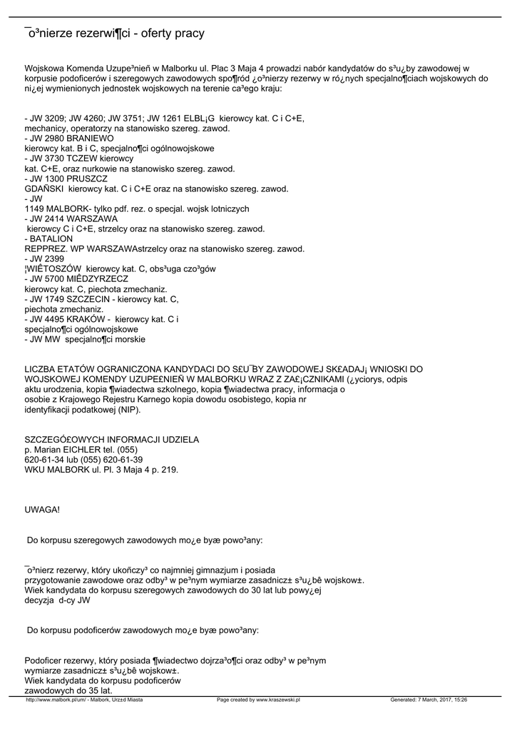 ¯o³nierze rezerwi¶ci - oferty pracy Wojskowa Komenda Uzupe³nieñ w Malborku ul. Plac 3 Maja 4 prowadzi nabór kandydatów do s³u¿by zawodowej w korpusie podoficerów i szeregowych zawodowych spo¶ród ¿o³nierzy rezerwy w ró¿nych specjalno¶ciach wojskowych do ni¿ej wymienionych jednostek wojskowych na terenie ca³ego kraju: - JW 3209; JW 4260; JW 3751; JW 1261 ELBL¡G kierowcy kat. C i C+E, mechanicy, operatorzy na stanowisko szereg. zawod. - JW 2980 BRANIEWO kierowcy kat. B i C, specjalno¶ci ogólnowojskowe - JW 3730 TCZEW kierowcy kat. C+E, oraz nurkowie na stanowisko szereg. zawod. - JW 1300 PRUSZCZ GDAÑSKI kierowcy kat. C i C+E oraz na stanowisko szereg. zawod. - JW 1149 MALBORK- tylko pdf. rez. o specjal. wojsk lotniczych - JW 2414 WARSZAWA kierowcy C i C+E, strzelcy oraz na stanowisko szereg. zawod. - BATALION REPPREZ. WP WARSZAWAstrzelcy oraz na stanowisko szereg. zawod. - JW 2399 ¦WIÊTOSZÓW kierowcy kat. C, obs³uga czo³gów - JW 5700 MIÊDZYRZECZ kierowcy kat. C, piechota zmechaniz. - JW 1749 SZCZECIN - kierowcy kat. C, piechota zmechaniz. - JW 4495 KRAKÓW - kierowcy kat. C i specjalno¶ci ogólnowojskowe - JW MW specjalno¶ci morskie LICZBA ETATÓW OGRANICZONA KANDYDACI DO S£U¯BY ZAWODOWEJ SK£ADAJ¡ WNIOSKI DO WOJSKOWEJ KOMENDY UZUPE£NIEÑ W MALBORKU WRAZ Z ZA£¡CZNIKAMI (¿yciorys, odpis aktu urodzenia, kopia ¶wiadectwa szkolnego, kopia ¶wiadectwa pracy, informacja o osobie z Krajowego Rejestru Karnego kopia dowodu osobistego, kopia nr identyfikacji podatkowej (NIP). SZCZEGÓ£OWYCH INFORMACJI UDZIELA p. Marian EICHLER tel. (055) 620-61-34 lub (055) 620-61-39 WKU MALBORK ul. Pl. 3 Maja 4 p. 219. UWAGA! Do korpusu szeregowych zawodowych mo¿e byæ powo³any: ¯o³nierz rezerwy, który ukoñczy³ co najmniej gimnazjum i posiada przygotowanie zawodowe oraz odby³ w pe³nym wymiarze zasadnicz± s³u¿bê wojskow±. Wiek kandydata do korpusu szeregowych zawodowych do 30 lat lub powy¿ej decyzja d-cy JW Do korpusu podoficerów zawodowych mo¿e byæ powo³any: Podoficer rezerwy, który posiada ¶wiadectwo dojrza³o¶ci oraz odby³ w pe³nym wymiarze zasadnicz± s³u¿bê wojskow±. Wiek kandydata do korpusu podoficerów zawodowych do 35 lat. http://www.malbork.pl/um/ - Malbork, Urz±d Miasta Page created by www.kraszewski.pl Generated: 7 March, 2017, 15:26 ¬ród³o: www.pup.malbork.pl http://www.malbork.pl/um/ - Malbork, Urz±d Miasta Page created by www.kraszewski.pl Generated: 7 March, 2017, 15:26