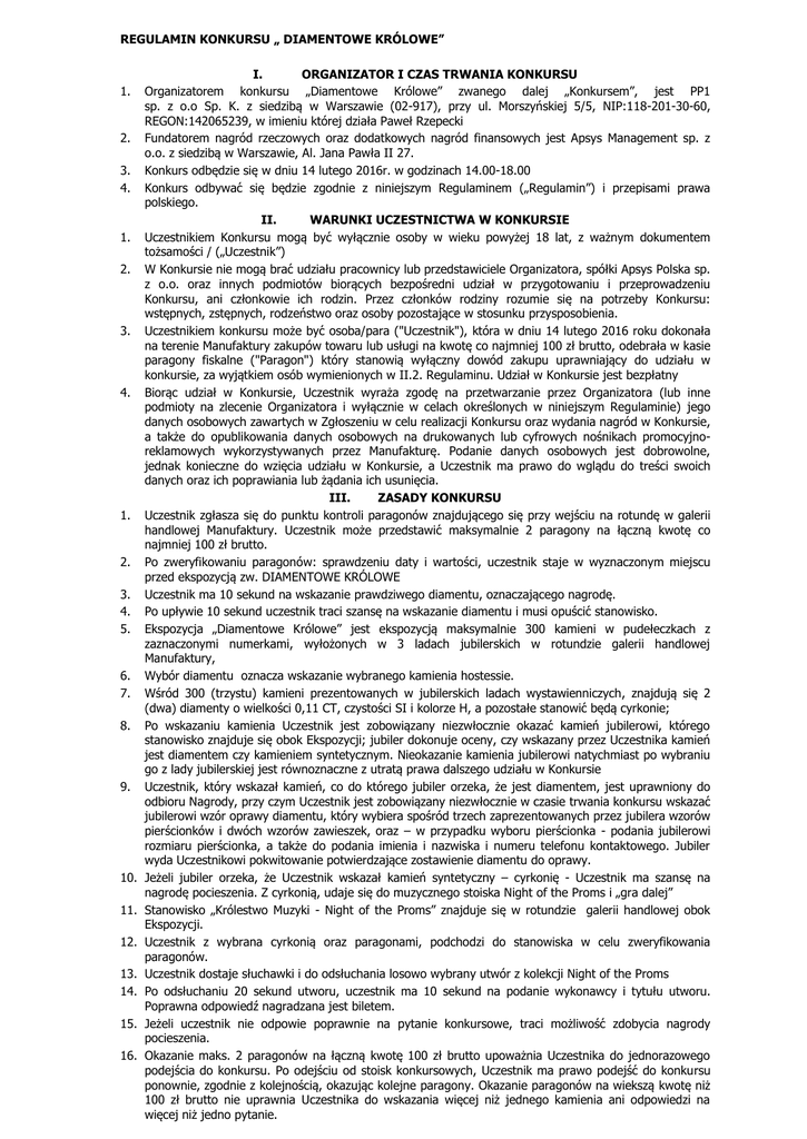 Organizatorem konkursu „Diamentowe Królowe” zwanego dalej „Konkursem”, jest PP1