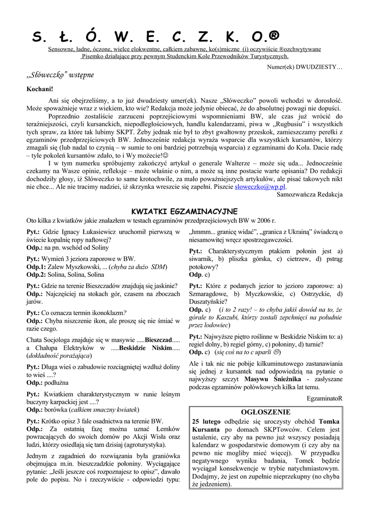 S. Ł. Ó. W. E. C. Z. K. O.® Sensowne, ładne, óczone, wielce elokwentne, całkiem zabawne, ko(s)miczne (i) oczywiście ®ozchwytywane Pisemko działające przy pewnym Studenckim Kole Przewodników Turystycznych. Numer(ek) DWUDZIESTY… ,,Słóweczko” wstępne Kochani! Ani się obejrzeliśmy, a to już dwudziesty umer(ek). Nasze „Słóweczko” powoli wchodzi w dorosłość. Może spoważnieje wraz z wiekiem, kto wie? Redakcja może jedynie obiecać, że do absolutnej powagi nie dopuści. Poprzednio zostaliście zarzuceni poprzejściowymi wspomnieniami BW, ale czas już wrócić do teraźniejszości, czyli kursanckich, niepodległościowych, handlu kalendarzami, piwa w „Rugbusiu” i wszystkich tych spraw, za które tak lubimy SKPT. Żeby jednak nie był to zbyt gwałtowny przeskok, zamieszczamy perełki z egzaminów przedprzejściowych BW. Jednocześnie redakcja wyraża wsparcie dla wszystkich kursantów, którzy zmagali się (lub nadal to czynią – w sumie to oni bardziej potrzebują wsparcia) z egzaminami do Koła. Dacie radę – tyle pokoleń kursantów zdało, to i Wy możecie! I w tym numerku spróbujemy zakończyć artykuł o generale Walterze – może się uda... Jednocześnie czekamy na Wasze opinie, refleksje – może właśnie o nim, a może są inne postacie warte opisania? Do redakcji dochodziły głosy, iż Słóweczko to same krotochwile, za mało poważniejszych artykułów, ale pisać takowych nikt nie chce... Ale nie tracimy nadziei, iż skrzynka wreszcie się zapełni. Piszcie [email protected]. Samozwańcza Redakcja KWIATKI EGZAMINACYJNE Oto kilka z kwiatków jakie znalazłem w testach egzaminów przedprzejściowych BW w 2006 r. Pyt.: Gdzie Ignacy Łukasiewicz uruchomił pierwszą w świecie kopalnię ropy naftowej? Odp.: na pn. wschód od Soliny Pyt.: Wymień 3 jeziora zaporowe w BW. Odp.1: Zalew Myszkowski, ... (chyba za dużo SDM) Odp.2: Solina, Solina, Solina Pyt.: Gdzie na terenie Bieszczadów znajdują się jaskinie? Odp.: Najczęściej na stokach gór, czasem na zboczach jarów. Pyt.: Co oznacza termin ikonoklazm? Odp.: Chyba niszczenie ikon, ale proszę się nie śmiać w razie czego. Chata Socjologa znajduje się w masywie .....Bieszczad..... a Chałupa Elektryków w .....Beskidzie Niskim..... (dokładność porażająca) Pyt.: Długa wieś o zabudowie rozciągniętej wzdłuż doliny to wieś ....? Odp.: podłużna Pyt.: Kwiatkiem charakterystycznym w runie leśnym buczyny karpackiej jest ....? Odp.: borówka (całkiem smaczny kwiatek) Pyt.: Krótko opisz 3 fale osadnictwa na terenie BW. Odp.: Za ostatnią fazę można uznać Łemków powracających do swoich domów po Akcji Wisła oraz ludzi, którzy osiedlają się tam dzisiaj (agroturystyka). Jednym z zagadnień do rozwiązania była graniówka obejmująca m.in. bieszczadzkie połoniny. Wyciągające pytanie: „Jeśli jeszcze coś rozpoznajesz to opisz”, dawało pole do popisu. No i rzeczywiście - odpowiedzi typu: „hmmm... granicę widać”, „granica z Ukrainą” świadczą o niesamowitej wręcz spostrzegawczości. Pyt.: Charakterystycznym ptakiem połonin jest a) siwarnik, b) pliszka górska, c) cietrzew, d) pstrąg potokowy? Odp. c) Pyt.: Które z podanych jezior to jezioro zaporowe: a) Szmaragdowe, b) Myczkowskie, c) Ostrzyckie, d) Duszatyńskie? Odp. c) (i to 2 razy! – to chyba jakiś dowód na to, że górale to Kaszubi, którzy zostali zepchnięci na południe przez lodowiec) Pyt.: Najwyższe piętro roślinne w Beskidzie Niskim to: a) regiel dolny, b) regiel górny, c) połoniny, d) turnie? Odp. c) (się coś na to c uparli ) Ale i tak nic nie pobije kilkuminutowego zastanawiania się jednej z kursantek nad odpowiedzią na pytanie o najwyższy szczyt Masywu Śnieżnika - zasłyszane podczas egzaminów połówkowych kilka lat temu. EgzaminatoR OGŁOSZENIE 25 lutego odbędzie się uroczysty obchód Tomka Kursanta po domach SKPTowców. Celem jest ustalenie, czy aby na pewno już wszyscy posiadają kalendarz w gospodarstwie domowym (i czy aby na pewno nie mogliby mieć więcej). W przypadku negatywnego wyniku badania, Tomek będzie wyciągał konsekwencje w trybie natychmiastowym. Dodajmy, że jest on zupełnie nieprzekupny (no chyba że jedzeniem). WYJAZD NIEPODLEGŁOŚCIOWY 2006 Poniedziałek, godzina 6.20, właśnie dotarłam do domku, o 9.45 odjeżdża autobus na uczelnię, więc główka pracuje, myśli intensywnie co pożytecznego można zrobić przez ponad 3 godziny. Po śniadaniu i kąpieli z peelingiem w końcu wzięłam długopis w dłoń (klawiaturę w palce?), by wspomnienia spisać. Muszę jednak na wstępie zaznaczyć że będzie to relacja wielce subiektywna, , z punktu widzenia, jak to określił jeden z uczestników wyjazdu, „tej zakały grupy” (zakały nie zakały, ale na pewno niedowidzącej, bo okulary umarły śmiercią niezupełnie naturalna tuz po wejściu do pociągu, zostawiając mnie sam na sam z –3 dioptriami) – doprawdy nie rozumiem tej nieuzasadnionej złośliwości ;). Pierwszą kwestia, która należy poruszyć jest sama nazwa wypadu – pojawiły się bowiem głosy, że bardziej niż niepodległościowy byłaby adekwatna nazwa zaduszkowy, myślę jednak że pogoda rozwiała wątpliwości tych wszystkich osób, z drugiej jednak strony trudno nazwać początek listopada zimą... pozostanę więc przy stwierdzeniu, że pogoda była śnieżna, większość czasu mroźna. O 17.50 wyruszył z Gdyni głównej pociąg relacji Gdynia – Poznań (dodajmy ten z gatunku gadających „podróżnych prosimy o zabranie bagażu podręcznego, dziękujemy że zdecydowali się państwo skorzystać z naszych usług”), w Poznaniu przesiadka i pierwszy szok – śnieg z deszczem. Stacja końcowa: Kraków główny i drugi szok – pierwszy prawdziwy tego roku śnieg (tu musze napomknąć o pewnym dobrym koledze, który tuż przed odjazdem pociągu poradził wziąć jeszcze jeden sweter i ciepłe rajstopy, dziękuję misiek ). Odnajdujemy się na peronie – 