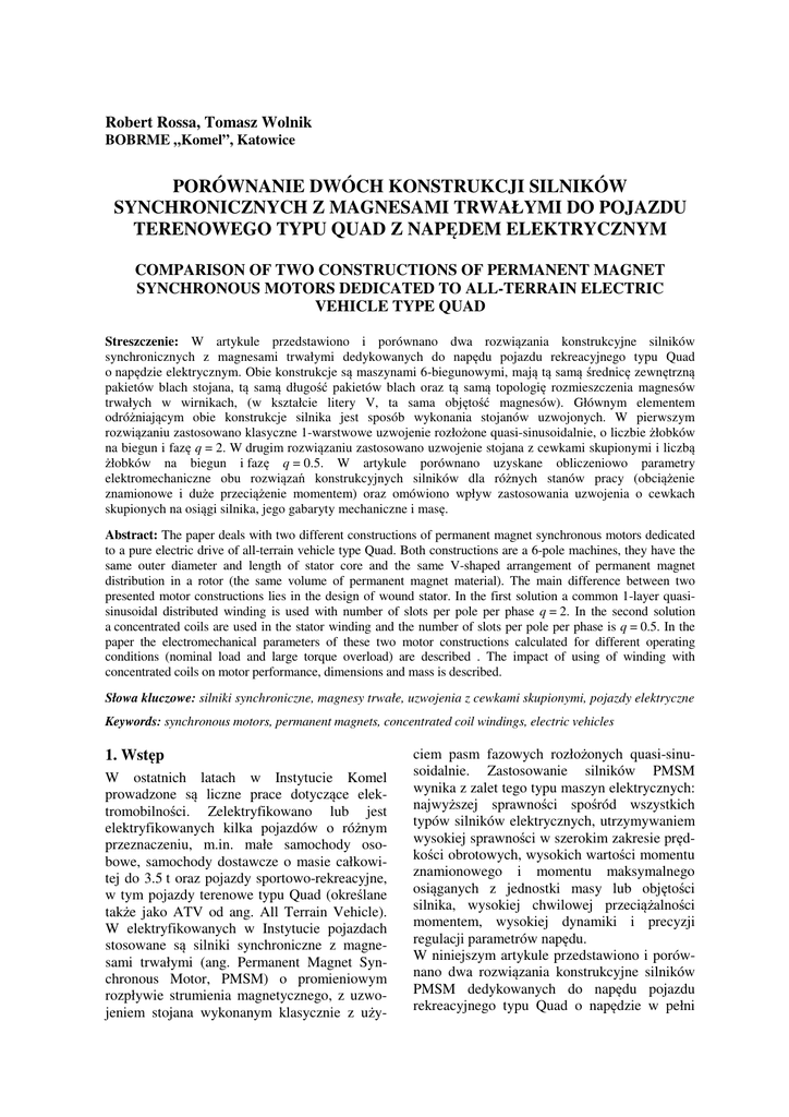Robert Rossa, Tomasz Wolnik BOBRME „Komel”, Katowice PORÓWNANIE DWÓCH KONSTRUKCJI SILNIKÓW SYNCHRONICZNYCH Z MAGNESAMI TRWAŁYMI DO POJAZDU TERENOWEGO TYPU QUAD Z NAPĘDEM ELEKTRYCZNYM COMPARISON OF TWO CONSTRUCTIONS OF PERMANENT MAGNET SYNCHRONOUS MOTORS DEDICATED TO ALL-TERRAIN ELECTRIC VEHICLE TYPE QUAD Streszczenie: W artykule przedstawiono i porównano dwa rozwiązania konstrukcyjne silników synchronicznych z magnesami trwałymi dedykowanych do napędu pojazdu rekreacyjnego typu Quad o napędzie elektrycznym. Obie konstrukcje są maszynami 6-biegunowymi, mają tą samą średnicę zewnętrzną pakietów blach stojana, tą samą długość pakietów blach oraz tą samą topologię rozmieszczenia magnesów trwałych w wirnikach, (w kształcie litery V, ta sama objętość magnesów). Głównym elementem odróżniającym obie konstrukcje silnika jest sposób wykonania stojanów uzwojonych. W pierwszym rozwiązaniu zastosowano klasyczne 1-warstwowe uzwojenie rozłożone quasi-sinusoidalnie, o liczbie żłobków na biegun i fazę q = 2. W drugim rozwiązaniu zastosowano uzwojenie stojana z cewkami skupionymi i liczbą żłobków na biegun i fazę q = 0.5. W artykule porównano uzyskane obliczeniowo parametry elektromechaniczne obu rozwiązań konstrukcyjnych silników dla różnych stanów pracy (obciążenie znamionowe i duże przeciążenie momentem) oraz omówiono wpływ zastosowania uzwojenia o cewkach skupionych na osiągi silnika, jego gabaryty mechaniczne i masę. Abstract: The paper deals with two different constructions of permanent magnet synchronous motors dedicated to a pure electric drive of all-terrain vehicle type Quad. Both constructions are a 6-pole machines, they have the same outer diameter and length of stator core and the same V-shaped arrangement of permanent magnet distribution in a rotor (the same volume of permanent magnet material). The main difference between two presented motor constructions lies in the design of wound stator. In the first solution a common 1-layer quasisinusoidal distributed winding is used with number of slots per pole per phase q = 2. In the second solution a concentrated coils are used in the stator winding and the number of slots per pole per phase is q = 0.5. In the paper the electromechanical parameters of these two motor constructions calculated for different operating conditions (nominal load and large torque overload) are described . The impact of using of winding with concentrated coils on motor performance, dimensions and mass is described. Słowa kluczowe: silniki synchroniczne, magnesy trwałe, uzwojenia z cewkami skupionymi, pojazdy elektryczne Keywords: synchronous motors, permanent magnets, concentrated coil windings, electric vehicles 1. Wstęp W ostatnich latach w Instytucie Komel prowadzone są liczne prace dotyczące elektromobilności. Zelektryfikowano lub jest elektryfikowanych kilka pojazdów o różnym przeznaczeniu, m.in. małe samochody osobowe, samochody dostawcze o masie całkowitej do 3.5 t oraz pojazdy sportowo-rekreacyjne, w tym pojazdy terenowe typu Quad (określane także jako ATV od ang. All Terrain Vehicle). W elektryfikowanych w Instytucie pojazdach stosowane są silniki synchroniczne z magnesami trwałymi (ang. Permanent Magnet Synchronous Motor, PMSM) o promieniowym rozpływie strumienia magnetycznego, z uzwojeniem stojana wykonanym klasycznie z uży- ciem pasm fazowych rozłożonych quasi-sinusoidalnie. Zastosowanie silników PMSM wynika z zalet tego typu maszyn elektrycznych: najwyższej sprawności spośród wszystkich typów silników elektrycznych, utrzymywaniem wysokiej sprawności w szerokim zakresie prędkości obrotowych, wysokich wartości momentu znamionowego i momentu maksymalnego osiąganych z jednostki masy lub objętości silnika, wysokiej chwilowej przeciążalności momentem, wysokiej dynamiki i precyzji regulacji parametrów napędu. W niniejszym artykule przedstawiono i porównano dwa rozwiązania konstrukcyjne silników PMSM dedykowanych do napędu pojazdu rekreacyjnego typu Quad o napędzie w pełni elektrycznym, bateryjnym. Obie konstrukcje są maszynami 6-biegunowymi, mają tą samą średnicę zewnętrzną pakietów blach stojana, tą samą długość pakietów blach, tą samą topologię rozmieszczenia magnesów trwałych w wirniku (w kształcie litery V) oraz tą sama objętość magnesów. Głównym elementem odróżniającym obie konstrukcje silnika jest sposób wykonania stojanów uzwojonych. W pierwszym rozwiązaniu zastosowano klasyczne 1-warstowowe uzwojenie rozłożone, o liczbie żłobków na biegun i fazę q = 2. W drugim rozwiązaniu zastosowano uzwojenie stojana z cewkami skupionymi i liczbą żłobków na biegun i fazę q = 0.5. Rys.1. Elektryfikowany pojazd terenowy Quad. Pod siedzeniem kierowcy widoczny jest silnik PMSM. 2. Wymagania techniczne napędu elektrycznego dla pojazdu Quad Głównymi podzespołami nowoczesnego napędu pojazdu w pełni elektrycznego są silnik elektryczny i falownik (przekształtnik energoelektroniczny) zasilający tenże silnik, z zaimplementowanym odpowiednim algorytmem sterowania momentem i prędkością. Przy projektowaniu napędu elektrycznego pojazdu Quad, pokazanego na rys. 1, zastosowano silnik typu PMSM. Dla potrzeb elektryfikacji pojazdu przyjęto i zaprojektowano odmianę silnika PMSM z magnesami trwałymi mocowanymi wewnątrz rdzenia magnetycznego wirnika (ang. skrót Interior PMSM, IPMSM) [1]. Wirniki silników IPMSM mają dwie osie symetrii magnetycznej: oś podłużną d i poprzeczną q [2]. Dzięki różnicy wartości permeancji w obu osiach magnetycznych wirnika, użyteczny moment synchroniczny silnika IPMSM ma dwie składowe: składową od magnesów trwałych i składową reluktancyjną [2]. Skutkuje to dużymi wartościami momentu znamionowego i maksymalnego przy założonej objętości i masie silnika. W celu zminimalizowania kosztów konwersji napędu ze spalinowego na elektryczny przyjęto, że zastosowana w el