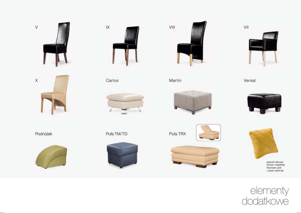 V IX VIII VII X Carlos Martin Versal Podnóżek Pufa TM/TD Pufa TRX poduszki skórzane złożone z kawałków, tkaninowe szyte z całości materiału elementy dodatkowe wer.2-10/11 obicie V VII VIII IX X Pod- Pufa Pufa PoCarlos Martin Versal nóżek TM/TD TRX duszki różnice skóra/tkanina • tkaniny (wzorzyste) • możliwość łączenia (skóra/tkanina) • • bycast • • • • • • charakterystyka mebla • miękki • • średnio miękki twardy • • • • • • • • • • • • • • • • nóżki drewniane • • plastikowe • • • metalowe funkcje • ruchome elementy V 46 x 58 x 110 IX 46 x 44 x 96 VIII 46 x 44 x 106 VII 59 x 60 x 87 X 42 x 60 x 95 Carlos 68 x 68 x 45 Martin 70 x 70 x 42 Versal 60 x 60 x 40 Podnóżek Pufa TM/TD Pufa TRX 60 x 60 x 40 TM 50 x 50 x 40 / TD 60 x 60 x 40 122 x 68 x 46 - 97 poduszki skórzane złożone z kawałków, tkaninowe szyte z całości materiału elementy dodatkowe