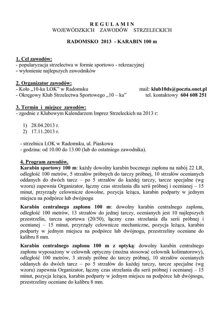 REGULAMIN WOJEWÓDZKICH ZAWODÓW STRZELECKICH RADOMSKO 2013 - KARABIN 100 m 1. Cel zawodów: - popularyzacja strzelectwa w formie sportowo - rekreacyjnej - wyłonienie najlepszych zawodników 2. Organizator zawodów: - Koło „10-ka LOK” w Radomsku - Okręgowy Klub Strzelectwa Sportowego „10 – ka” mail: [email protected] tel. kontaktowy 604 608 251 3. Termin i miejsce zawodów: - zgodnie z Klubowym Kalendarzem Imprez Strzeleckich na 2013 r: 1) 28.04.2013 r. 2) 17.11.2013 r. - strzelnica LOK w Radomsku, ul. Piaskowa - godzina: od 10.00 do 13.00 (lub do ostatniego zawodnika). 4. Program zawodów. Karabin sportowy 100 m: każdy dowolny karabin bocznego zapłonu na nabój 22 LR, odległość 100 metrów, 5 strzałów próbnych do tarczy próbnej, 10 strzałów ocenianych oddanych do dwóch tarcz – po 5 strzałów do każdej tarczy, tarcze specjalne (wg wzoru) zapewnia Organizator, łączny czas strzelania dla serii próbnej i ocenianej – 15 minut, przyrządy celownicze dowolne, pozycja leżąca, karabin podparty w jednym miejscu na podpórce lub dwójnogu Karabin centralnego zapłonu 100 m: dowolny karabin centralnego zapłonu, odległość 100 metrów, 13 strzałów do jednej tarczy, ocenianych jest 10 najlepszych przestrzelin, tarcza sportowa (20/50), łączny czas strzelania dla serii próbnej i ocenianej – 15 minut, przyrządy celownicze mechaniczne, pozycja leżąca, karabin podparty w jednym miejscu na podpórce lub dwójnogu, przestrzeliny oceniane do kalibru 8 mm. Karabin centralnego zapłonu 100 m z optyką: dowolny karabin centralnego zapłonu wyposażony w celownik optyczny (można stosować celownik kolimatorowy), odległość 100 metrów, 3 strzały próbne do tarczy próbnej, 10 strzałów ocenianych oddanych do dwóch tarcz – po 5 strzałów do każdej tarczy, tarcze specjalne (wg wzoru) zapewnia Organizator, łączny czas strzelania dla serii próbnej i ocenianej – 15 minut, pozycja leżąca, karabin podparty w jednym miejscu na podpórce lub dwójnogu, przestrzeliny oceniane do kalibru 8 mm. 5. Uczestnictwo: - zawodnicy indywidualni 6. Klasyfikacja: - klasyfikacja indywidualna w każdej konkurencji 7. Nagrody: - puchar dla najlepszego strzelca i okolicznościowe dyplomy dla 3 najlepszych zawodników w poszczególnych konkurencjach 8. Zgłoszenia: - przed zawodami lub w trakcie zawodów do godz. 12.30 9. Koszty uczestnictwa: - opłata startowa 20,00 zł za konkurencję Karabin sportowy 100 m - opłata startowa 35,00 zł za konkurencję Karabin centralnego zapłonu 100 m - opłata startowa 35,00 zł za konkurencję Karabin centralnego zapłonu 100 m z optyką - opłata startowa 15,00 zł w przypadku strzelania z własnej broni i amunicji 10. Sprawy różne: - każdy zawodnik zobowiązany jest do zapoznania się z niniejszym regulaminem oraz z przepisami bezpieczeństwa obowiązującymi w strzelectwie sportowym – znajomość powyższych przepisów potwierdzana jest podpisem na liście startowej - dla wszystkich konkurencji obowiązuje 5 minutowy czas na przygotowanie do strzelania - obowiązuje stosowanie wskaźników bezpieczeństwa (rozładowania broni) - na stanowisku strzeleckim zawodnik powinien posiadać właściwą dla danej konkurencji ilość amunicji - w zawodach zezwala się na kilkakrotny start w każdej konkurencji (tylko w przypadku wystarczającej ilości czasu pozostałego do zakończenia zawodów) – do klasyfikacji zalicza się najwyższy wynik - przygotowanie techniczne i organizacyjne zawodów (strzelań) według ustaleń Organizatora - sędziowie prowadzący zawody oraz inne osoby funkcyjne mogą uczestniczyć w zawodach - w sprawach nieuregulowanych niniejszym regulaminem obowiązują przepisy PZSS - Organizator zastrzega sobie prawo do zmian w niniejszym regulaminie - interpretacja niniejszego regulaminu oraz decydujące zdanie należy do Organizatora Organizatorzy