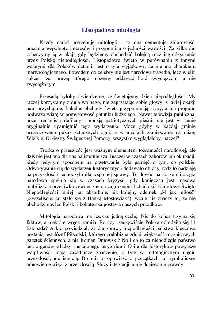 Listopadowa mitologia KaŜdy naród potrzebuje mitologii - to ona cementuje zbiorowość, umacnia wspólnotę interesów i przypomina o jedności wartości. Za kilka dni zobaczymy ją w akcji, gdy będziemy obchodzić kolejną rocznicę odzyskania przez Polskę niepodległości. Listopadowe święto w porównaniu z innymi waŜnymi dla Polaków datami, jest o tyle wyjątkowe, Ŝe nie ma charakteru martyrologicznego. Powodem do celebry nie jest narodowa tragedia, lecz wielki sukces, za sprawą którego moŜemy oddawać hołd zwycięzcom, a nie zwycięŜonym. Przesadą byłoby stwierdzenie, Ŝe świętujemy dzień niepodległości. My raczej korzystamy z dnia wolnego, nie zaprzątając sobie głowy, z jakiej okazji nam przysługuje. Lokalne obchody święta przypominają stypy, a ich program podwaŜa wiarę w pomysłowość gatunku ludzkiego. Nawet telewizja publiczna, poza transmisją defilady i emisją patriotycznych pieśni, nie jest w stanie oryginalnie upamiętnić tego wydarzenia. MoŜe gdyby w kaŜdej gminie organizowano pokaz sztucznych ogni, a w mediach zamieszanie na miarę Wielkiej Orkiestry Świątecznej Pomocy, wszystko wyglądałoby inaczej? Troska o przeszłość jest waŜnym elementem toŜsamości narodowej, ale dziś nie jest ona dla nas najistotniejsza. Inaczej w czasach zaborów lub okupacji, kiedy jedynym sposobem na przetrwanie była pamięć o tym, co polskie. Odwoływanie się do wydarzeń historycznych dodawało otuchy, rodziło nadzieję na przyszłość i jednoczyło dla wspólnej sprawy. To dowód na to, Ŝe mitologia narodowa spełnia się w czasach kryzysu, gdy konieczna jest masowa mobilizacja przeciwko zewnętrznemu zagroŜeniu. I choć dziś Narodowe Święto Niepodległości mniej nas absorbuje, niŜ kolejny odcinek „M jak miłość” (słyszeliście, co stało się z Hanką Mostowiak?), wcale nie znaczy to, Ŝe nie obchodzi nas los Polski i bohaterska postawa naszych przodków. Mitologia narodowa ma jeszcze jedną cechę. Nie do końca trzyma się faktów, a niektóre wręcz pomija. Bo czy rzeczywiście Polska odrodziła się 11 listopada? A kto powiedział, Ŝe dla sprawy niepodległości państwa kluczową postacią jest Józef Piłsudski, którego podobizna zdobi większość rocznicowych gazetek ściennych, a nie Roman Dmowski? No i co to za niepodległe państwo bez organów władzy i ustalonego terytorium? O ile dla historyków powyŜsze wątpliwości mają zasadnicze znaczenie, o tyle w mitologicznym ujęciu przeszłości, nie istnieją. Bo mit to opowieść o początkach, to symboliczne odnowienie więzi z przeszłością. SłuŜy integracji, a nie dociekaniu prawdy. M.