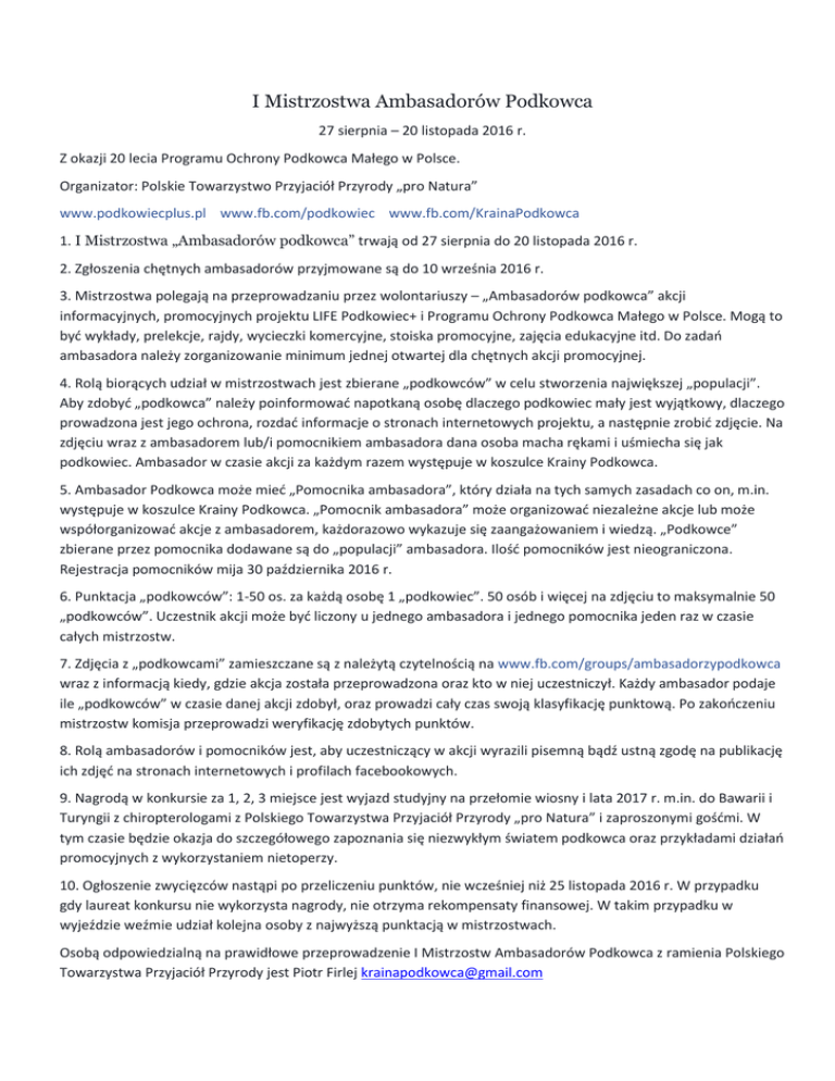 I Mistrzostwa Ambasadorów Podkowca 27 sierpnia – 20 listopada 2016 r. Z okazji 20 lecia Programu Ochrony Podkowca Małego w Polsce. Organizator: Polskie Towarzystwo Przyjaciół Przyrody „pro Natura” www.podkowiecplus.pl www.fb.com/podkowiec www.fb.com/KrainaPodkowca 1. I Mistrzostwa „Ambasadorów podkowca” trwają od 27 sierpnia do 20 listopada 2016 r. 2. Zgłoszenia chętnych ambasadorów przyjmowane są do 10 września 2016 r. 3. Mistrzostwa polegają na przeprowadzaniu przez wolontariuszy – „Ambasadorów podkowca” akcji informacyjnych, promocyjnych projektu LIFE Podkowiec+ i Programu Ochrony Podkowca Małego w Polsce. Mogą to byd wykłady, prelekcje, rajdy, wycieczki komercyjne, stoiska promocyjne, zajęcia edukacyjne itd. Do zadao ambasadora należy zorganizowanie minimum jednej otwartej dla chętnych akcji promocyjnej. 4. Rolą biorących udział w mistrzostwach jest zbierane „podkowców” w celu stworzenia największej „populacji”. Aby zdobyd „podkowca” należy poinformowad napotkaną osobę dlaczego podkowiec mały jest wyjątkowy, dlaczego prowadzona jest jego ochrona, rozdad informacje o stronach internetowych projektu, a następnie zrobid zdjęcie. Na zdjęciu wraz z ambasadorem lub/i pomocnikiem ambasadora dana osoba macha rękami i uśmiecha się jak podkowiec. Ambasador w czasie akcji za każdym razem występuje w koszulce Krainy Podkowca. 5. Ambasador Podkowca może mied „Pomocnika ambasadora”, który działa na tych samych zasadach co on, m.in. występuje w koszulce Krainy Podkowca. „Pomocnik ambasadora” może organizowad niezależne akcje lub może współorganizowad akcje z ambasadorem, każdorazowo wykazuje się zaangażowaniem i wiedzą. „Podkowce” zbierane przez pomocnika dodawane są do „populacji” ambasadora. Ilośd pomocników jest nieograniczona. Rejestracja pomocników mija 30 października 2016 r. 6. Punktacja „podkowców”: 1-50 os. za każdą osobę 1 „podkowiec”. 50 osób i więcej na zdjęciu to maksymalnie 50 „podkowców”. Uczestnik akcji może byd liczony u jednego ambasadora i jednego pomocnika jeden raz w czasie całych mistrzostw. 7. Zdjęcia z „podkowcami” zamieszczane są z należytą czytelnością na www.fb.com/groups/ambasadorzypodkowca wraz z informacją kiedy, gdzie akcja została przeprowadzona oraz kto w niej uczestniczył. Każdy ambasador podaje ile „podkowców” w czasie danej akcji zdobył, oraz prowadzi cały czas swoją klasyfikację punktową. Po zakooczeniu mistrzostw komisja przeprowadzi weryfikację zdobytych punktów. 8. Rolą ambasadorów i pomocników jest, aby uczestniczący w akcji wyrazili pisemną bądź ustną zgodę na publikację ich zdjęd na stronach internetowych i profilach facebookowych. 9. Nagrodą w konkursie za 1, 2, 3 miejsce jest wyjazd studyjny na przełomie wiosny i lata 2017 r. m.in. do Bawarii i Turyngii z chiropterologami z Polskiego Towarzystwa Przyjaciół Przyrody „pro Natura” i zaproszonymi gośdmi. W tym czasie będzie okazja do szczegółowego zapoznania się niezwykłym światem podkowca oraz przykładami działao promocyjnych z wykorzystaniem nietoperzy. 10. Ogłoszenie zwycięzców nastąpi po przeliczeniu punktów, nie wcześniej niż 25 listopada 2016 r. W przypadku gdy laureat konkursu nie wykorzysta nagrody, nie otrzyma rekompensaty finansowej. W takim przypadku w wyjeździe weźmie udział kolejna osoby z najwyższą punktacją w mistrzostwach. Osobą odpowiedzialną na prawidłowe przeprowadzenie I Mistrzostw Ambasadorów Podkowca z ramienia Polskiego Towarzystwa Przyjaciół Przyrody jest Piotr Firlej [email protected]