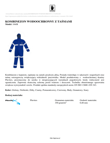 /oferta/Odzież wodoochronna standard/KOMBINEZON WODOOCHRONNY Z TAŚMAMI https://ajgroup-pros.pl/pl/offer/odziez-wodoochronna-standard/kombinezon-wodoochronny-z-tasmami-104-r.html/ KOMBINEZON WODOOCHRONNY Z TAŚMAMI Model: 104/R Kombinezon z kapurem, zapinany na zamek przykryty plisą. Posiada wiatrołapy w rękawach i nogawkach oraz taśmę ostrzegawczą zwiększającą widzialność pracownika. Model produkowany z wodoochronnej tkaniny Plavitex, przeznaczony do użytku w niesprzyjających warunkach pogodowych, kiedy widoczność jest ograniczona. Zapewnia skuteczną ochronę przed wiatrem i deszczem. Technika obustronnego zgrzewania zwiększa wytrzymałość szwów. Produkt spełnia standardy europejskich norm: EN ISO 13688 i EN 343. Kolor: Zielony, Niebieski, Żółty, Czarny, Pomarańczowy, Czerwony, Biały, Granatowy, Szary Rodzaj materiału: Plavitex Gramatura materiału: 350 gram/m² http://ajgroup.pl Grubość materiału: 0,48 mm Rozmiar: 48, 50, 52, 54, 56, 58, 60, 62 Tabela rozmiarów: S Rozmiar 48 Wzrost 164 Obwód 96-100 klat. piersiowej Obwód w 80-84 pasie M 50 170 100-104 L 52 176 104-108 L 54 176 108-112 XL 56 182 112-116 XXL 58 188 116-120 XXXL 60 194 120-124 XXXXL 62 198 124-128 80-84 84-88 84-88 88-92 92-96 96-100 96-100 Normy: Cechy specyficzne: EN ISO 13688 Odzież ochronna wymagania ogólne. EN 343 Odzież ochronna. Ochrona przed deszczem. -50ºC Produkt odporny na zginanie przy dużych ujemnych temperaturach. Obustronne zgrzewanie Kaptur Napy Taśma ostrzegawcza Taśma ostrzegawcza podwójna Wiatrołapy w nogawkach Wiatrołapy w rękawach Zamek przykryty plisą http://ajgroup.pl Powered by TCPDF (www.tcpdf.org)