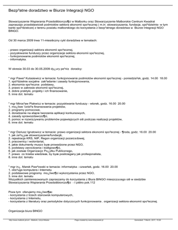 Bezp³atne doradztwo w Biurze Integracji NGO Stowarzyszenie Wspierania Przedsiêbiorczo¶ci w Malborku oraz Stowarzyszenie Malborskie Centrum Kwadrat zapraszaj± przedstawicieli podmiotów sektora ekonomii spo³ecznej ( m.in. stowarzyszenia, fundacje, spó³dzielnie- w tym banki spó³dzielcze) z terenu powiatu malborskiego do korzystania z bezp³atnego doradztwa w Biurze Integracji NGO BINGO. Od 30 marca 2009 trwa 11-miesiêczny cykl doradztwa w tematach: - prawo organizacji sektora ekonomii spo³ecznej, - pozyskiwanie funduszy przez organizacje sektora ekonomii spo³ecznej, - funkcjonowanie podmiotów ekonomii spo³ecznej, - informatyka. W okresie 30.03 do 30.05.2009 dy¿ury pe³ni± doradcy: " mgr Pawe³ Kulasiewicz w temacie: funkcjonowanie podmiotów ekonomii spo³ecznej - poniedzia³ek, godz. 14.00 18.00 1. spó³dzielnie socjalne zak³adanie i zasady funkcjonowania, 2. ekonomia spo³eczna podstawy, 3. prawo w zakresie ekonomii spo³ecznej, 4. dobre praktyki, projekty i ich finansowanie, 5. inne dot. tematu " mgr Miros³aw Plakwicz w temacie: pozyskiwanie funduszy - wtorek, godz. 16.00 20.00 1. mo¿liwe ¼ród³a finansowania projektów, 2. programy pomocowe, 3. doradzanie na etapie tworzenia aplikacji konkursowych, 4. zasady sprawozdawczo¶ci, 5. pomoc w rozwi±zywaniu problemów pojawiaj±cych siê podczas realizacji projektów, 6. inne dot. tematu " mgr Dariusz Ignatowicz w temacie: prawo organizacji sektora ekonomii spo³ecznej - ¶roda, godz. 16.00 20.00 1. jak za³o¿yæ stowarzyszenie/fundacjê, 2. rejestracja KRS, NIP, Regon organizacji pozarz±dowej, 3. pracownicy i wolontariat, 4. jakie dokumenty musz± byæ prowadzone przez NGO, 5. podstawy zarz±dzania i ksiêgowo¶ci, 6. jak zostaæ Organizacj± Po¿ytku Publicznego, 7. prawo co trzeba wiedzieæ, by byæ postrzegany jak profesjonalista, 8. inne dot. tematu " mgr in¿. Marek Paw³owski w temacie: informatyka - czwartek, godz. 16.00 20.00 1. obs³uga komputera i Internetu 2. podstawowe programy mo¿liwo¶ci wykorzystania przez NGO, 3. inne dot. tematu Wszystkich zainteresowanych zapraszamy do korzystania z Biura BINGO mieszcz±cego siê w siedzibie Stowarzyszenia Wspierania Przedsiêbiorczo¶ci - I piêtro pok.112 Poza tym oferujemy mo¿liwo¶æ: - korzystania z trzech stanowisk komputerowych, - korzystania z Internetu, - korzystania z literatury oraz periodyków dotycz±cych funkcjonowania . organizacji sektora ekonomii spo³ecznej. Organizacja biura BINGO http://www.malbork.pl/um/ - Malbork, Urz±d Miasta Page created by www.kraszewski.pl Generated: 7 March, 2017, 15:26 BINGO czynne bêdzie poniedzia³ki od 14.00 do 18.00, wtorki, ¶rody, czwartki od 16.00 do 20.00 W zwi±zku z prowadzonymi równolegle szkoleniami dla organizacji pozarz±dowych pn. ABC Organizacji Pozarz±dowych w pi±tki i soboty Biuro nie bêdzie czynne. Adres Biura BINGO Malbork, Aleja Wojska Polskiego 499 (I piêtro) Telefon (55) 272-02-02 e-mail: [email protected] Biuro Integracji Organizacji Pozarz±dowych BINGO to projekt realizowany przez Stowarzyszenie Wspierania Przedsiêbiorczo¶ci (lider) w partnerstwie z Malborskim Centrum KWADRAT (autor projektu). Projekt wspó³finansowany jest przez Uniê Europejsk±, z Europejskiego Funduszu Spo³ecznego - Priorytet VII: Promocja integracji spo³ecznej Dzia³anie 7.2 Przeciwdzia³anie wykluczeniu i wzmocnienie sektora ekonomii spo³ecznej, Poddzia³anie 7.2.2 Wsparcie ekonomii spo³ecznej. http://www.malbork.pl/um/ - Malbork, Urz±d Miasta Page created by www.kraszewski.pl Generated: 7 March, 2017, 15:26