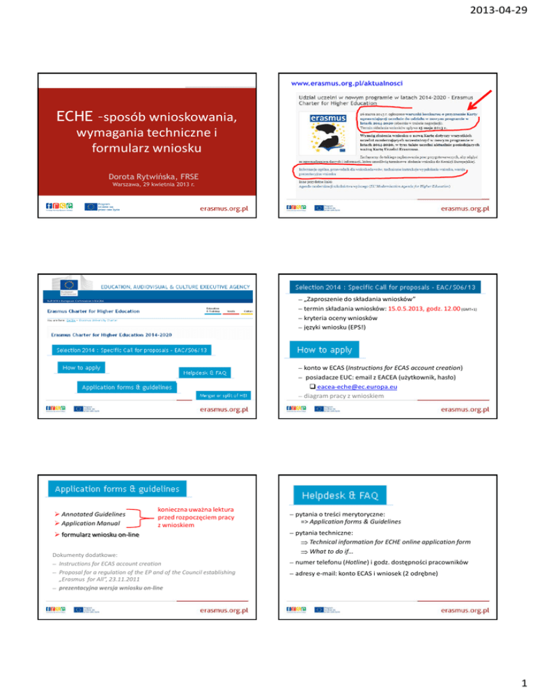 2013-04-29 www.erasmus.org.pl/aktualnosci ECHE –sposób wnioskowania, wymagania techniczne i formularz wniosku Dorota Rytwińska, FRSE Warszawa, 29 kwietnia 2013 r. „Zaproszenie do składania wniosków” termin składania wniosków: 15.0.5.2013, godz. 12.00 (GMT+1) kryteria oceny wniosków języki wniosku (EPS!) konto w ECAS (Instructions for ECAS account creation) posiadacze EUC: email z EACEA (użytkownik, hasło) [email protected] diagram pracy z wnioskiem Annotated Guidelines Application Manual konieczna uważna lektura przed rozpoczęciem pracy z wnioskiem formularz wniosku on-line Dokumenty dodatkowe: Instructions for ECAS account creation Proposal for a regulation of the EP and of the Council establishing „Erasmus for All”, 23.11.2011 prezentacyjna wersja wniosku on-line pytania o treści merytoryczne: => Application forms & Guidelines pytania techniczne: Technical information for ECHE online application form What to do if… numer telefonu (Hotline) i godz. dostępności pracowników adresy e-mail: konto ECAS i wniosek (2 odrębne) 1 2013-04-29 Konto ECAS Konto ECAS (2) email z KE potwierdzający utworzenie konta i linkiem do aktywacji konta (!!!90 minut od momentu wysłania maila przez KE) Wniosek ECHE Wniosek online ECHE (Label) widoczny dopiero po założeniu konta ECAS Wniosek ECHE (2) https://eacea.ec.europa.eu/ECHE/ nawigacja (Next, Previus, Save, Validate, Check all, Print, itp.) pytania zamknięte i otwarte (ograniczona liczba znaków) obowiązkowy załącznik Endorsement of the application (wypełniony i opatrzony podpisem prawnego przedstawiciela) wniosek składany wyłącznie drogą elektroniczną złożony wniosek nie podlega żadnym zmianom potwierdzenie złożenia wniosku Niezbędna nazwa użytkownika i hasło z maila EACEA 26.03.2013 wykorzystanie wniosku na potrzeby monitoringu Ogłoszenie wyników konkursu – pod koniec 2013 r. Wniosek ECHE (3) Formularz wniosku 2