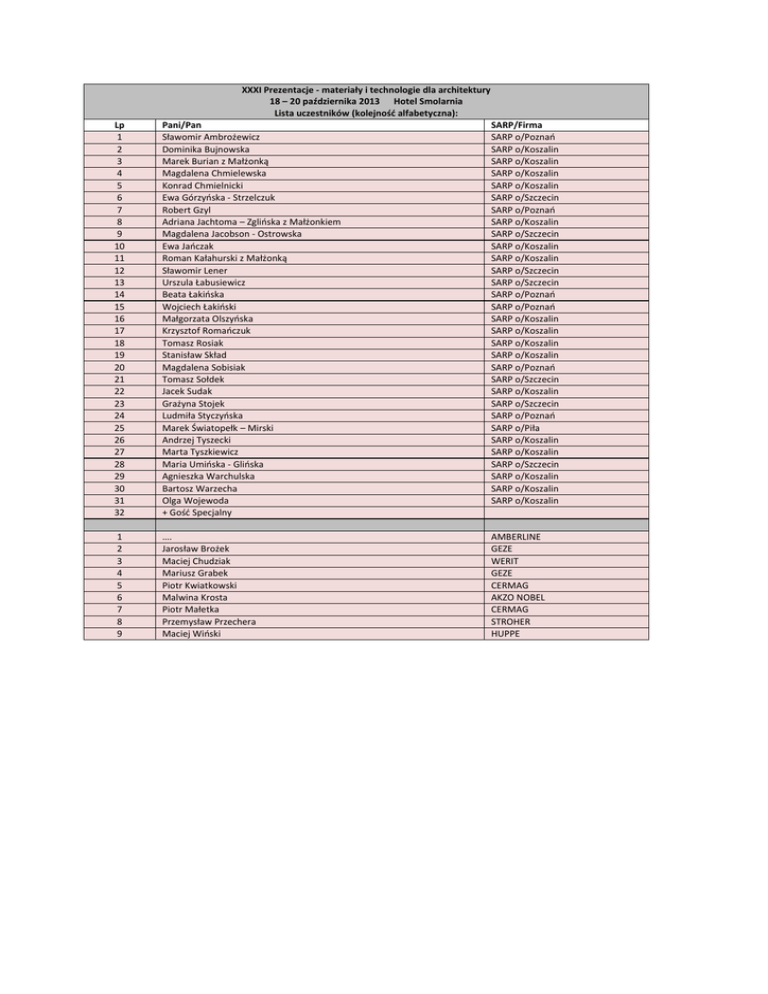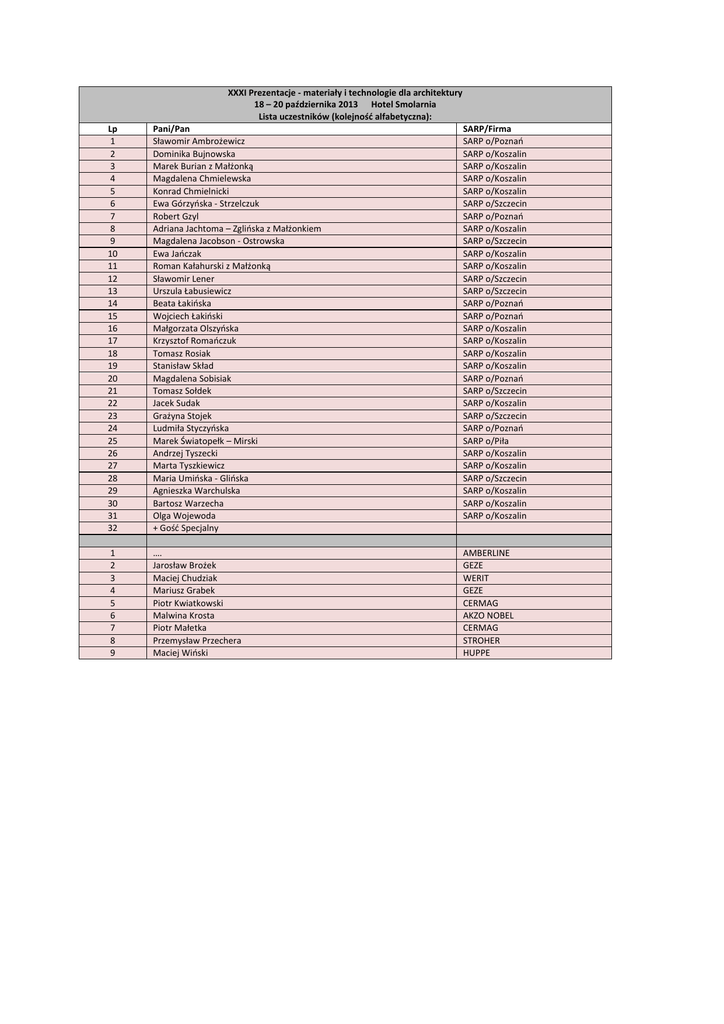XXXI Prezentacje ‐ materiały i technologie dla architektury 18 – 20 października 2013 Hotel Smolarnia Lista uczestników (kolejność alfabetyczna): Lp 1 2 3 4 5 6 7 8 9 10 11 12 13 14 15 16 17 18 19 20 21 22 23 24 25 26 27 28 29 30 31 32 1 2 3 4 5 6 7 8 9 Pani/Pan Sławomir Ambrożewicz Dominika Bujnowska Marek Burian z Małżonką Magdalena Chmielewska Konrad Chmielnicki Ewa Górzyńska ‐ Strzelczuk Robert Gzyl Adriana Jachtoma – Zglińska z Małżonkiem Magdalena Jacobson ‐ Ostrowska Ewa Jańczak Roman Kałahurski z Małżonką Sławomir Lener Urszula Łabusiewicz Beata Łakińska Wojciech Łakiński Małgorzata Olszyńska Krzysztof Romańczuk Tomasz Rosiak Stanisław Skład Magdalena Sobisiak Tomasz Sołdek Jacek Sudak Grażyna Stojek Ludmiła Styczyńska Marek Światopełk – Mirski Andrzej Tyszecki Marta Tyszkiewicz Maria Umińska ‐ Glińska Agnieszka Warchulska Bartosz Warzecha Olga Wojewoda + Gość Specjalny …. Jarosław Brożek Maciej Chudziak Mariusz Grabek Piotr Kwiatkowski Malwina Krosta Piotr Małetka Przemysław Przechera Maciej Wiński SARP/Firma SARP o/Poznań SARP o/Koszalin SARP o/Koszalin SARP o/Koszalin SARP o/Koszalin SARP o/Szczecin SARP o/Poznań SARP o/Koszalin SARP o/Szczecin SARP o/Koszalin SARP o/Koszalin SARP o/Szczecin SARP o/Szczecin SARP o/Poznań SARP o/Poznań SARP o/Koszalin SARP o/Koszalin SARP o/Koszalin SARP o/Koszalin SARP o/Poznań SARP o/Szczecin SARP o/Koszalin SARP o/Szczecin SARP o/Poznań SARP o/Piła SARP o/Koszalin SARP o/Koszalin SARP o/Szczecin SARP o/Koszalin SARP o/Koszalin SARP o/Koszalin AMBERLINE GEZE WERIT GEZE CERMAG AKZO NOBEL CERMAG STROHER HUPPE