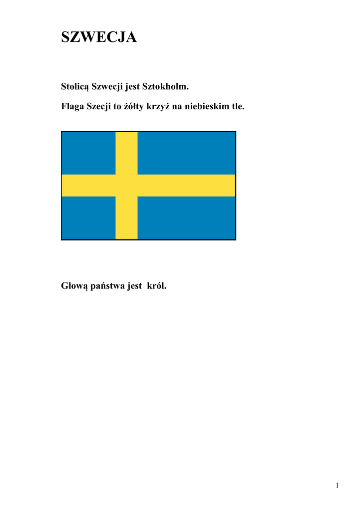 SZWECJA Stolicą Szwecji jest Sztokholm. Flaga Szecji to żółty krzyż na niebieskim tle. Głową państwa jest król. 1 Szwecja to kraj leżący w północnej części Europy na półwyspie Skandynawskim, nad Morzem Bałtyckim. Najwyższy szczyt to Kebnekaise. Stolica kraju, Sztokholm zwana jest Wenecją Północy. Woda stanowi 1/3 powierzchni miasta, a ponad 50 mostów łączy ze sobą 14 wysp i ląd, na którym miasto jest położone. Szwecja jest monarchią, a król Szwecji urzęduje w Pałacu Królewskim w Sztokholmie, natomiast mieszka wraz z rodziną w Pałacu Drottningholm na przedmieściach stolicy. W Szwecji 13 grudnia obchodzony jest Dzień Świętej Łucji – święto światła. Tego dnia odbywają się pochody dzieci w białych strojach, z przewodzącą orszakowi dziewczynką przybraną w wianek z płonącymi świecami. W pobliżu wsi Jukkasjärvi na północy Szwecji, w Laponii, co roku z wielkich lodowych bloków i śniegu budowany jest Hotel Lodowy. Bloki te wykuwa się z zamarzniętej rzeki Torne. Można spać w lodowych pokojach, wziąć ślub w lodowej kaplicy, obejrzeć lodowe rzeźby w lodowej galerii. W połowie kwietnia hotel spływa do rzeki, a w grudniu buduje się go od nowa. W XVII wieku Szwedzi najechali na Polskę, ten okres w naszej historii nazywamy Potopem Szwedzkim, słynna z tego okresu jest obrona Jasnej Góry. Znane są także powieści dla dzieci, które napisała Astryd Lindgren, a które zostały przetłumaczone na 80 języków. Dzieci z Bullerbyn, Pippi Pończoszarka, Ronja - córka zbójnika, Bracia Lwie Serce – to tylko niektóre tytuły jej autorstwa. 2 Kuchnia szwedzka oferuje niezbyt wyszukane dania, tradycyjnie charakteryzowała się używaniem bardzo dużych ilości cukru. Szwedzi słodzili prawie wszystko – ryby (śledzie), mięsa, pasztety, zupy a nawet chleb. Obecnie w kuchni nie stosuje się już tyle cukru, ale przyzwyczajenia i nawyki zostały – nadal słodkość wielu potraw szwedzkich może zaskoczyć niejednego. Popularnymi daniami są: kusa Janssona – zapiekanka z pokrojonych w cienkie plasterki ziemniaków, pokrojonej w talarki cebuli, a także filetów sardeli (anchois). Wszystko to zalane jest mlekiem zmieszanym ze świeżą śmietaną i zapieczone w piekarniku na złoty kolor, Flygande Jakob – pieczony kurczak z bananami, orzechami i sosem chilli, Köttbullar – kulki mięsne przyrządzane z mięsa wołowego lub wołowo-wieprzowego. Blodpudding – danie z krwi wieprzowej, mleka, mąki żytniej, smalcu, piwa lub syropu z przyprawami, Pyttipanna – drobno pokrojone ziemniaki, cebula i mięso, Surströmming – kiszony śledź o silnym, charakterystycznym zapachu sprzedawany w zalewie solnej w puszkach. 3